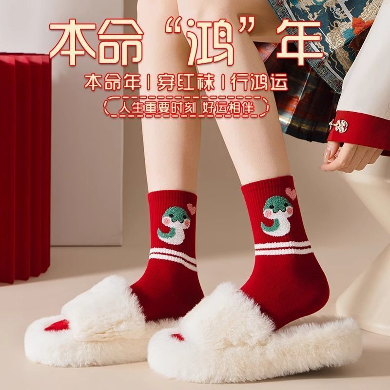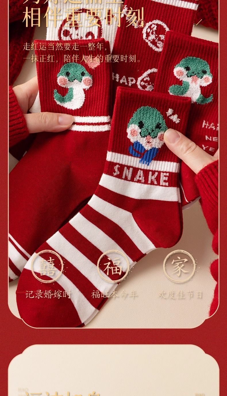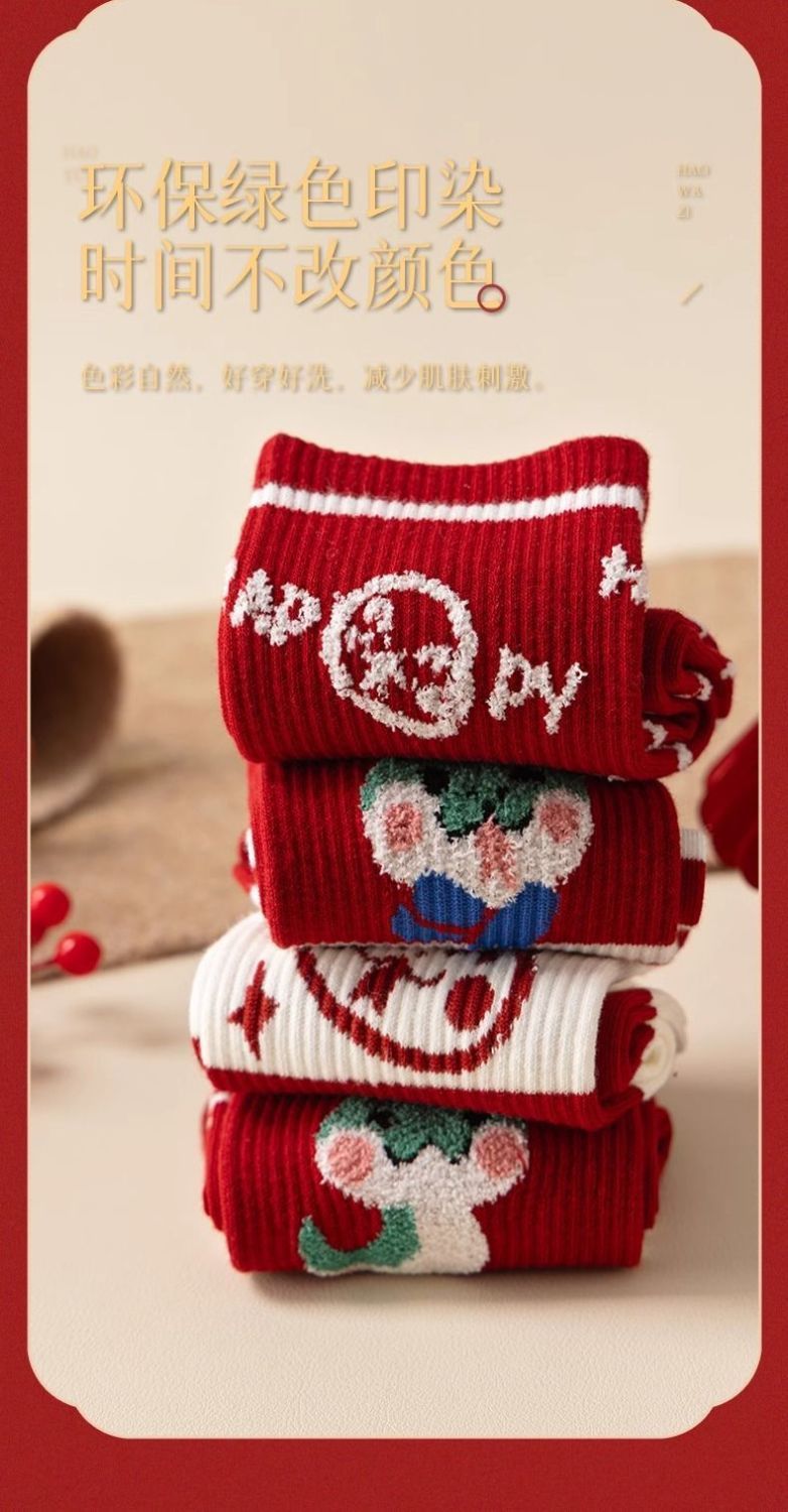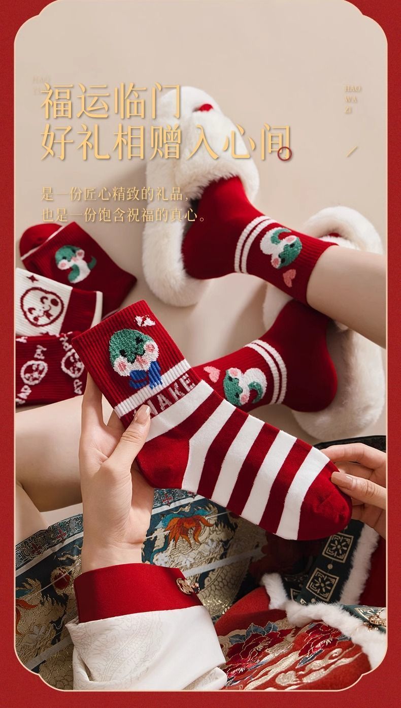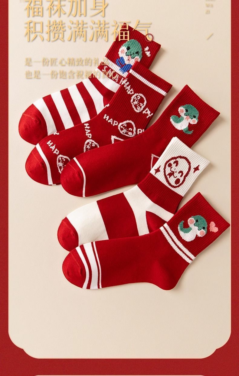 蛇年本命年大红运动袜子套装宿舍大花加厚款