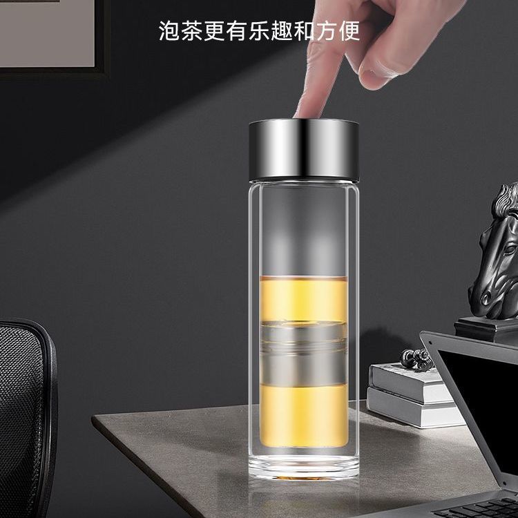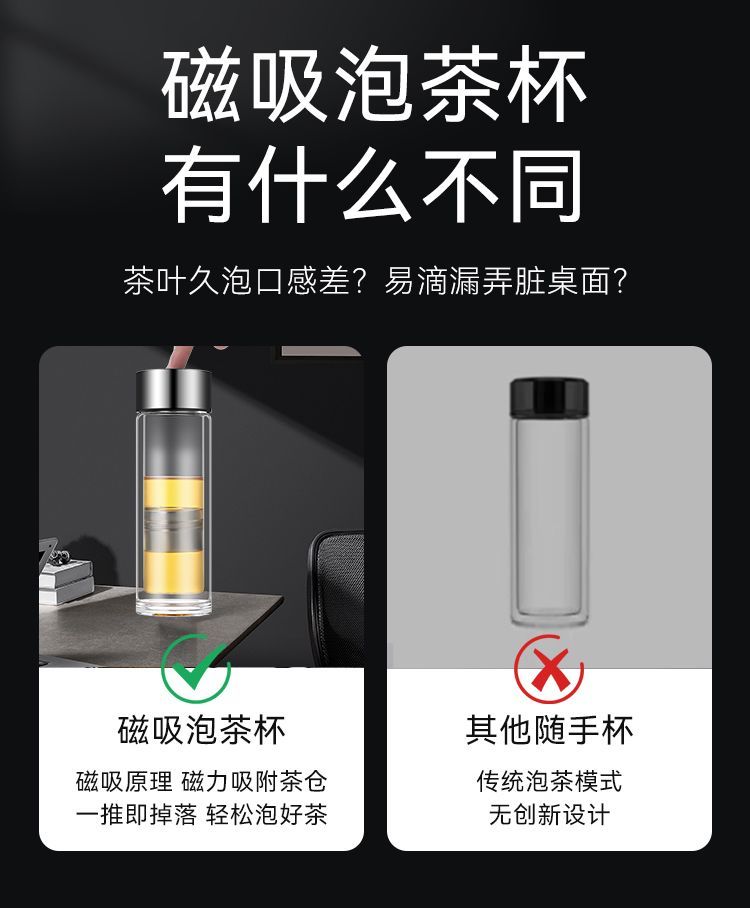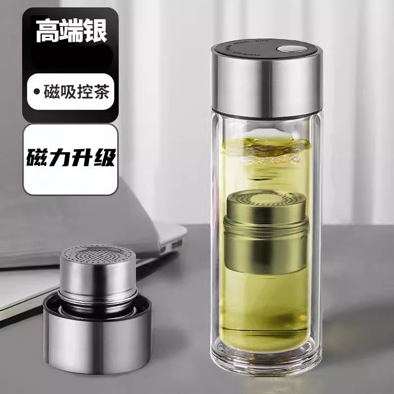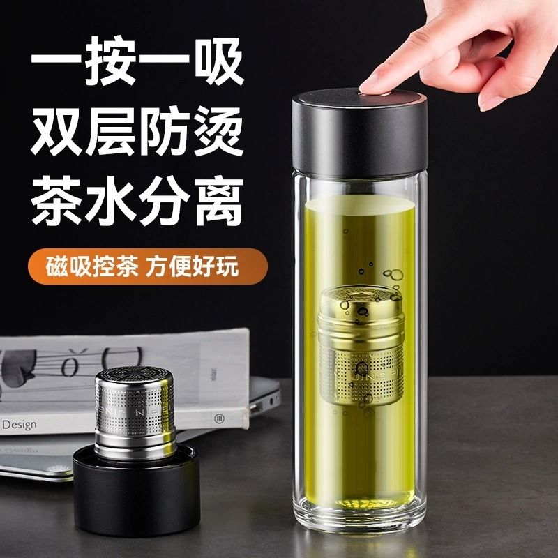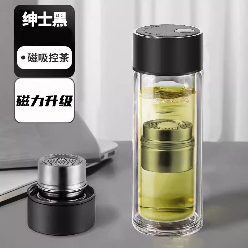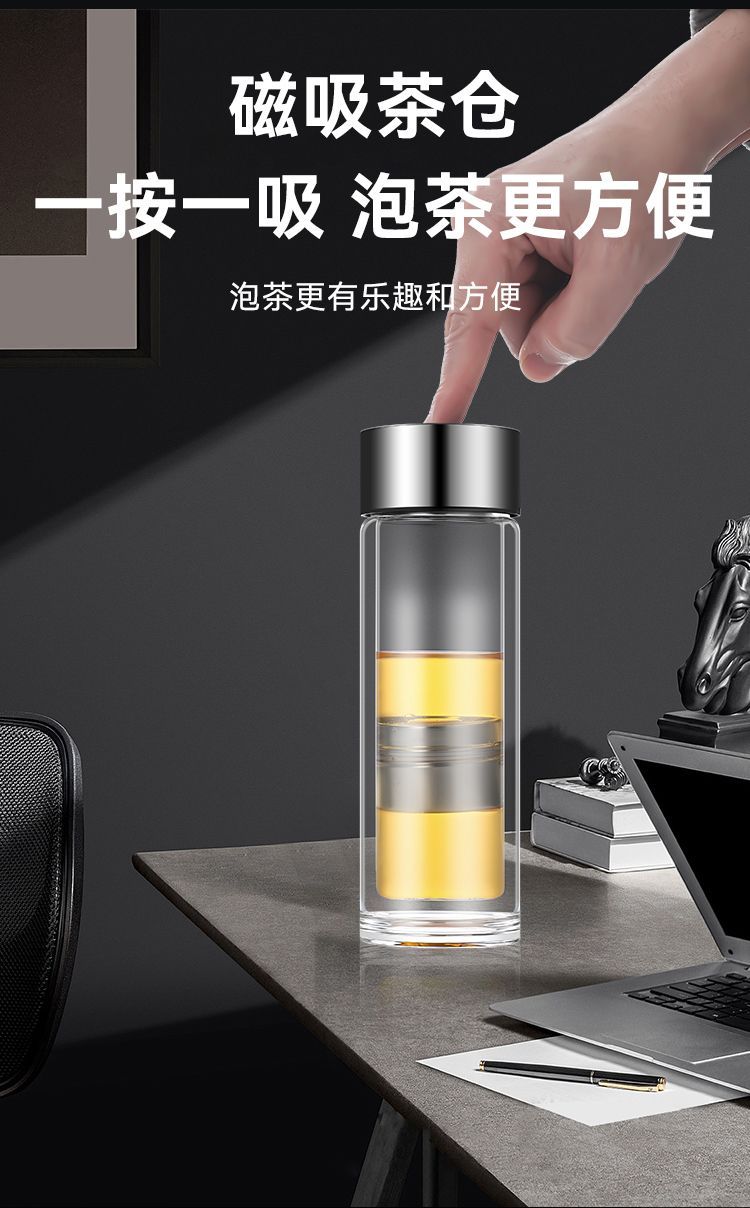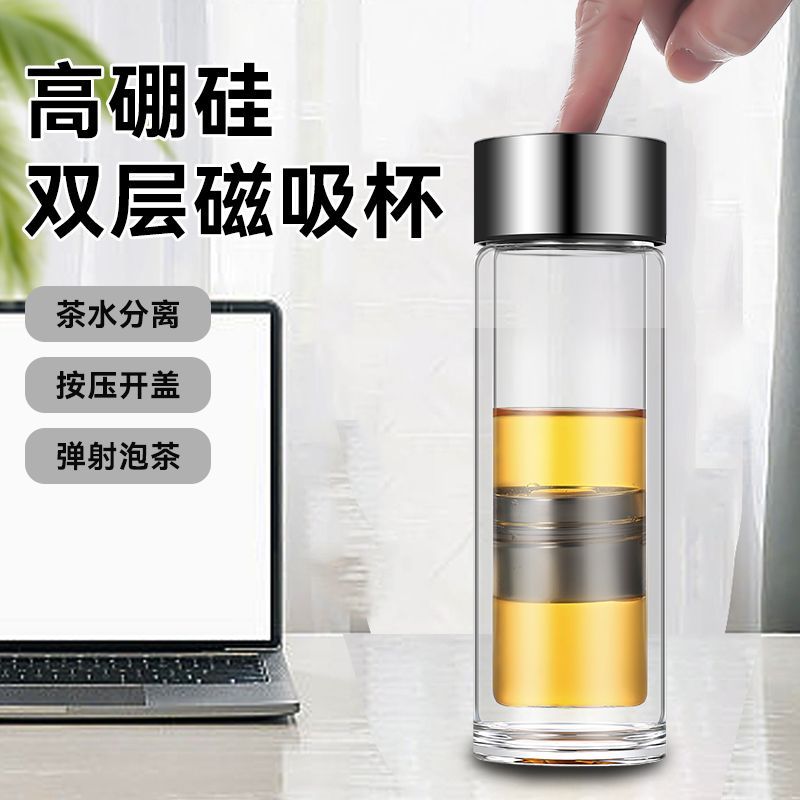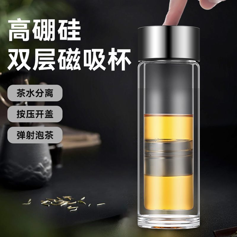 磁弹茶杯新款茶水高档分离水杯双层玻璃杯男士上班族便携耐高温