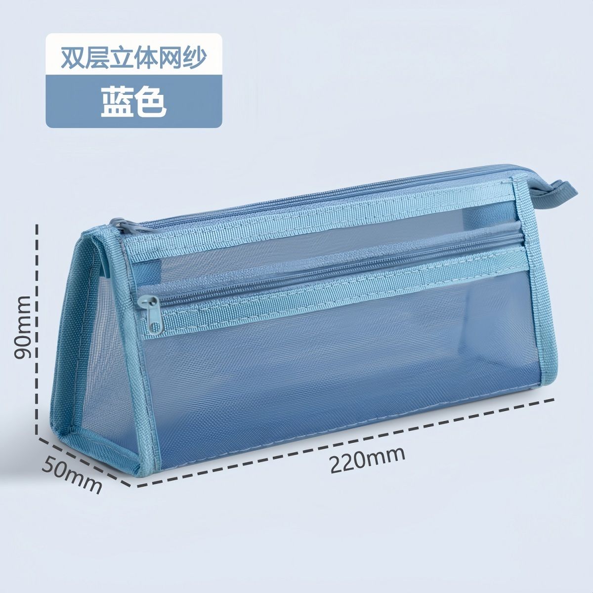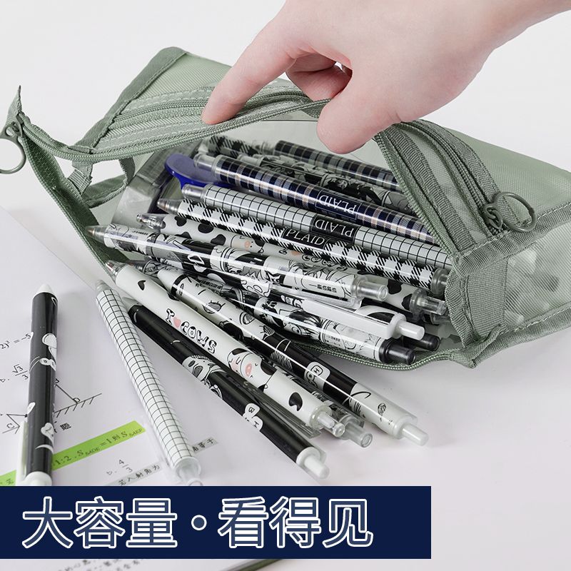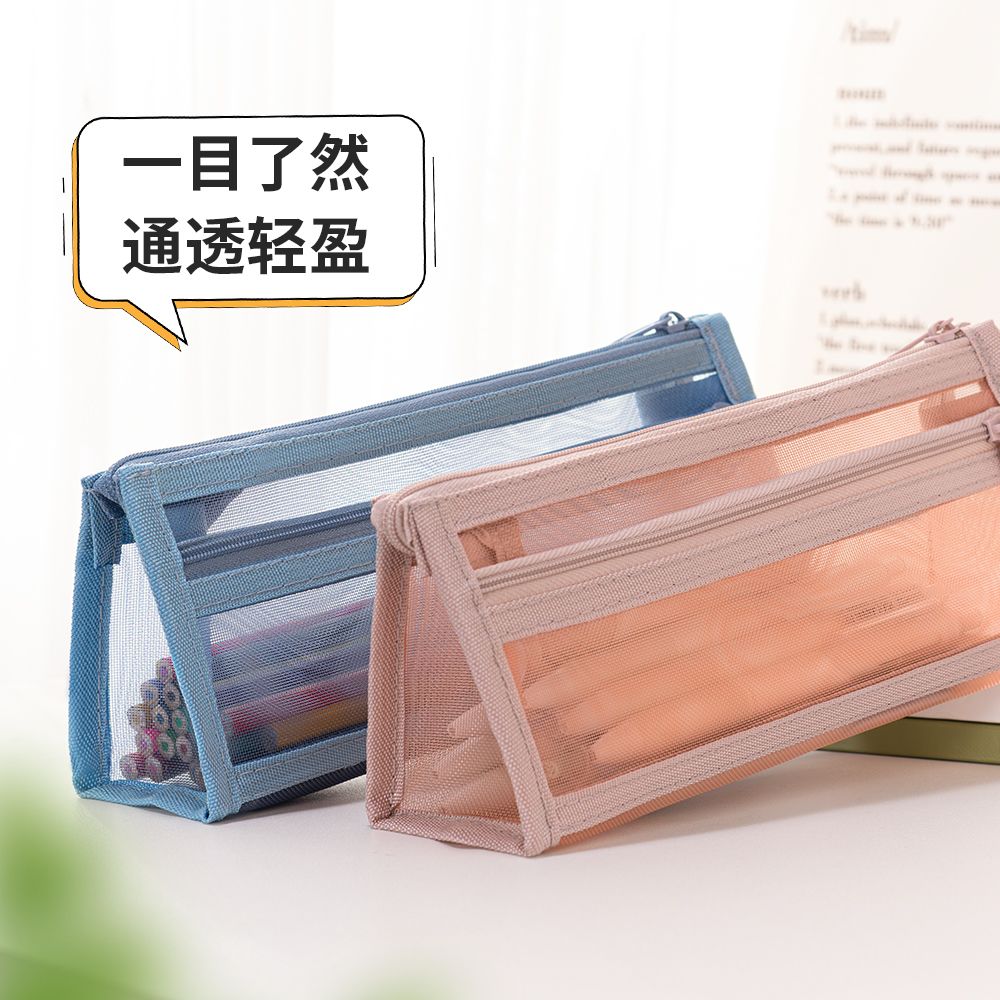莫兰迪笔袋ins风简约透明网纱双层大容量学生考试拉链文具收纳袋