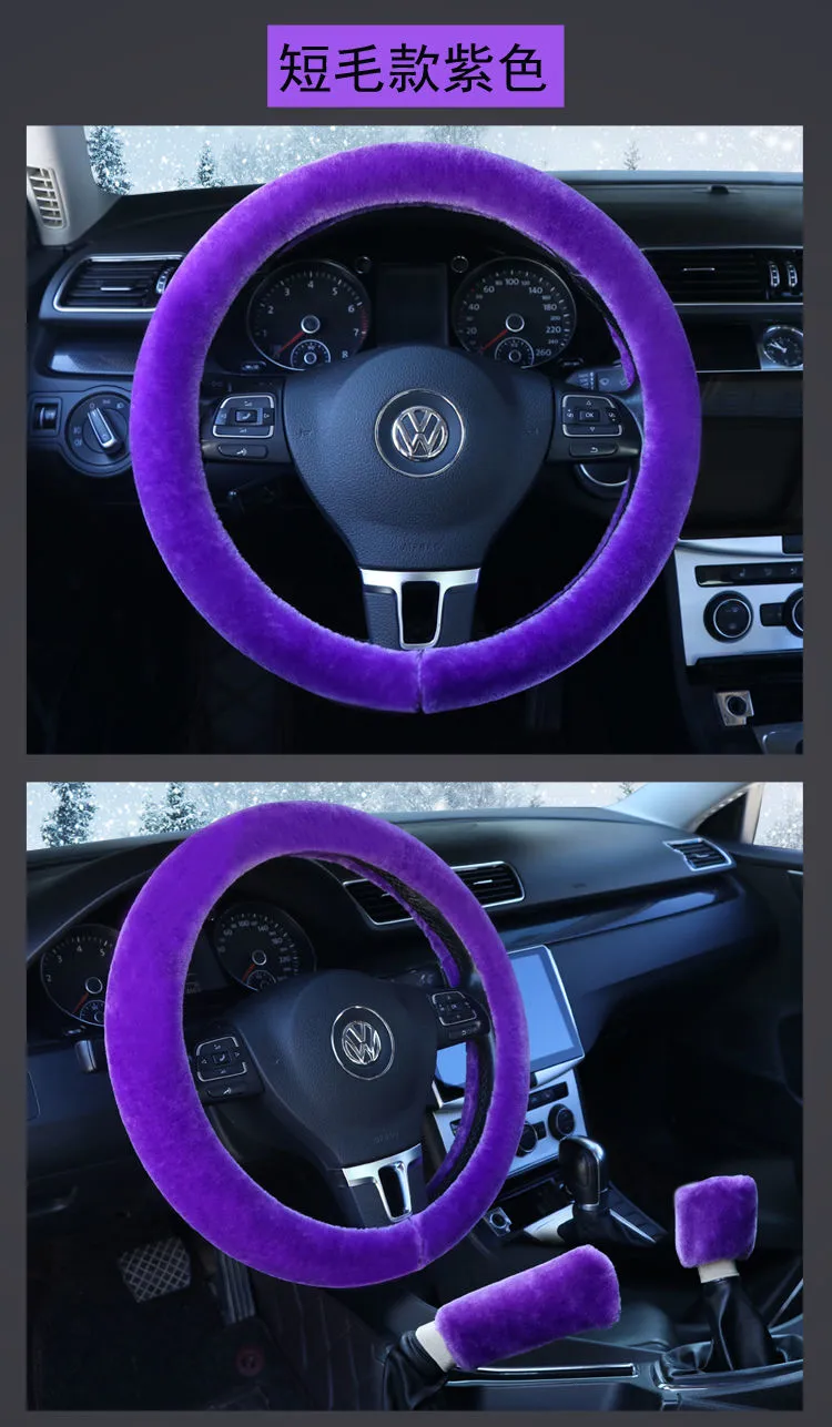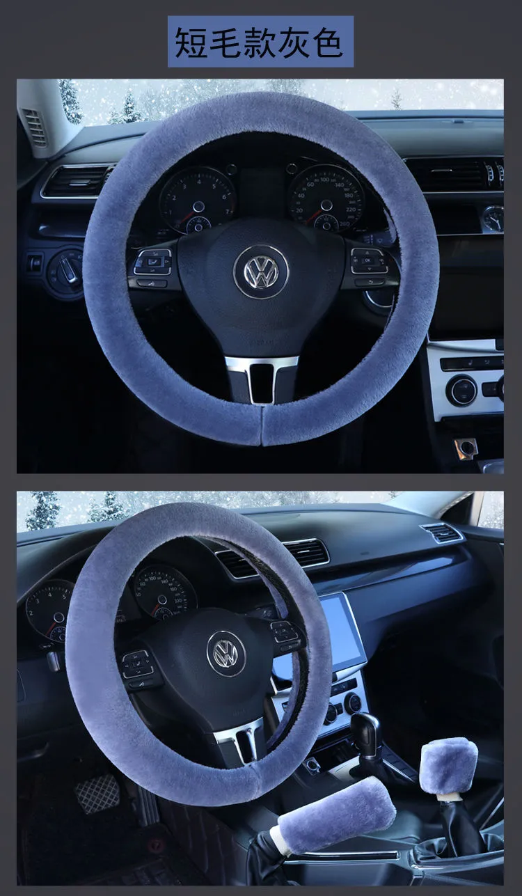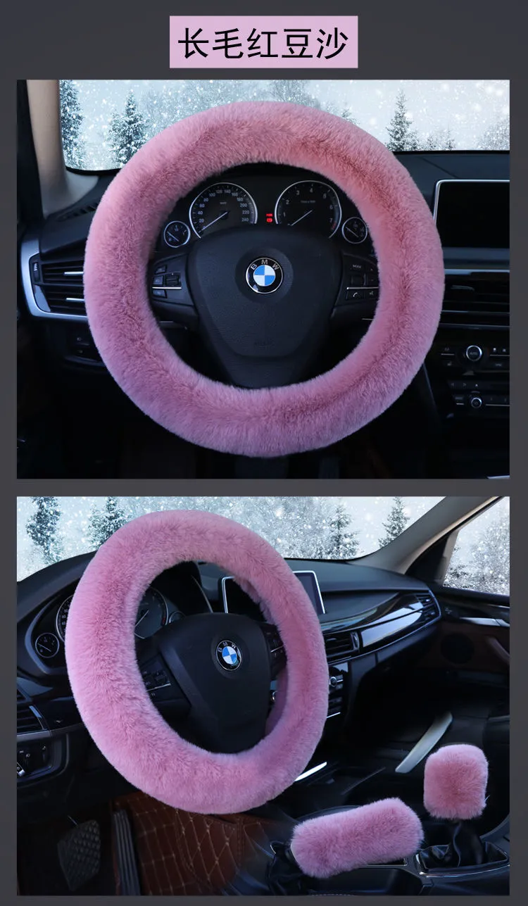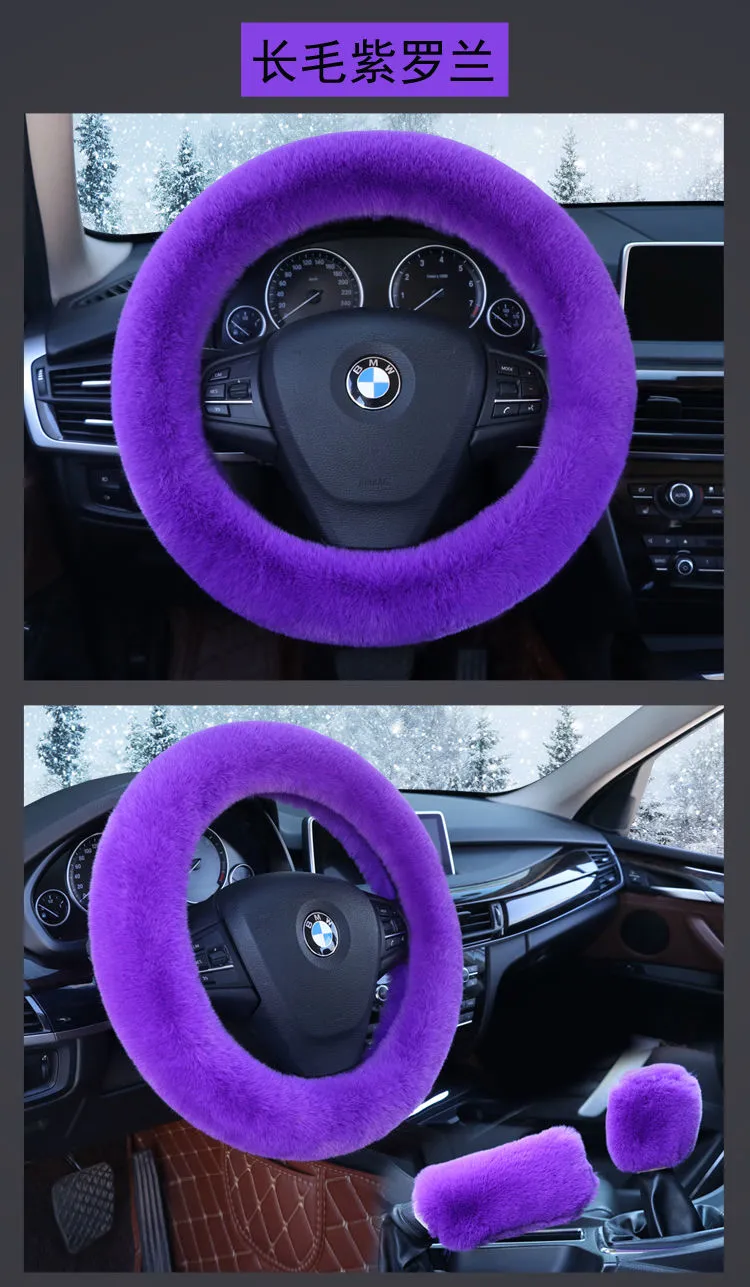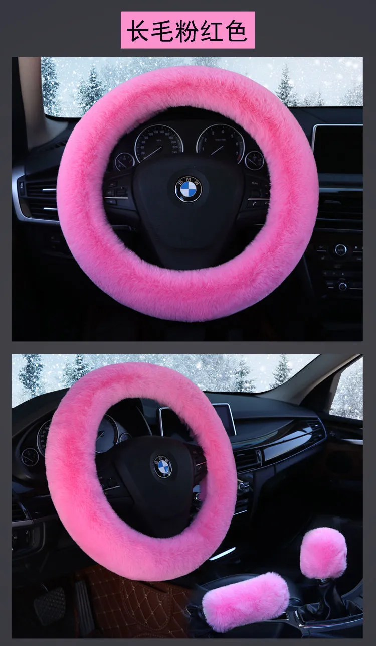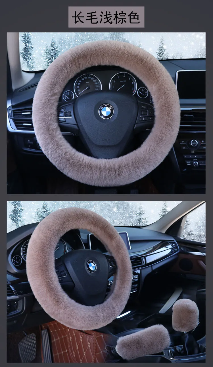 冬季长毛绒方向盘套男女新款保暖防滑汽车通用把套档位手刹三件套