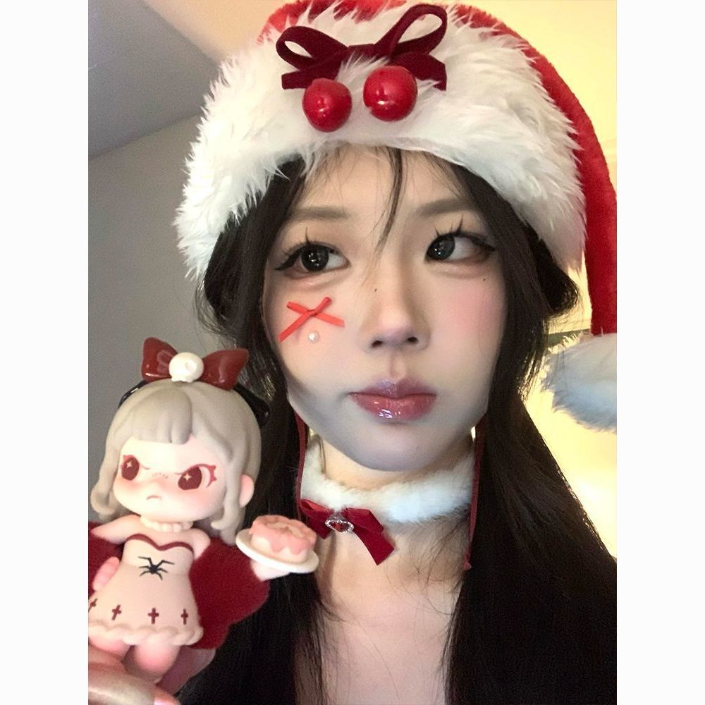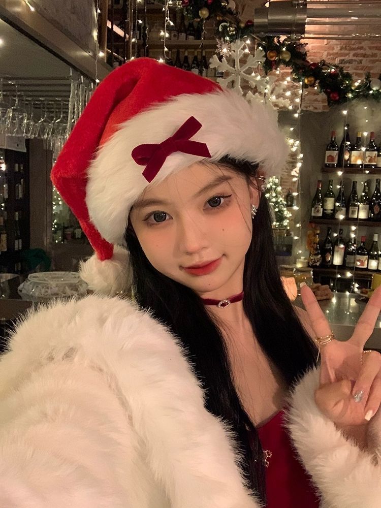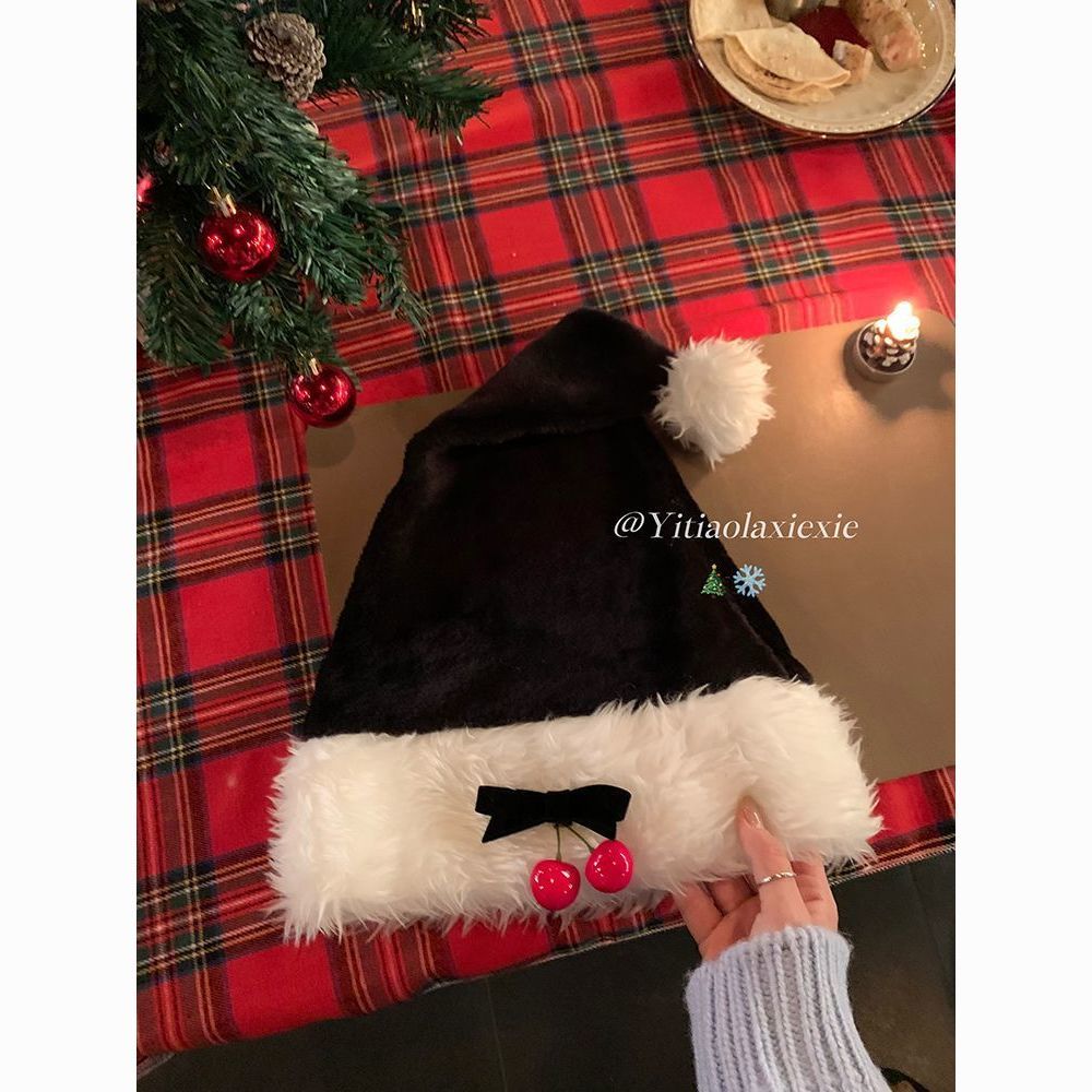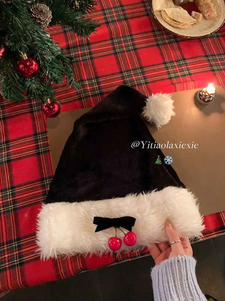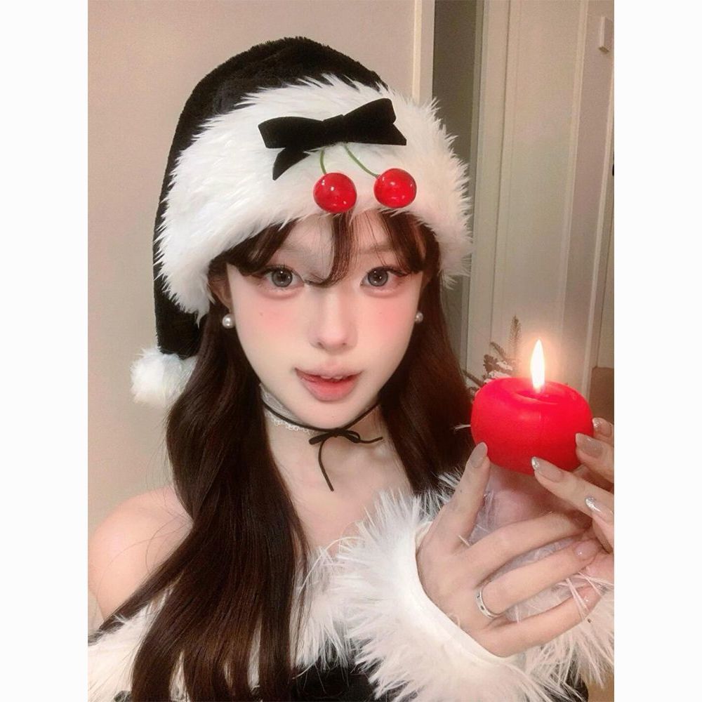 原创秋冬樱桃蝴蝶结毛绒圣诞老人帽圣诞节cos服装拍照头饰圣诞帽