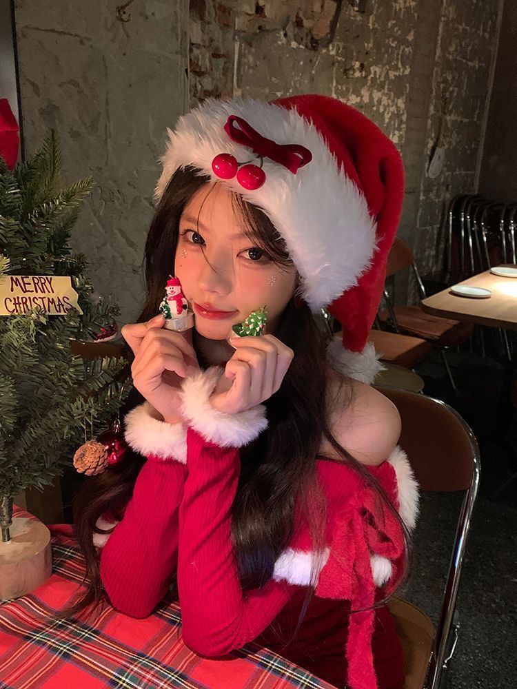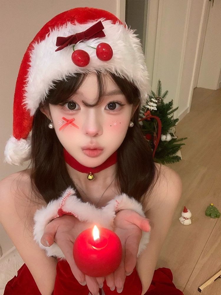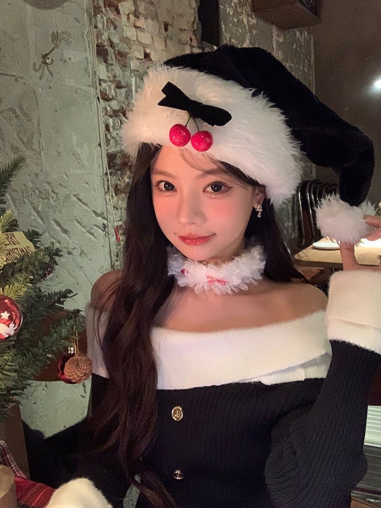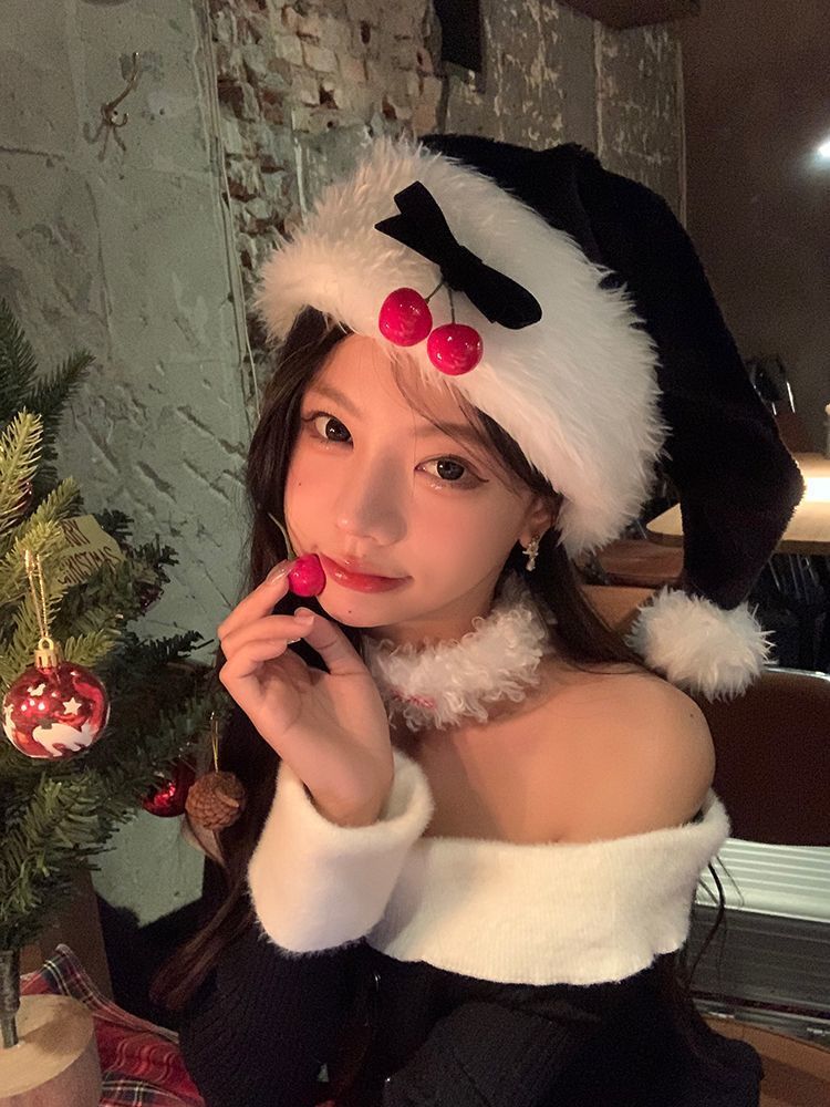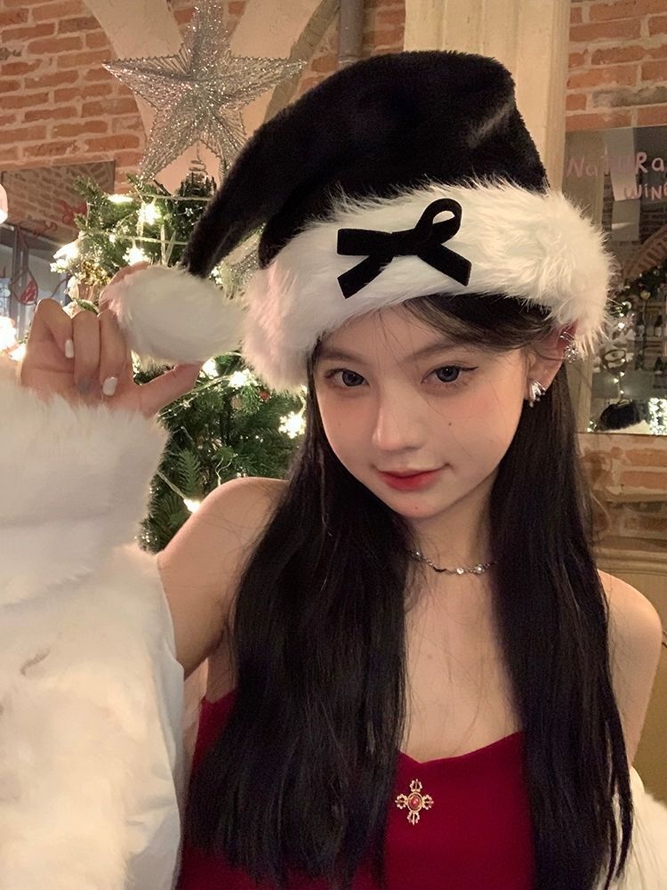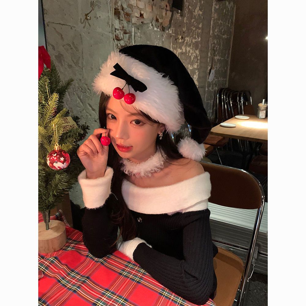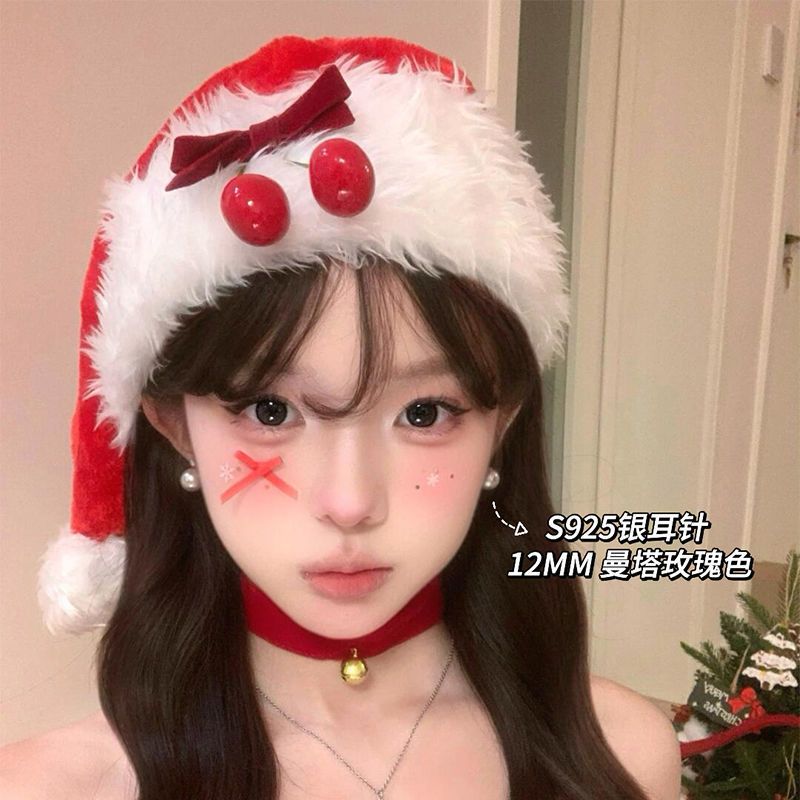 原创秋冬樱桃蝴蝶结毛绒圣诞老人帽圣诞节cos服装拍照头饰圣诞帽