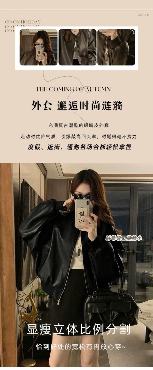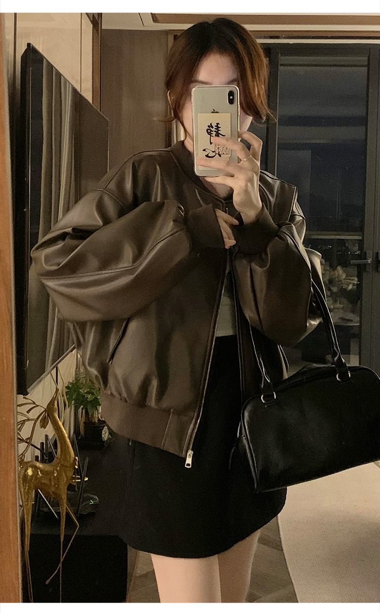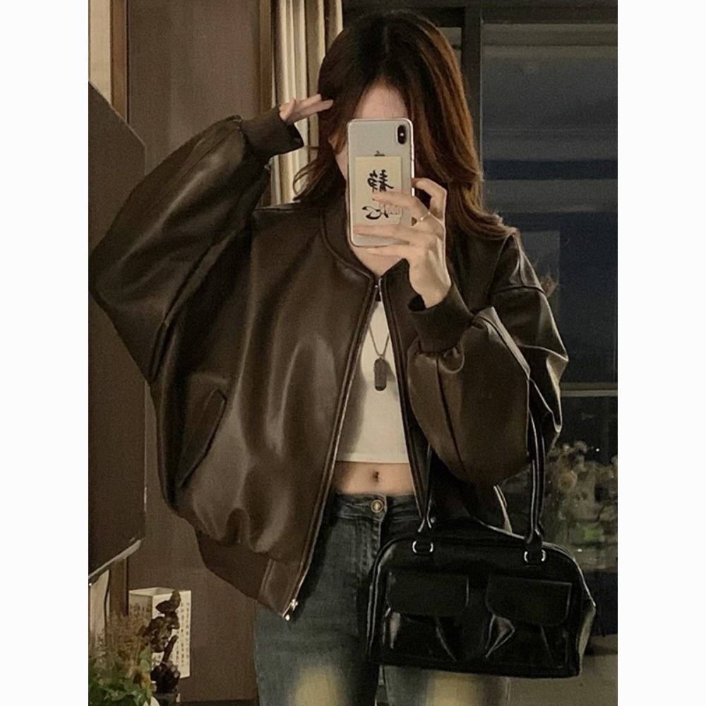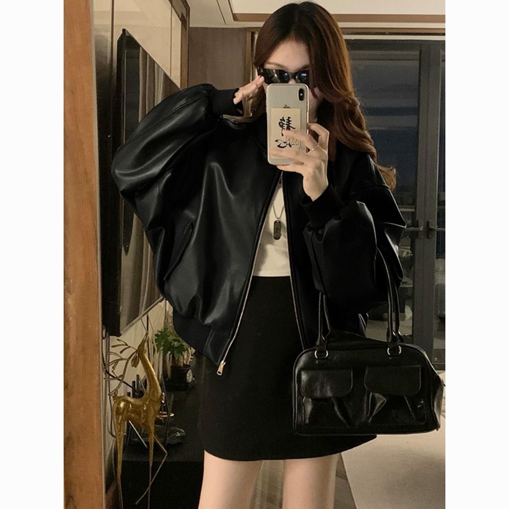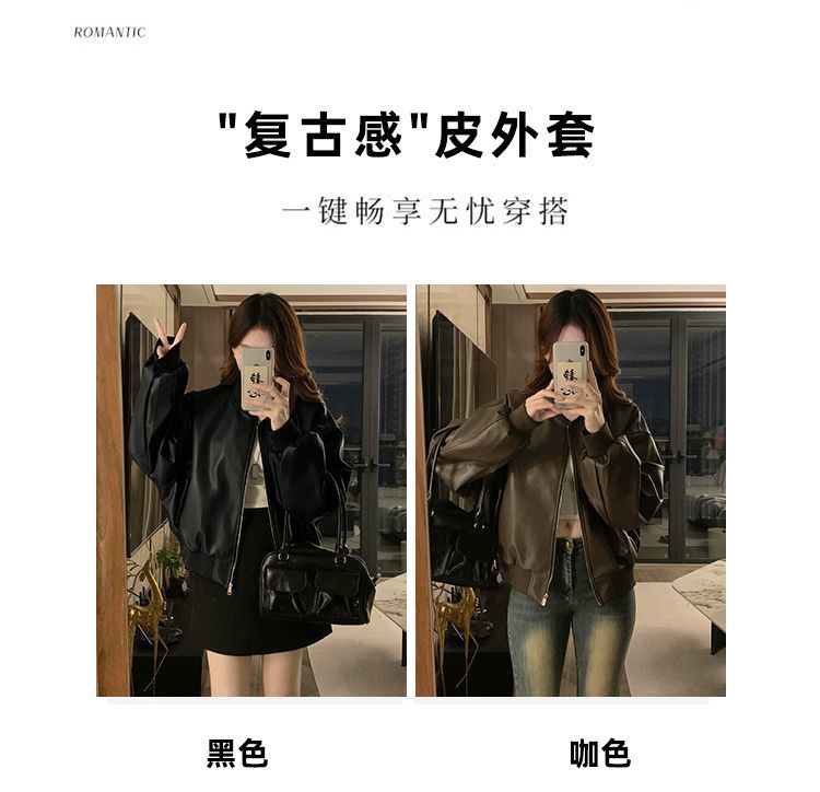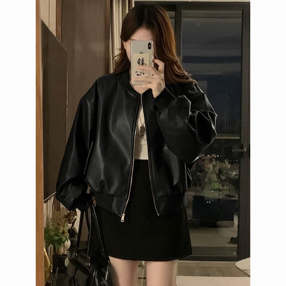 黑色复古廓形皮衣外套皮夹克女春季新款甜酷风机车服棒球服上衣潮