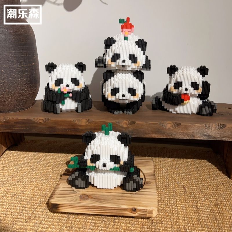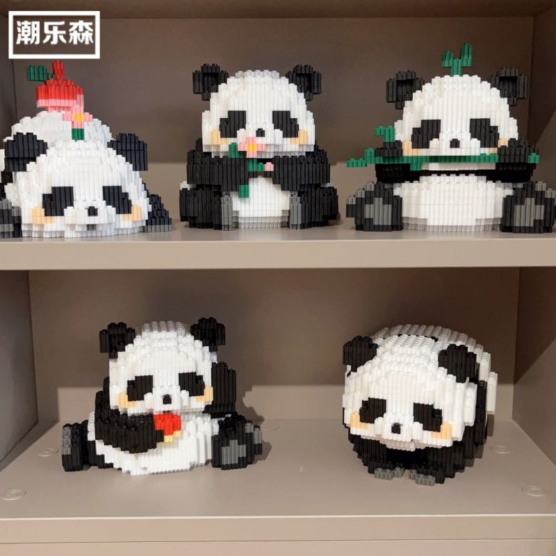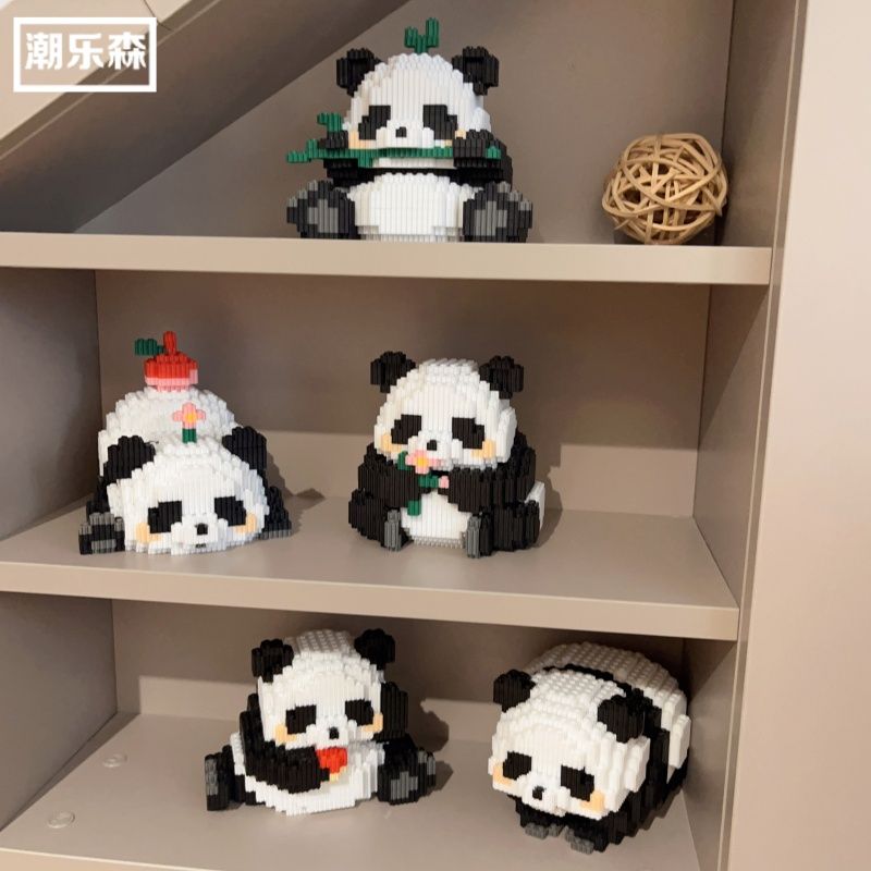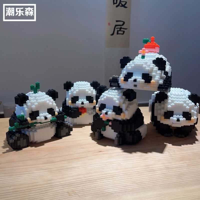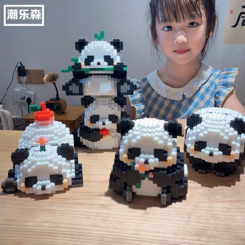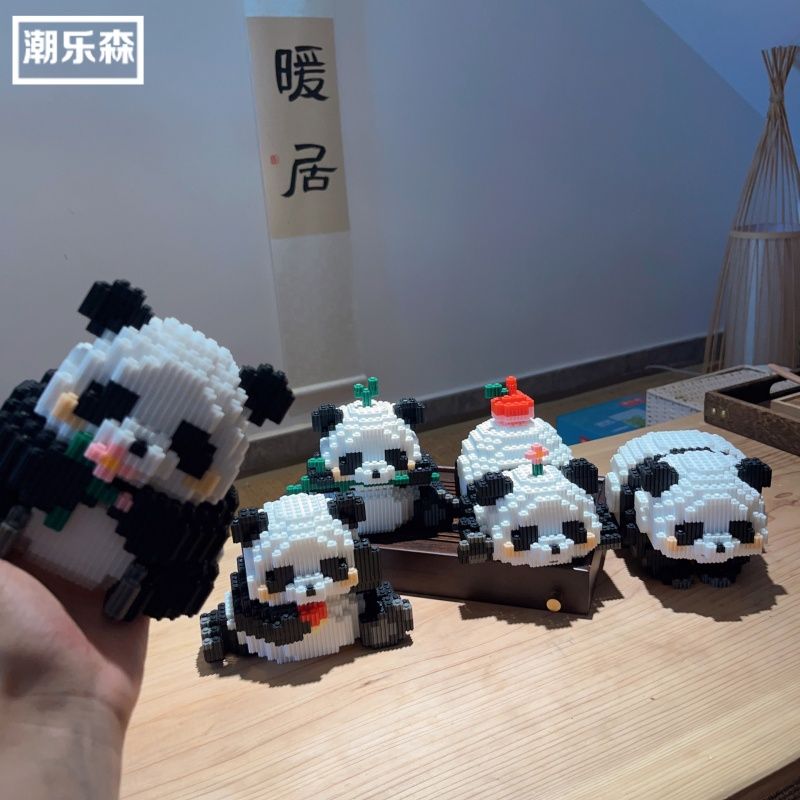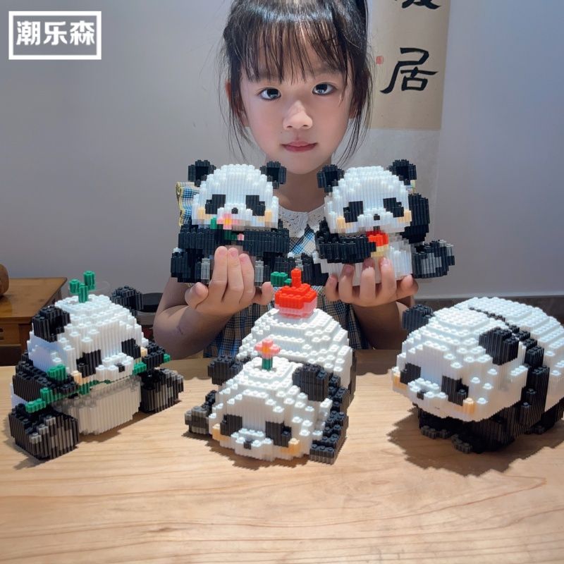 清仓超萌花花熊猫小颗粒兼容乐高积木玩具高难度摆件拼图女孩礼物