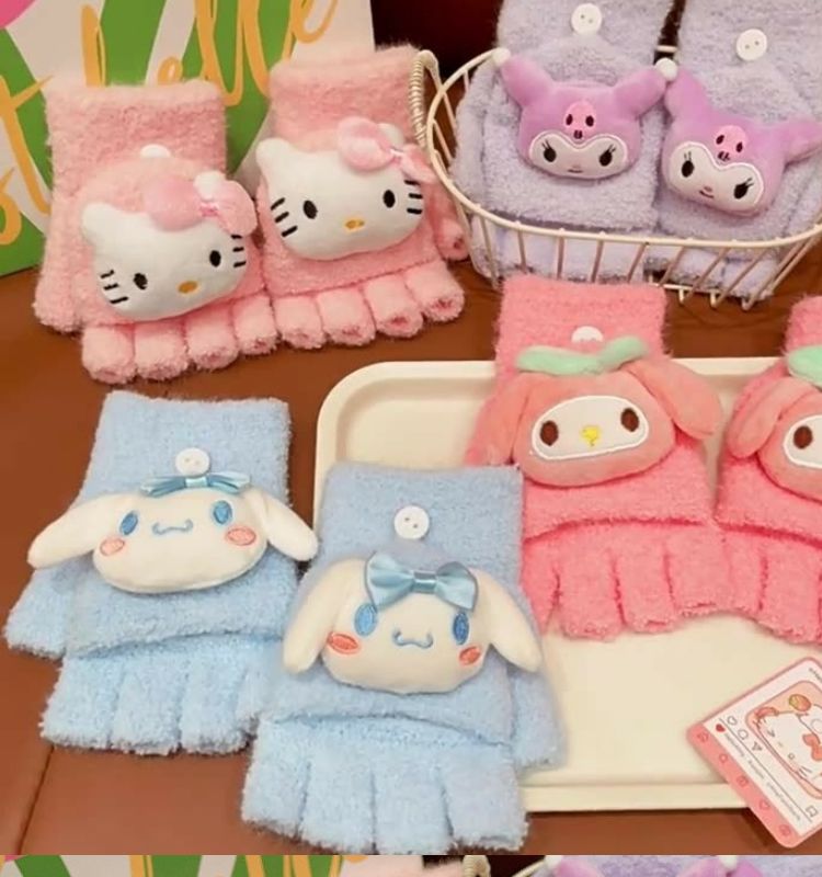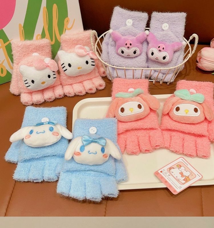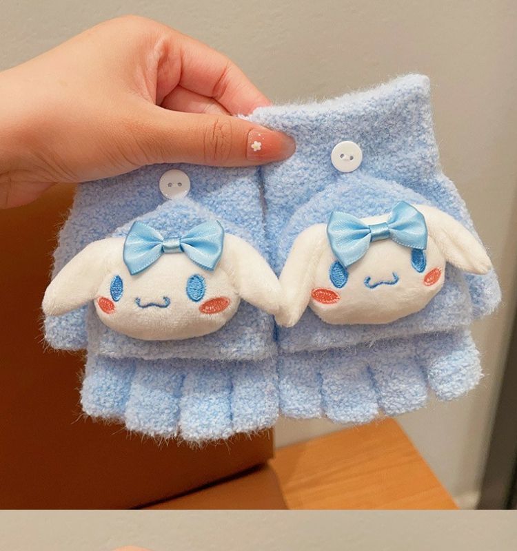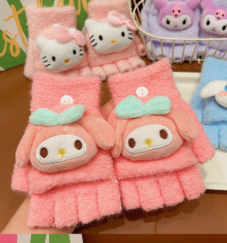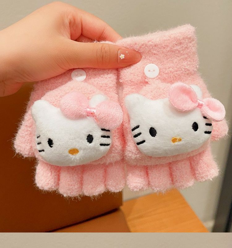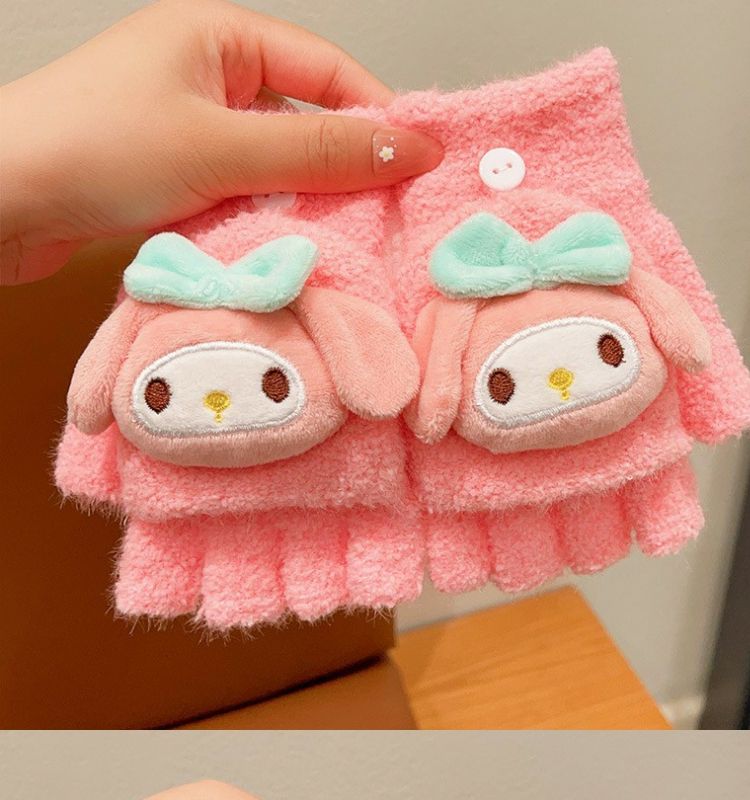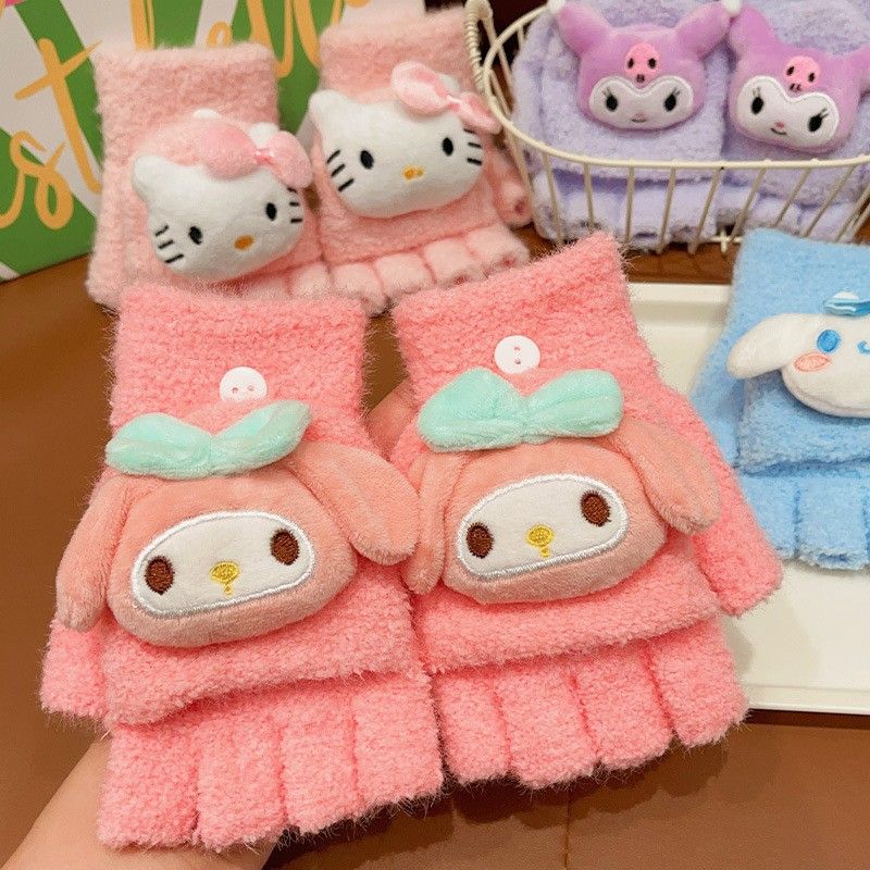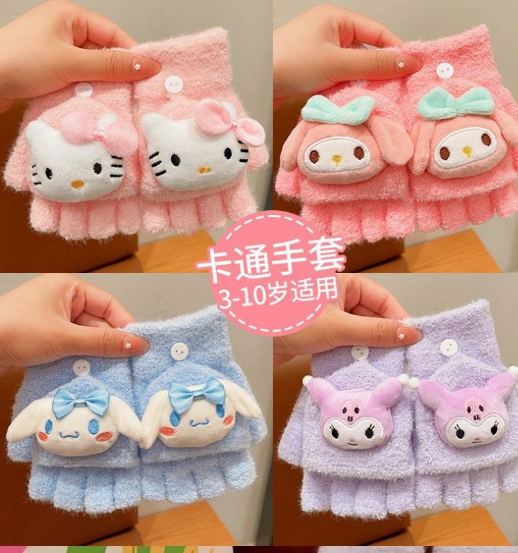 玉桂狗库洛米男女童中半指手套秋冬款儿童手套保暖分五指翻盖手套