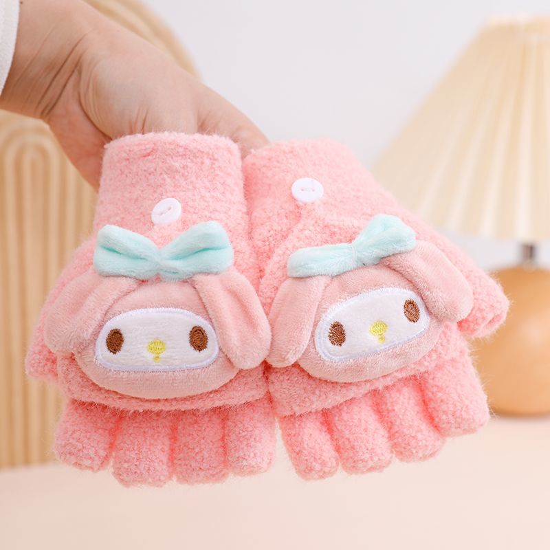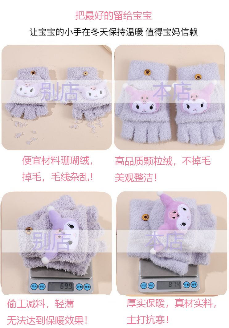 库洛米儿童手套小女孩冬季可爱加绒保暖半指翻盖写字三丽鸥连指套