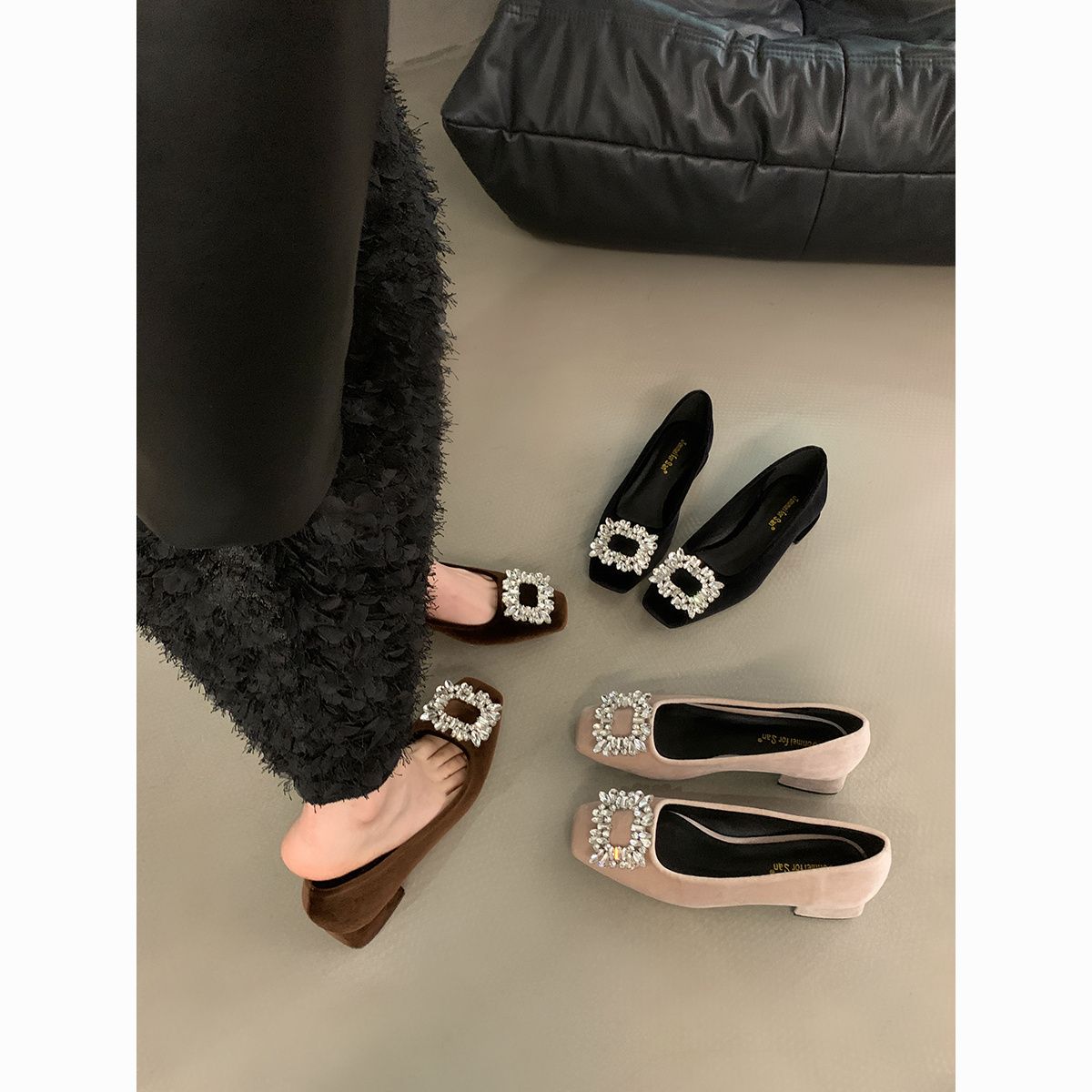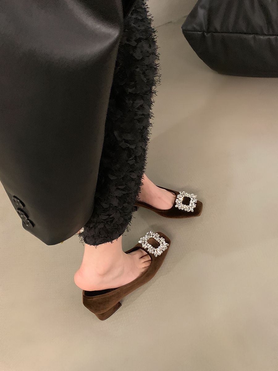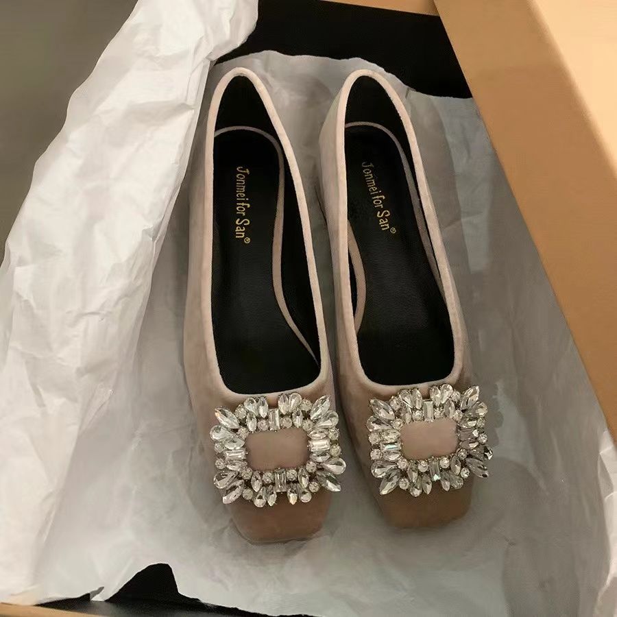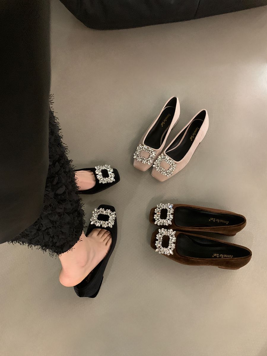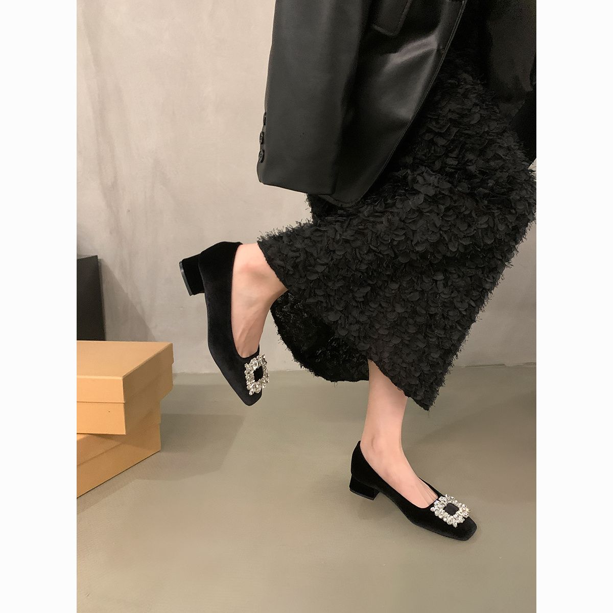 粗跟法式水钻气质单鞋女鞋子2025新款春秋季黑色方头高级感通勤鞋