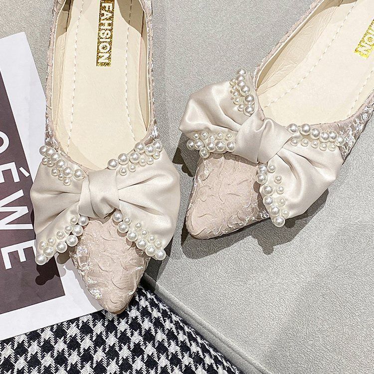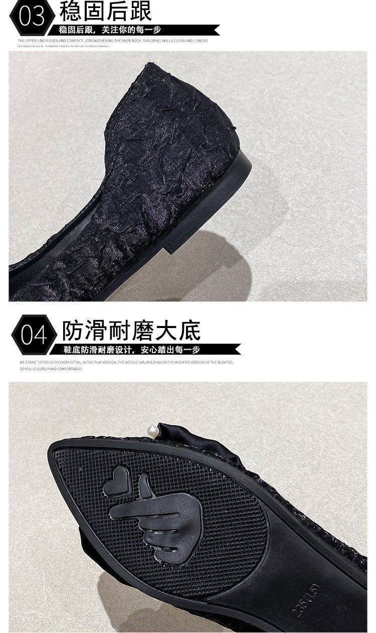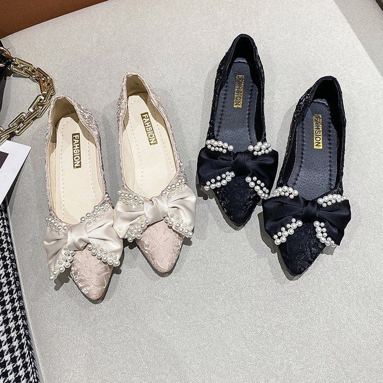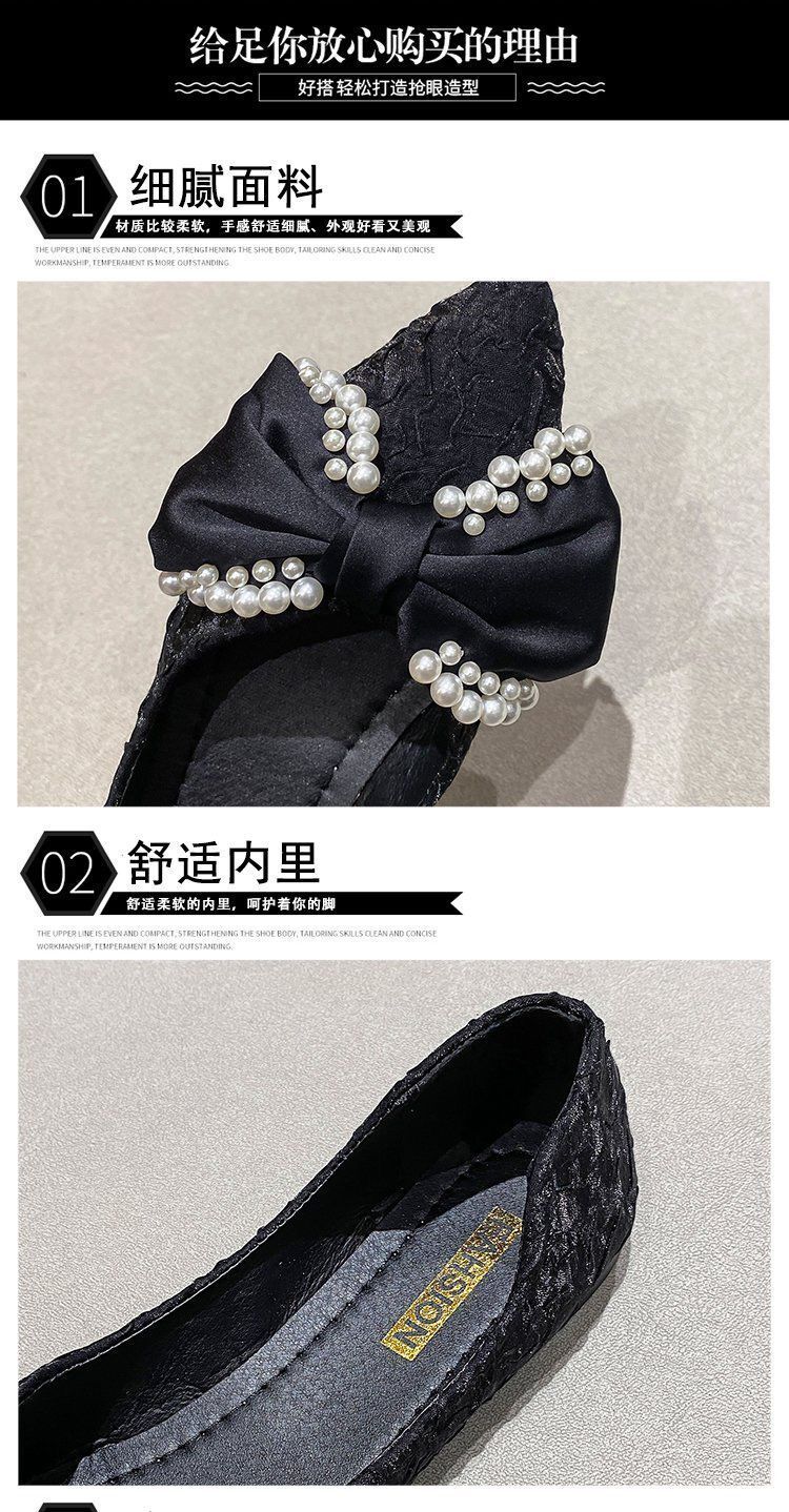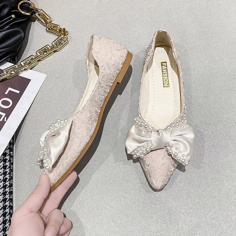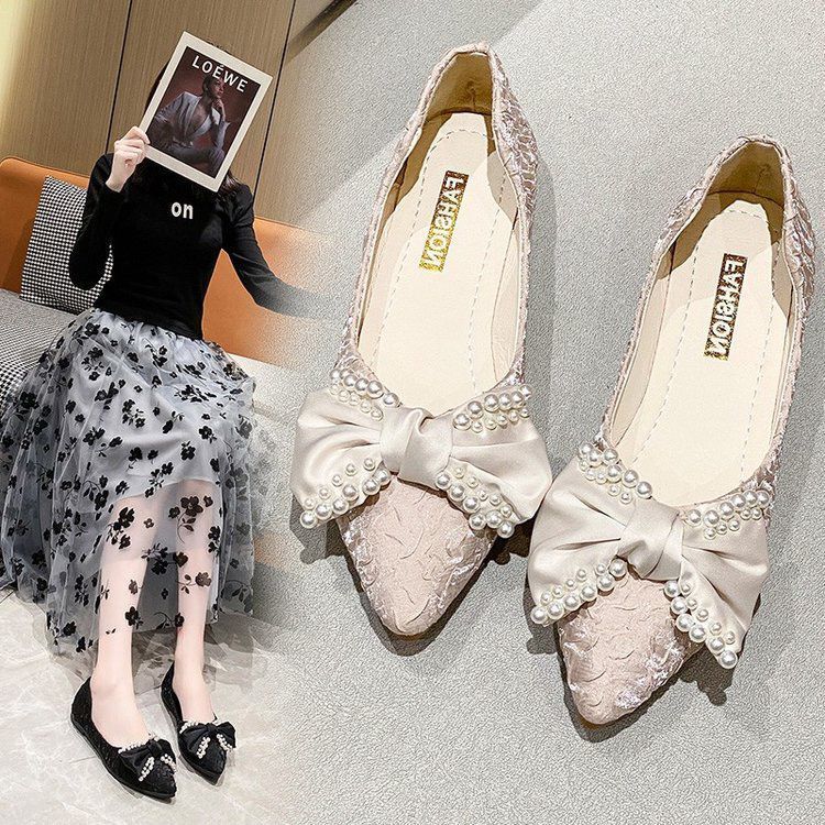 潮牌夏季晚晚风软底尖头平底单鞋女百搭仙女蝴蝶结珍珠浅口豆豆鞋
