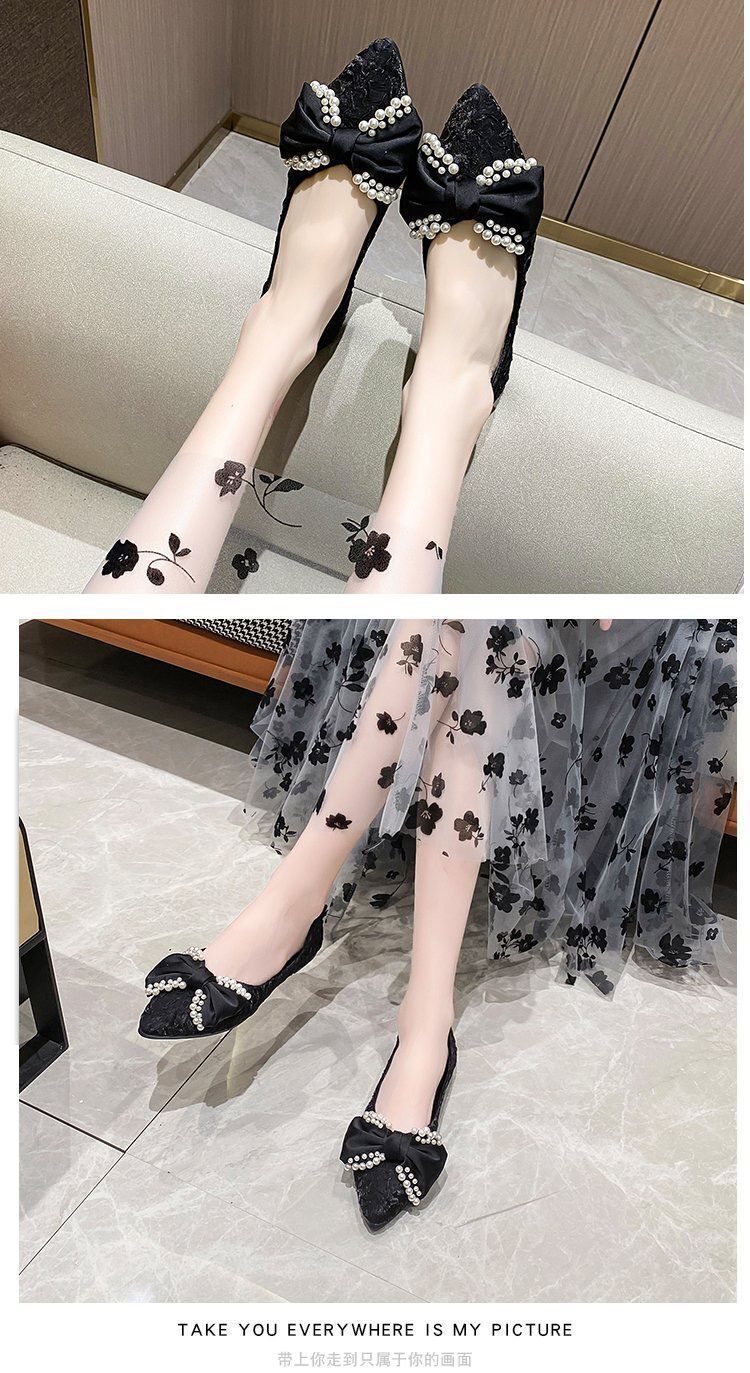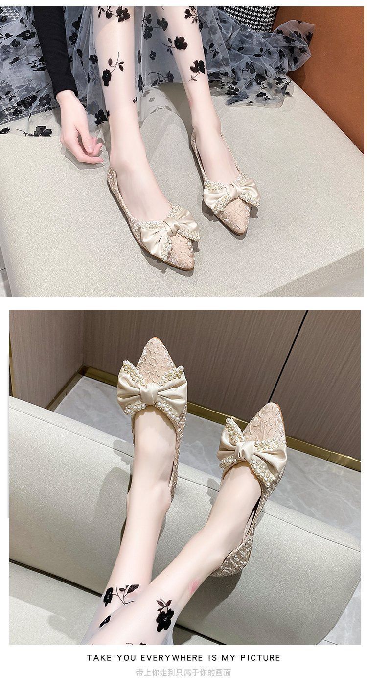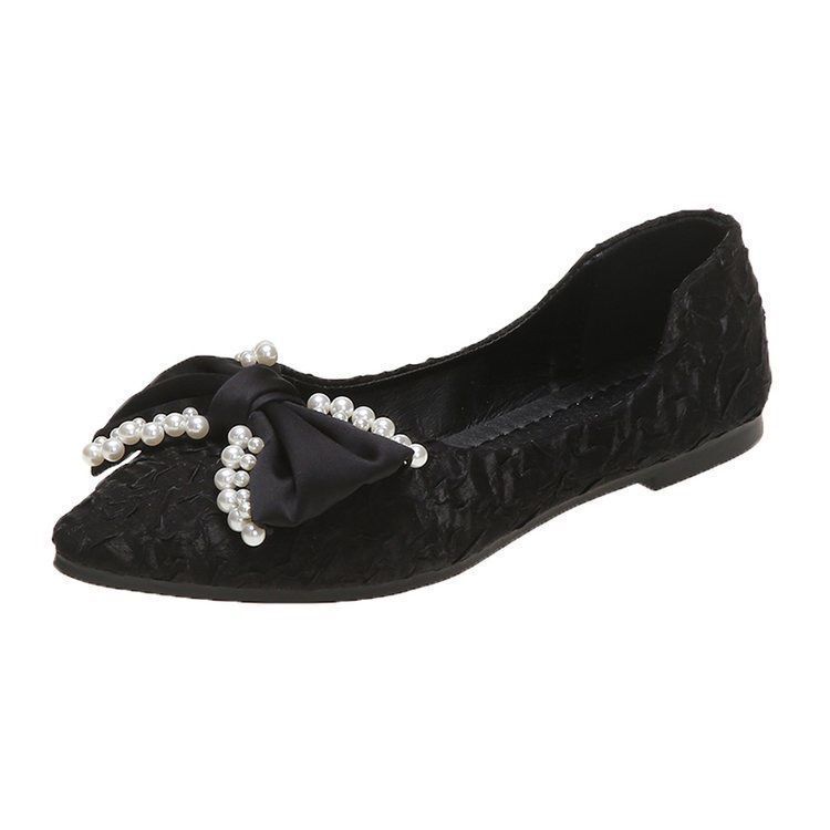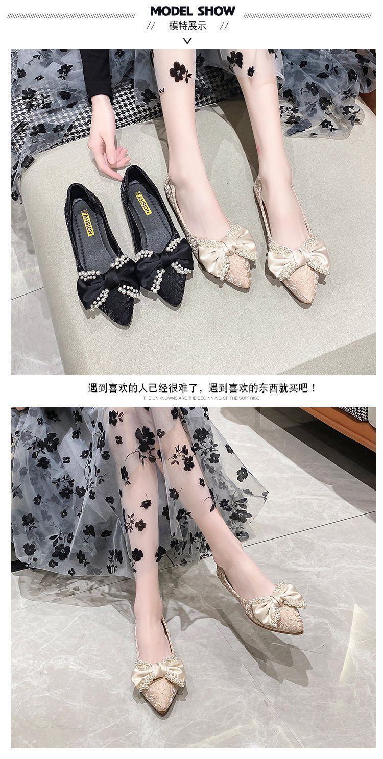 潮牌夏季晚晚风软底尖头平底单鞋女百搭仙女蝴蝶结珍珠浅口豆豆鞋