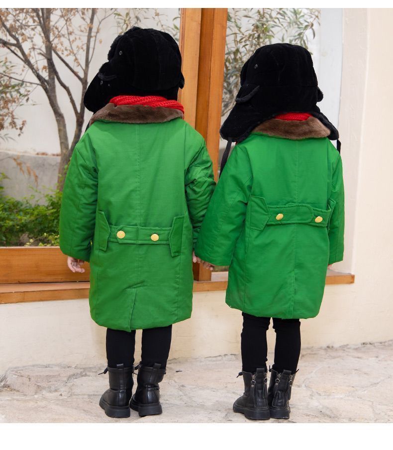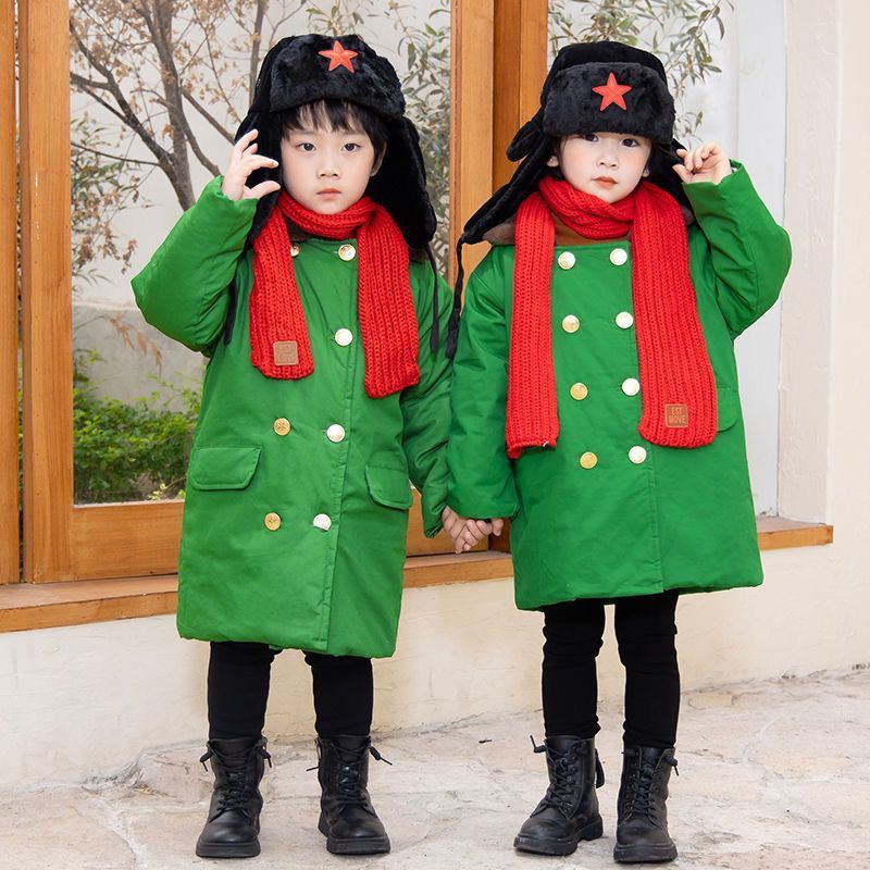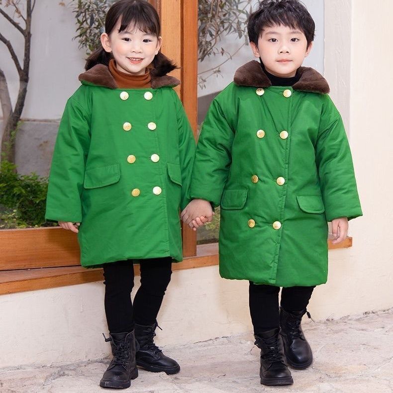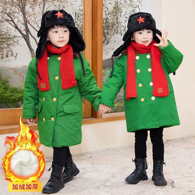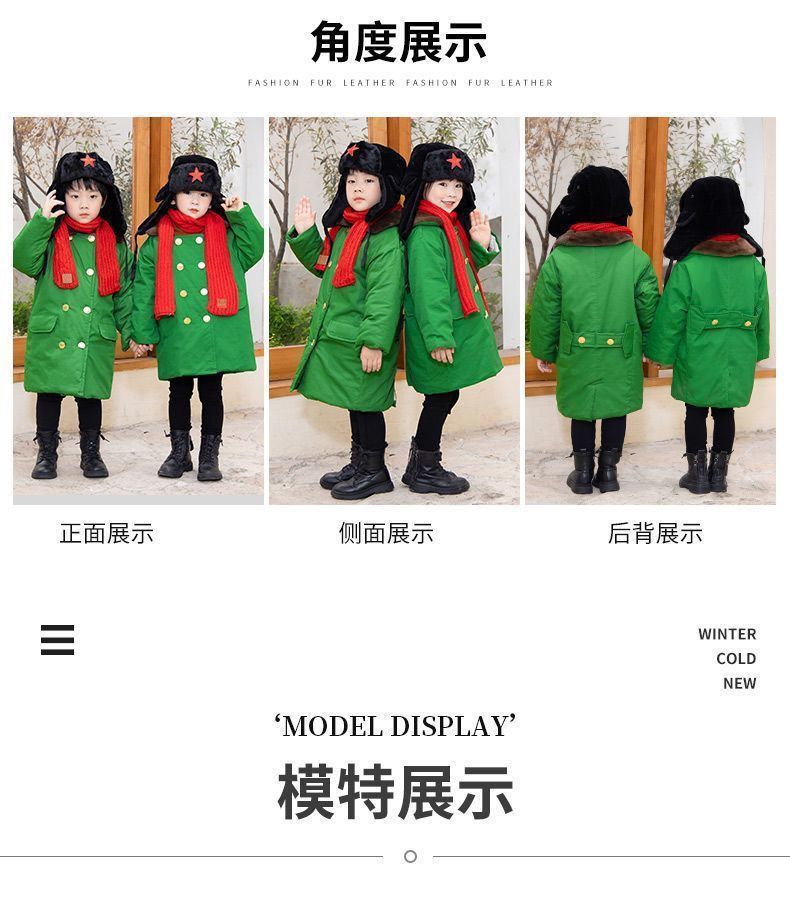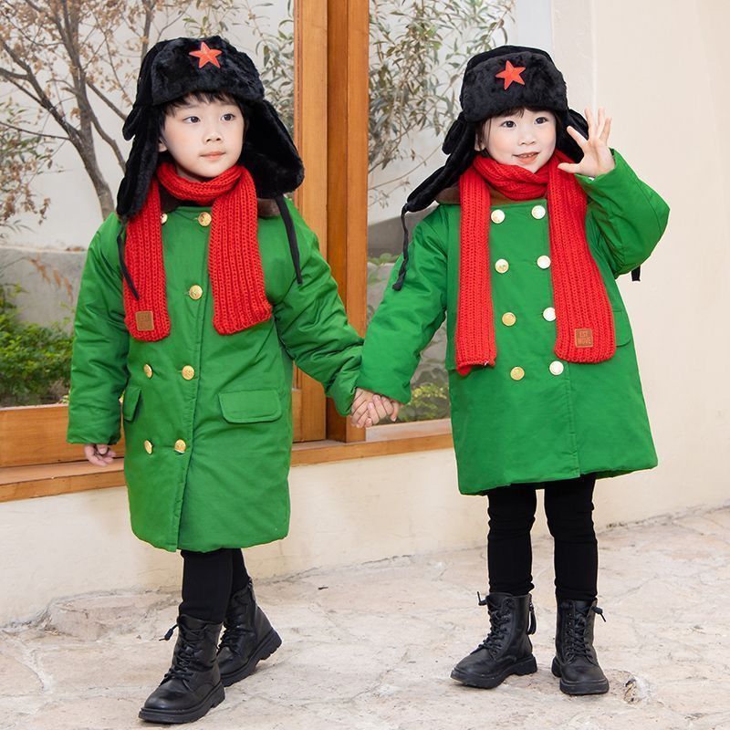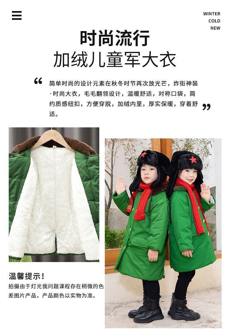 儿童军大衣加棉加厚保暖冬季中长款军绿色男女宝宝棉衣加绒军大衣