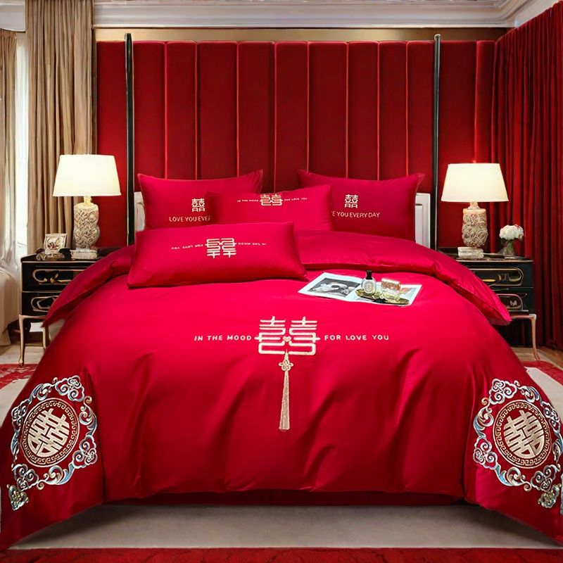 婚庆结婚四件套刺绣床上用品婚床新婚大红色喜被婚房婚礼女方陪嫁