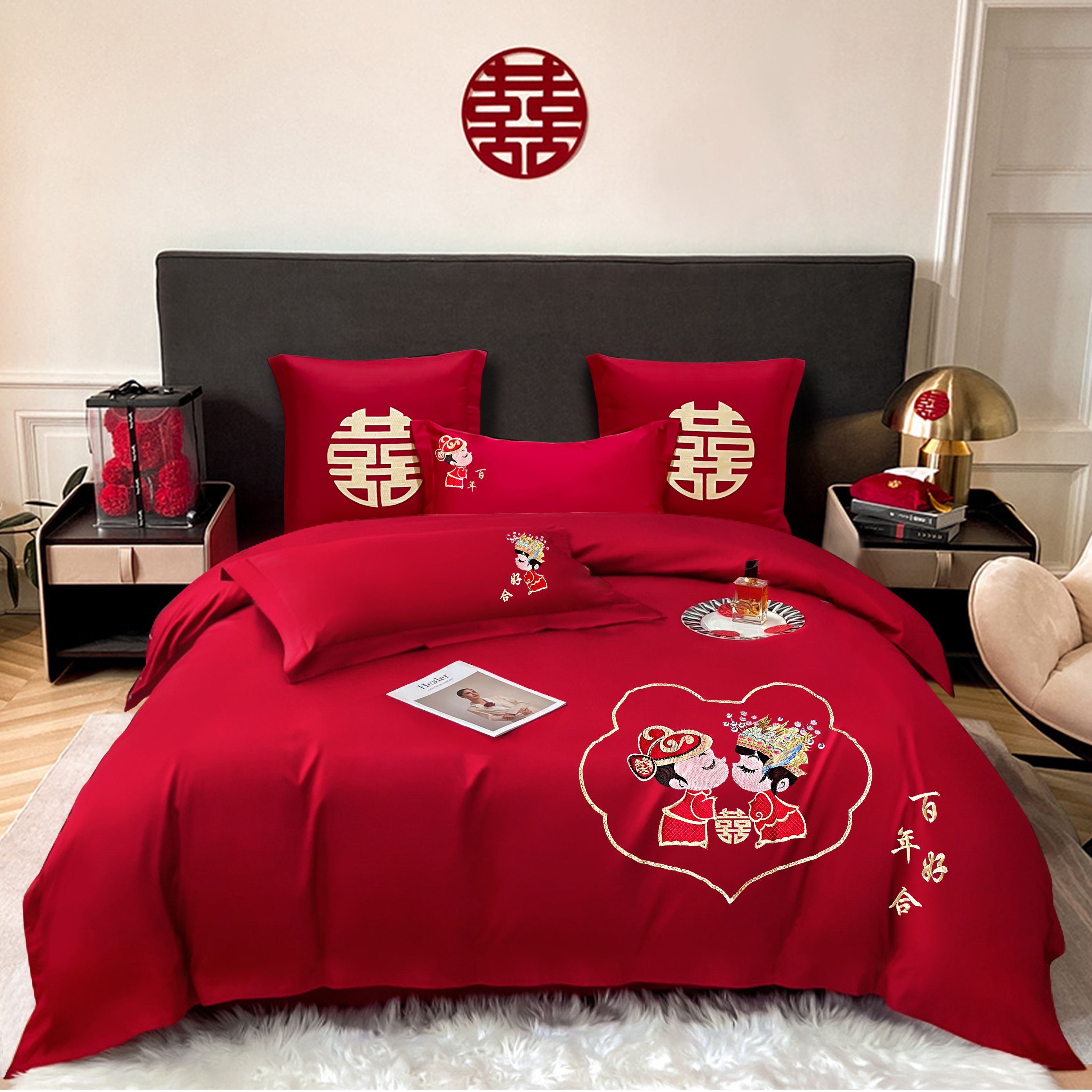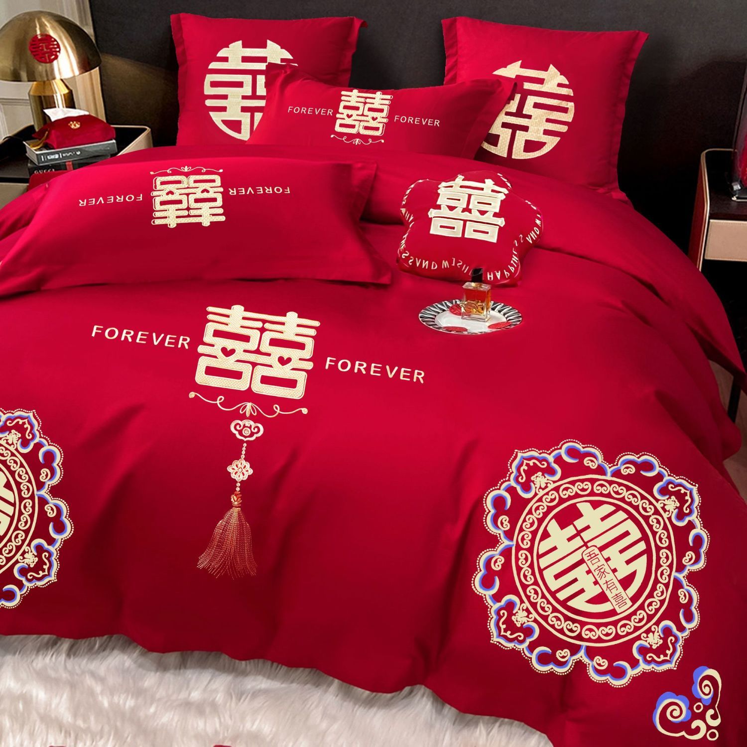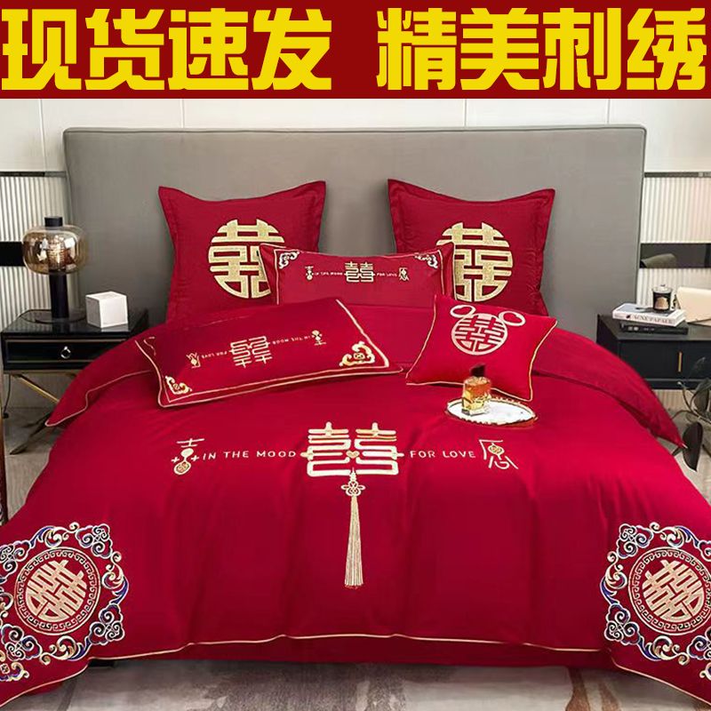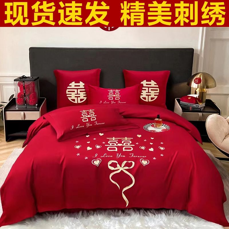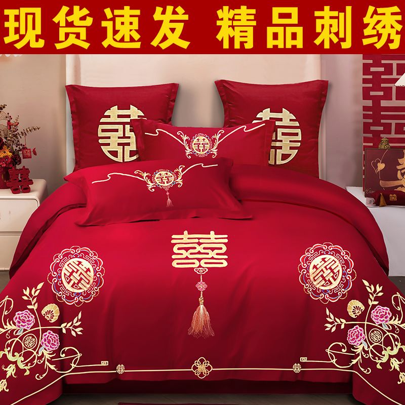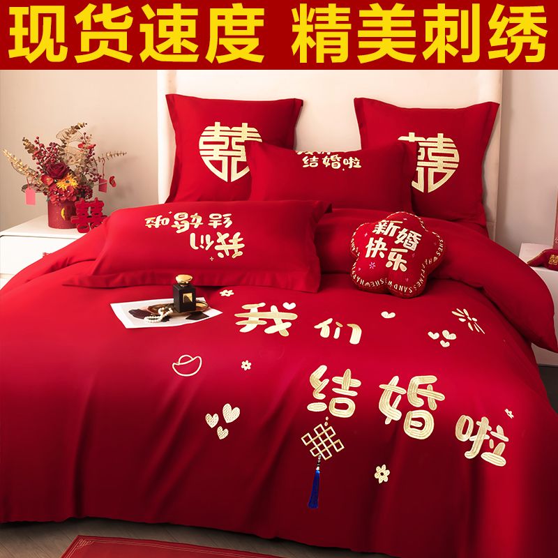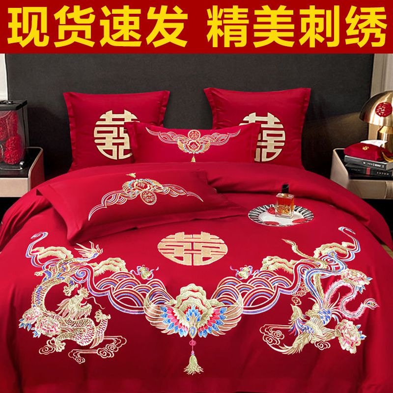 中式婚庆四件套大红色新婚刺绣被套结婚陪嫁喜庆喜被套件床上用品