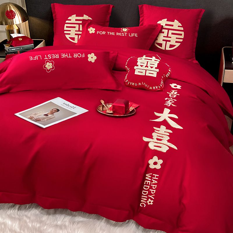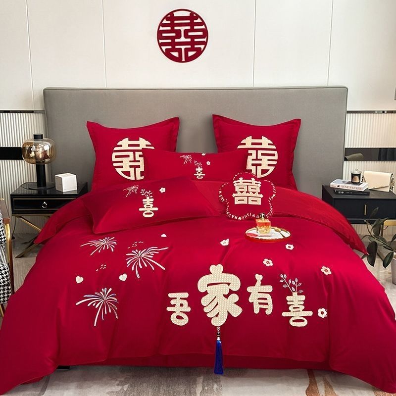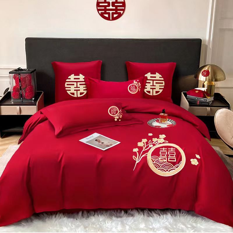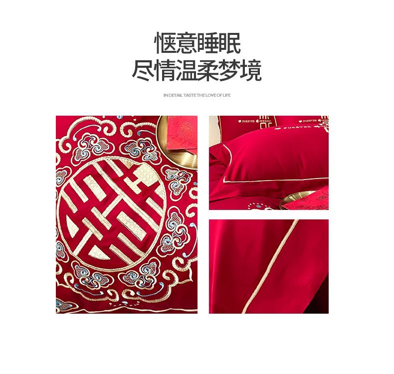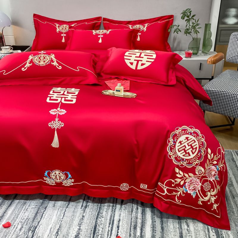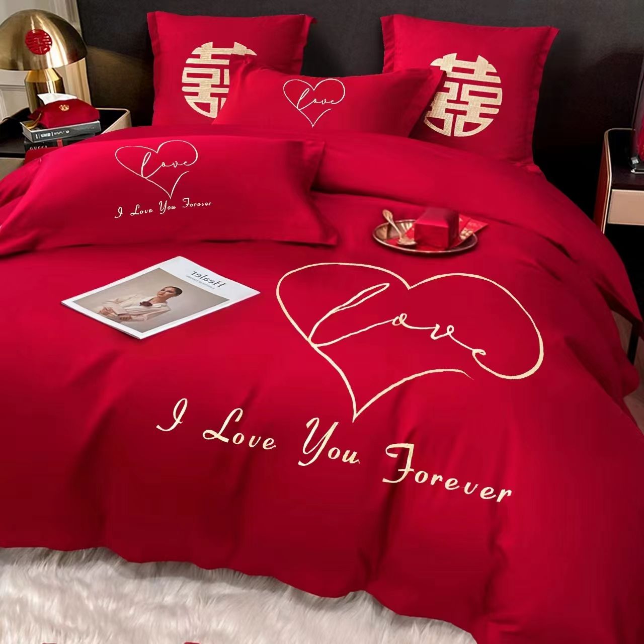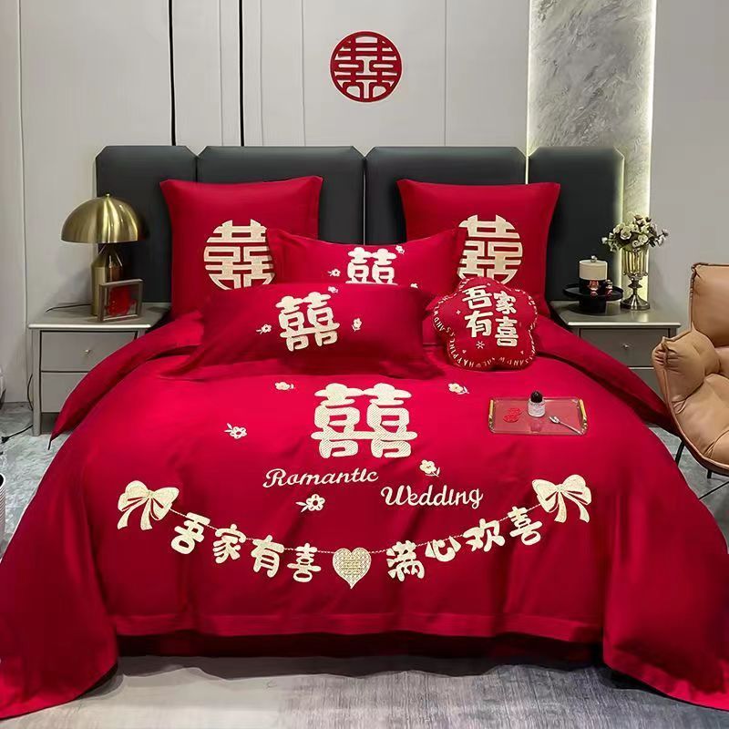 中式婚庆四件套大红色新婚刺绣被套结婚陪嫁喜庆喜被套件床上用品