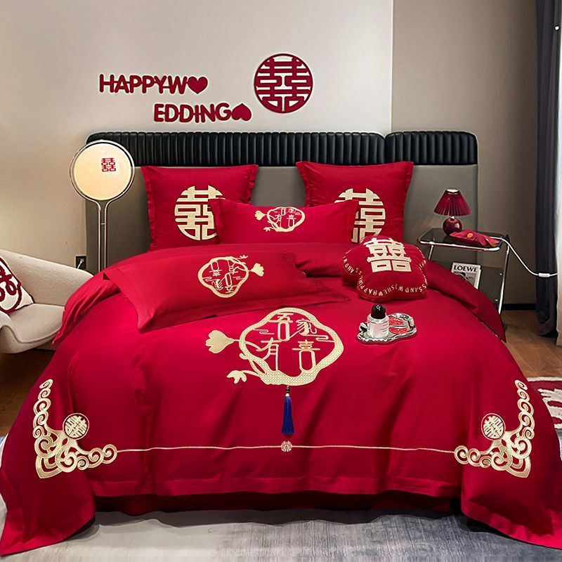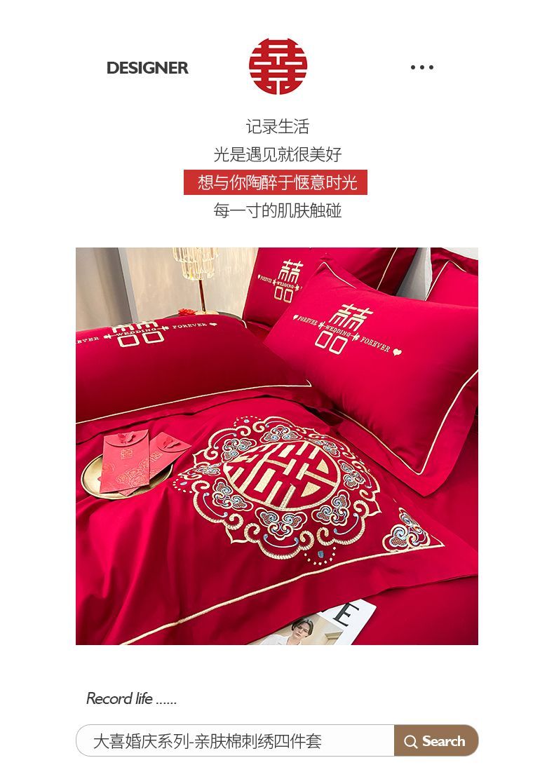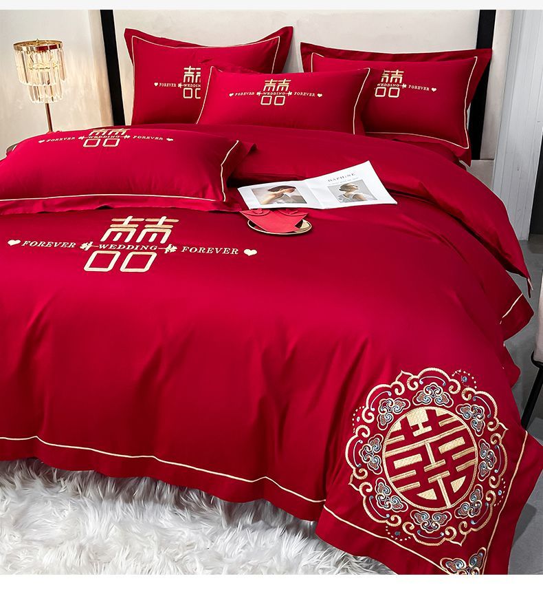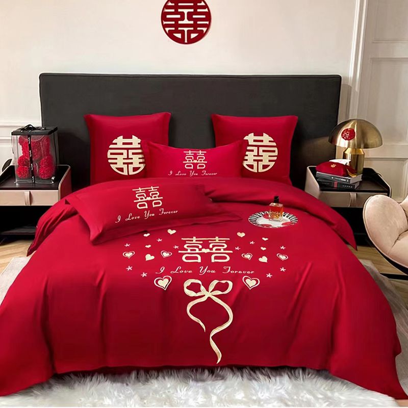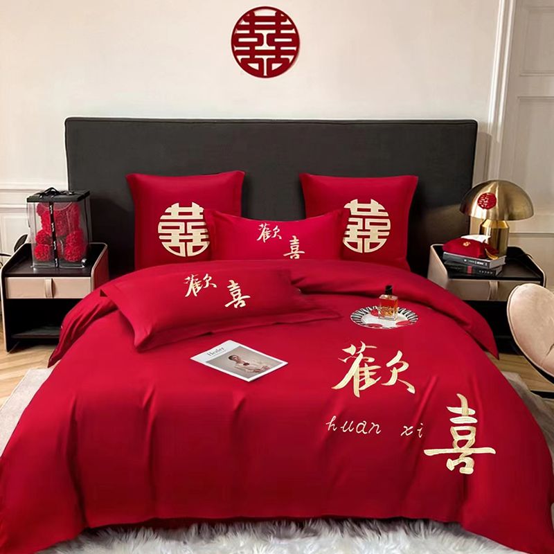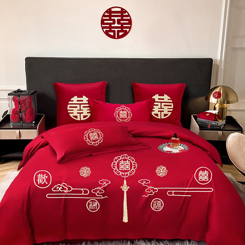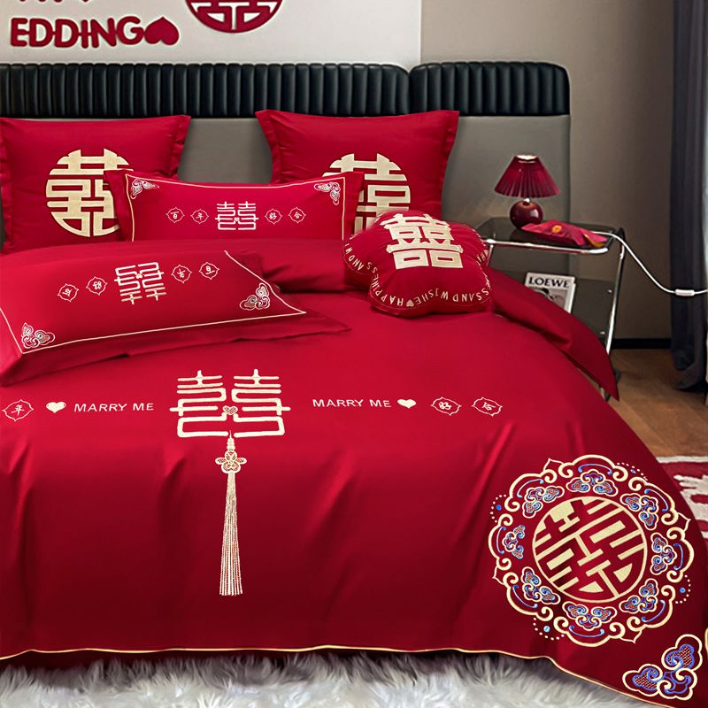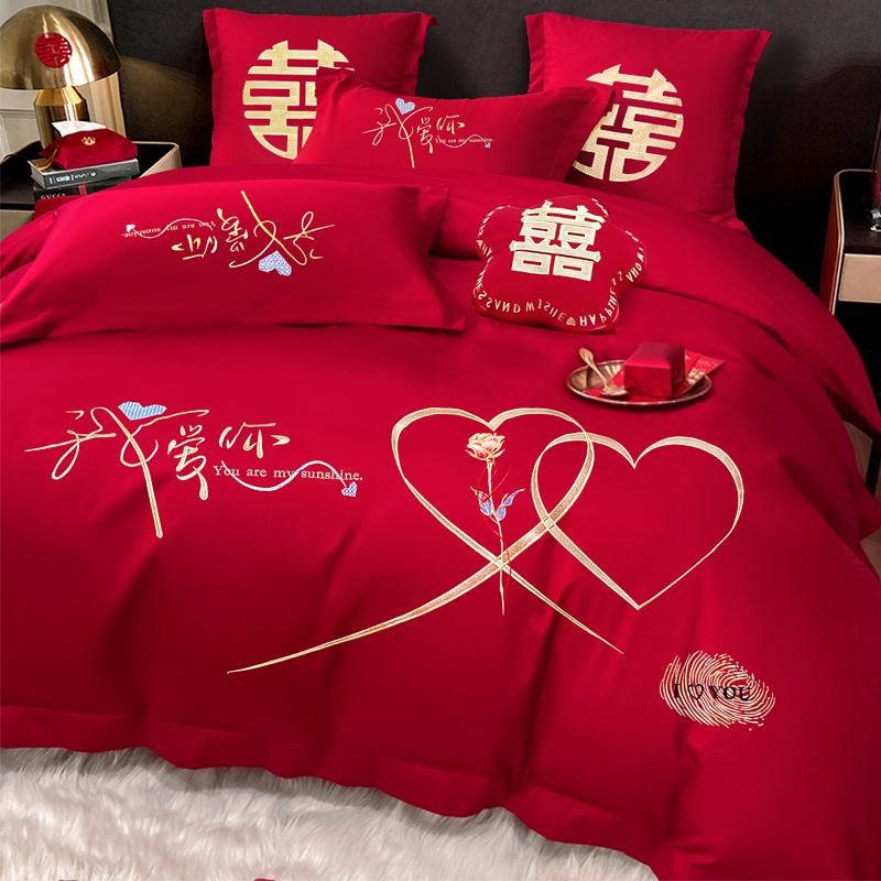 中式婚庆四件套大红色新婚刺绣被套结婚陪嫁喜庆喜被套件床上用品