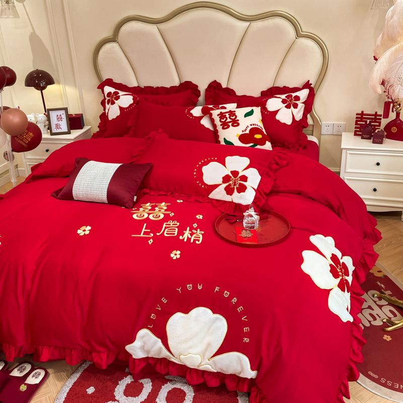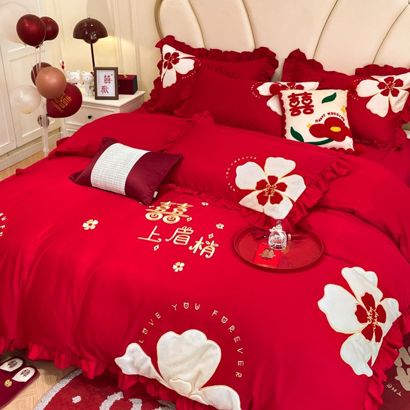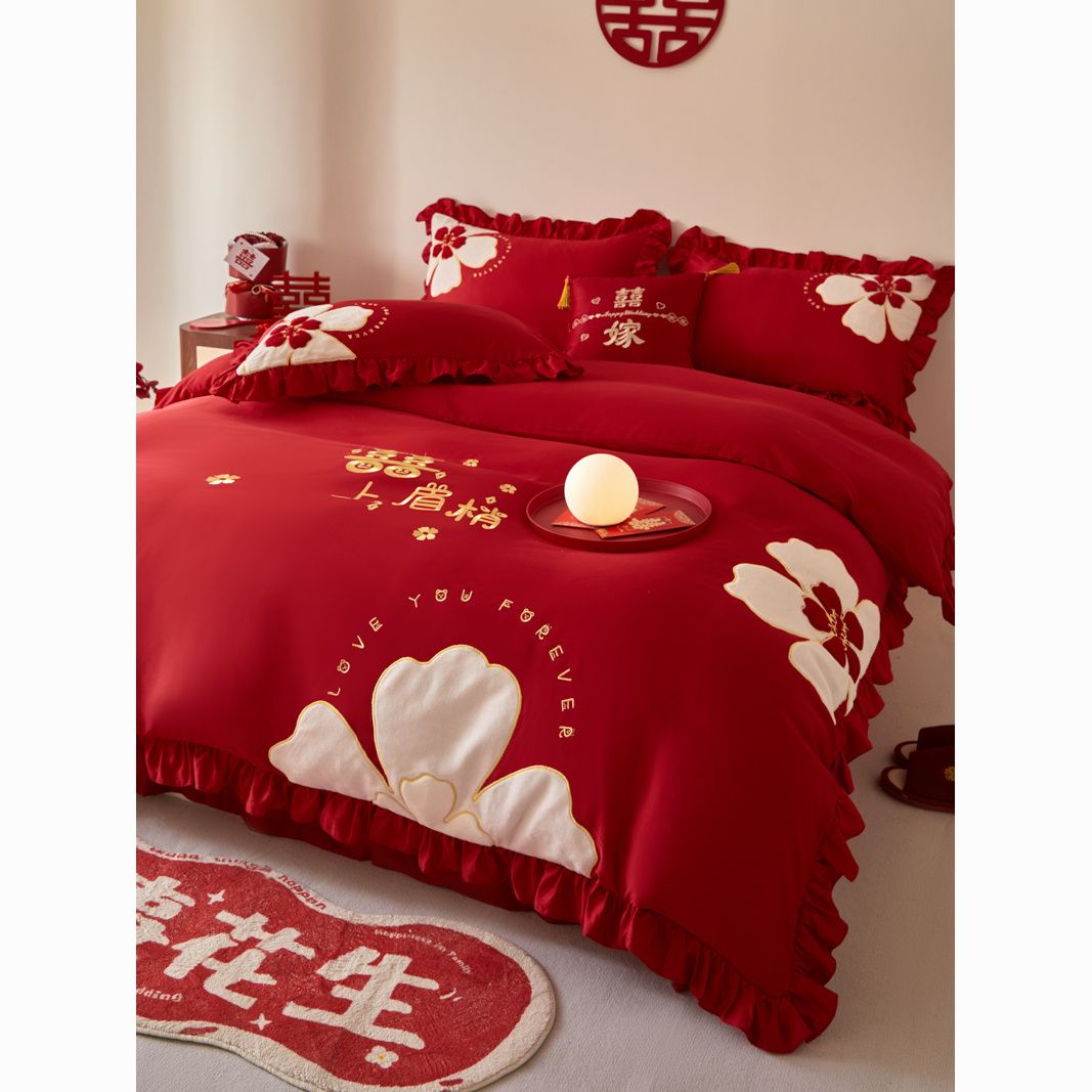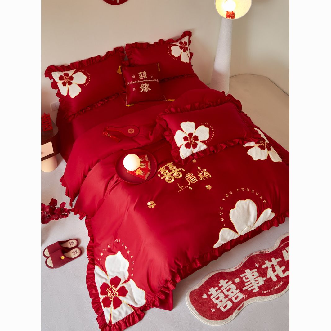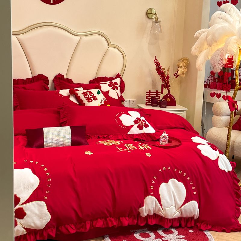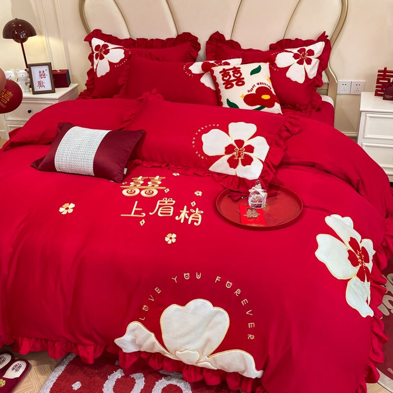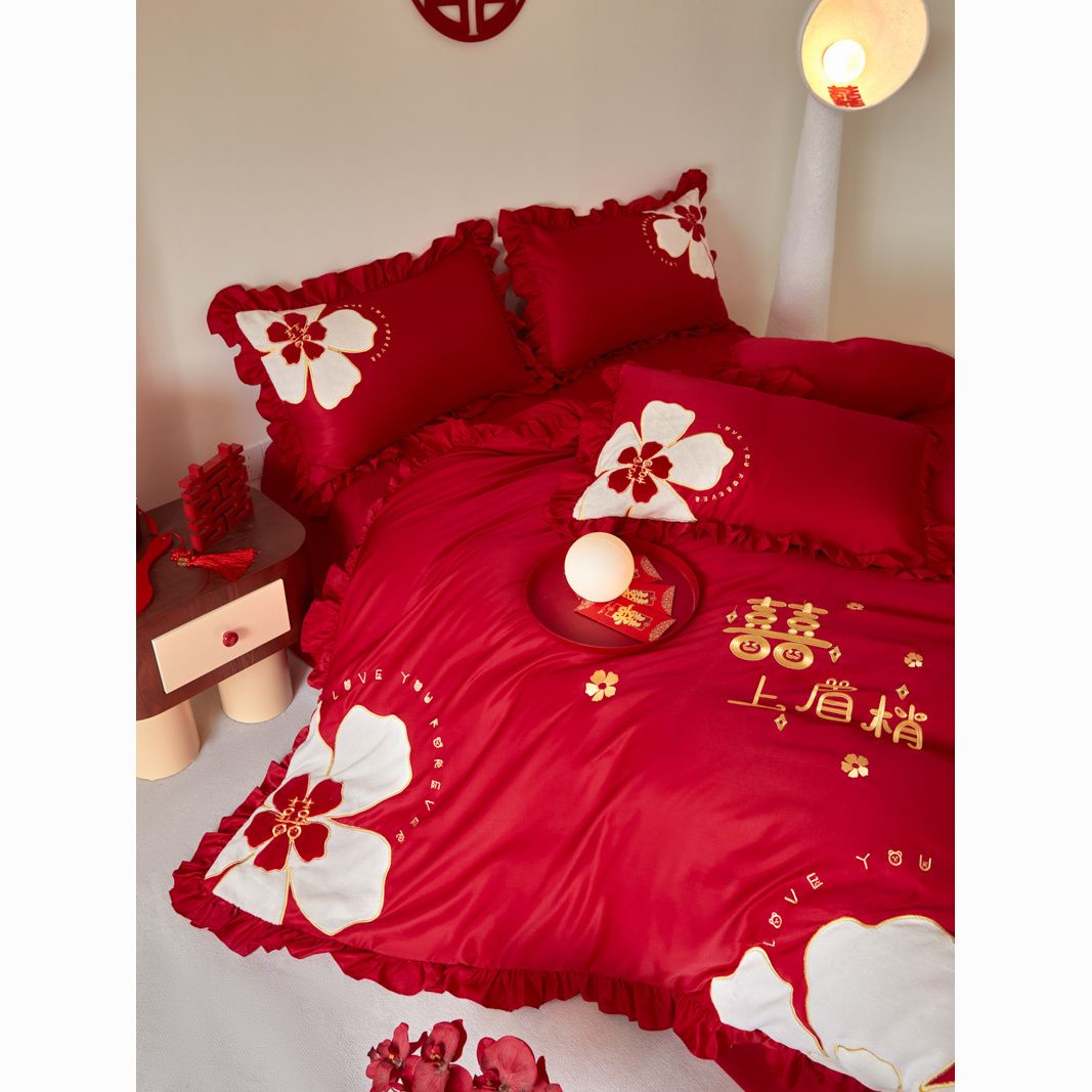 结婚四件套大红色婚庆全棉刺绣高级喜被床单新婚礼房陪嫁床上用品