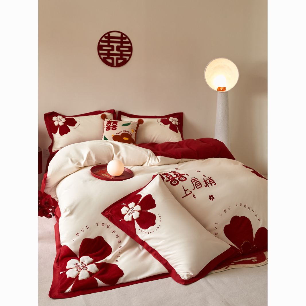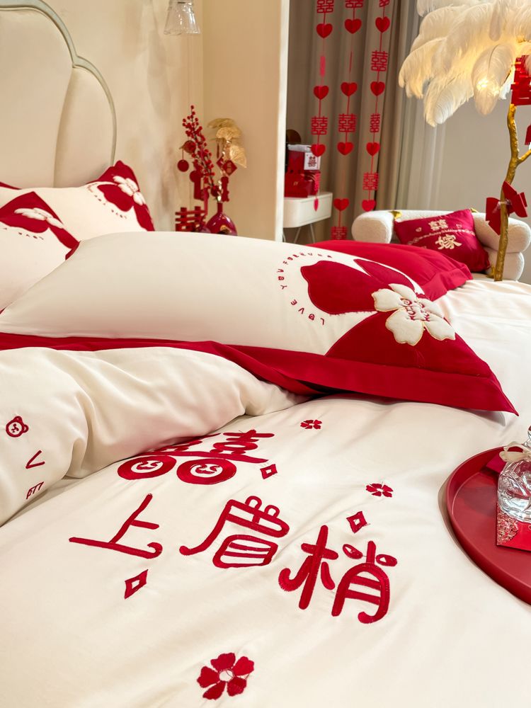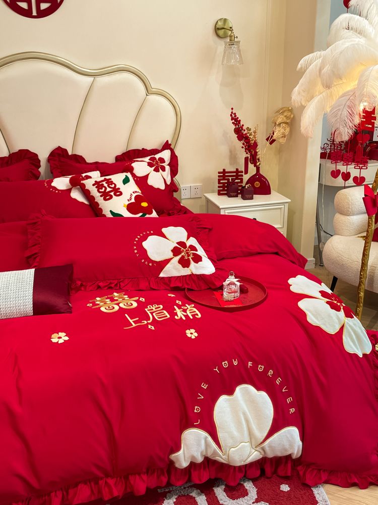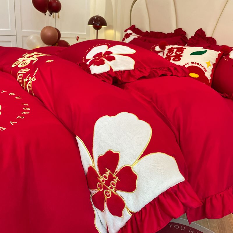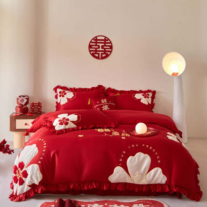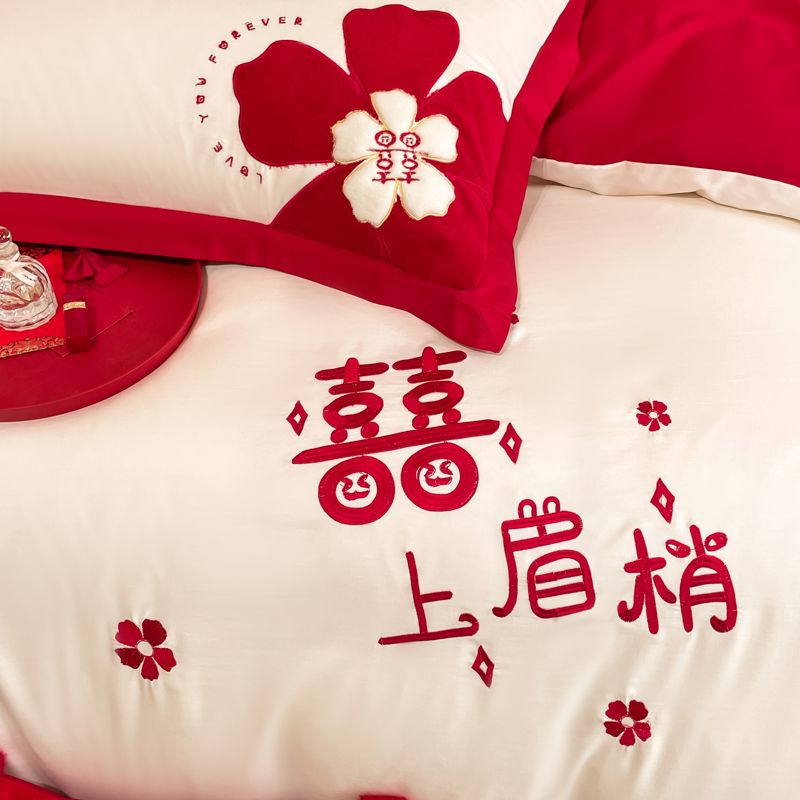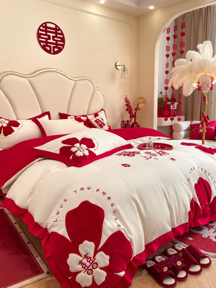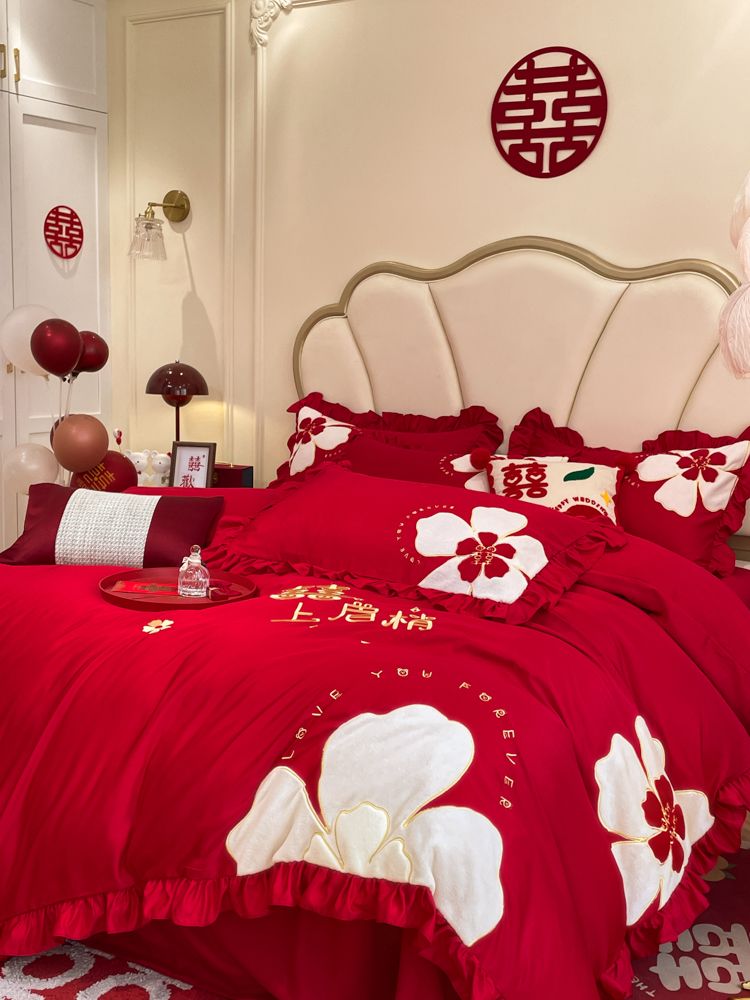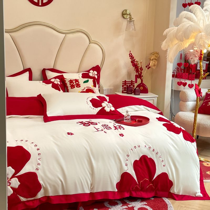 结婚四件套大红色婚庆全棉刺绣高级喜被床单新婚礼房陪嫁床上用品