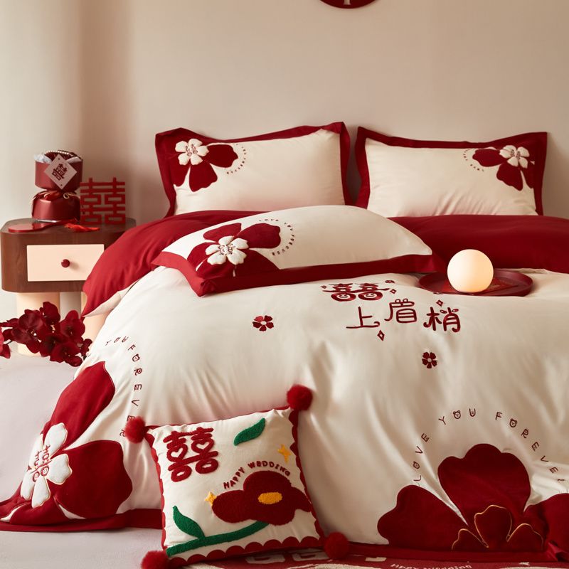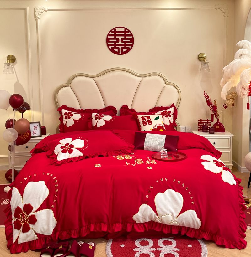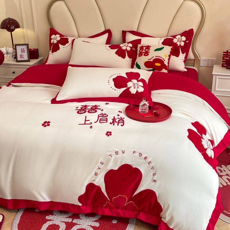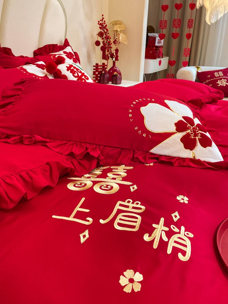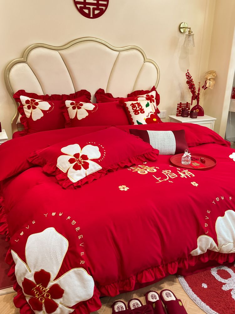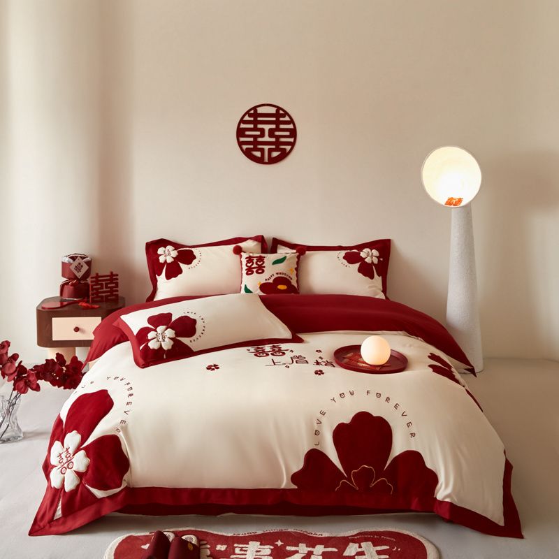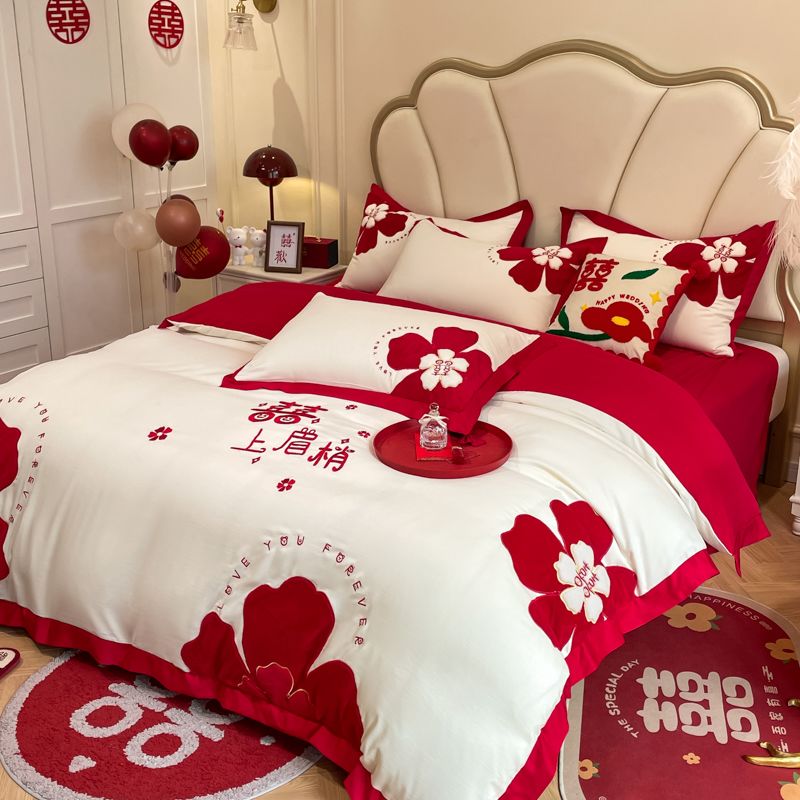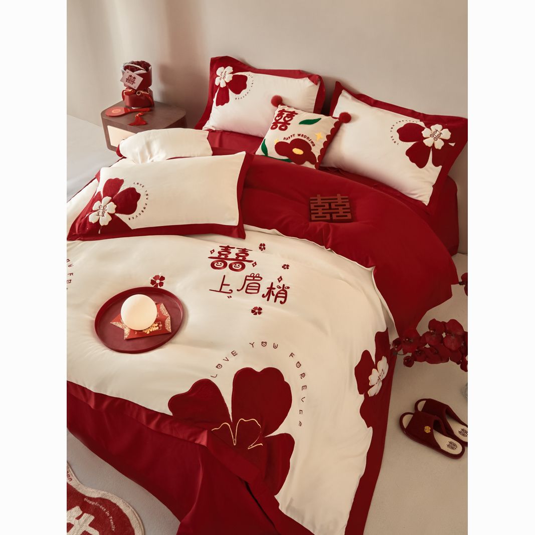 结婚四件套大红色婚庆全棉刺绣高级喜被床单新婚礼房陪嫁床上用品