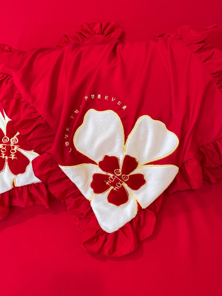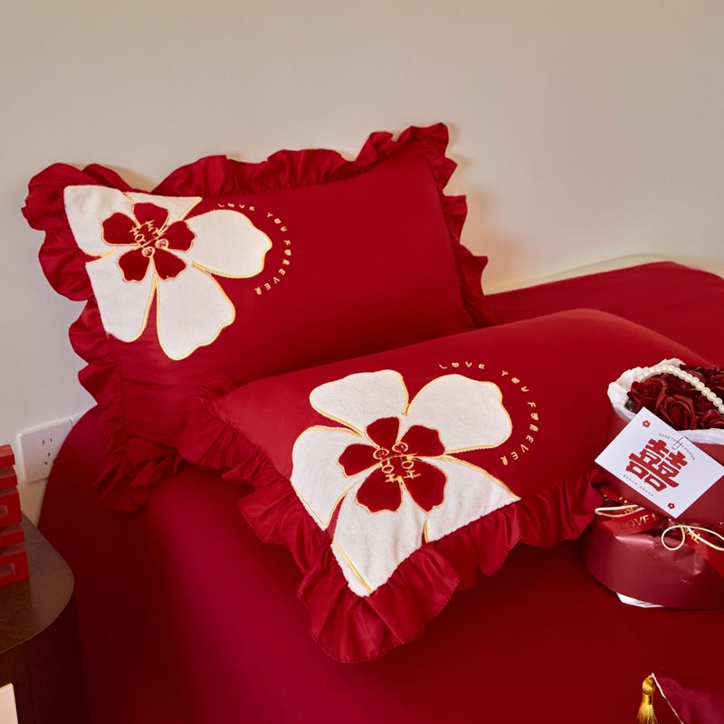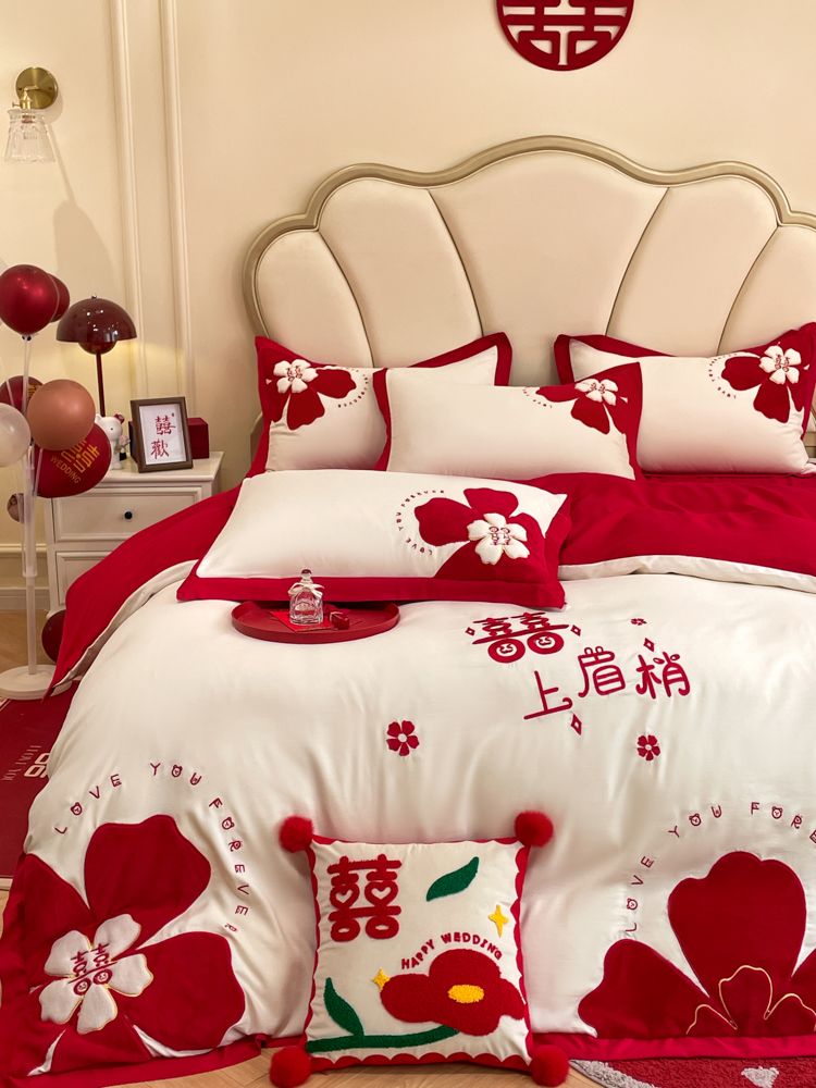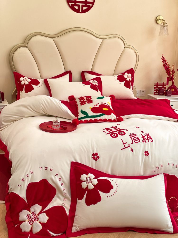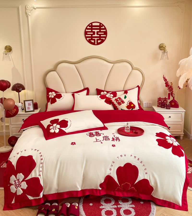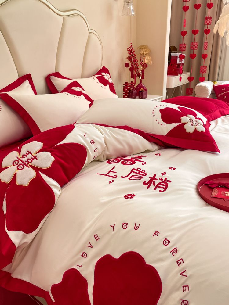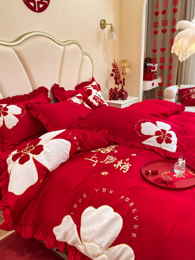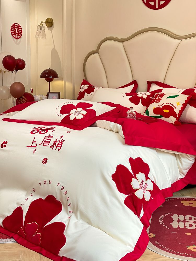 结婚四件套大红色婚庆全棉刺绣高级喜被床单新婚礼房陪嫁床上用品
