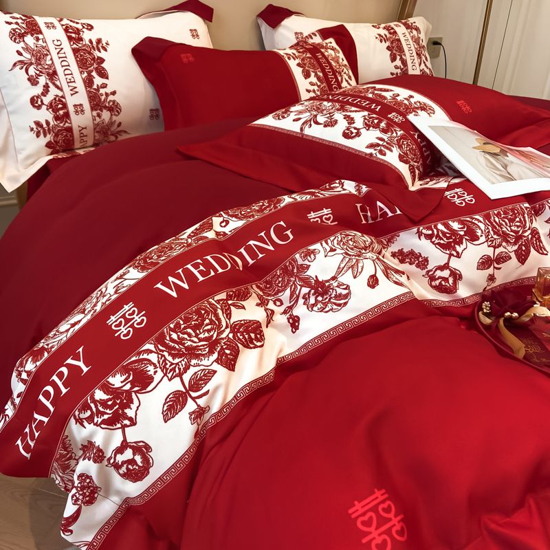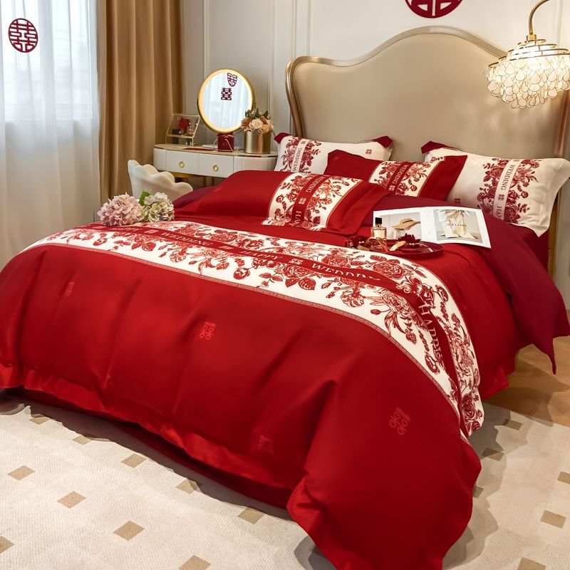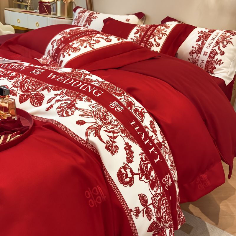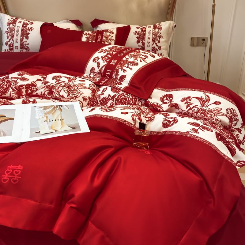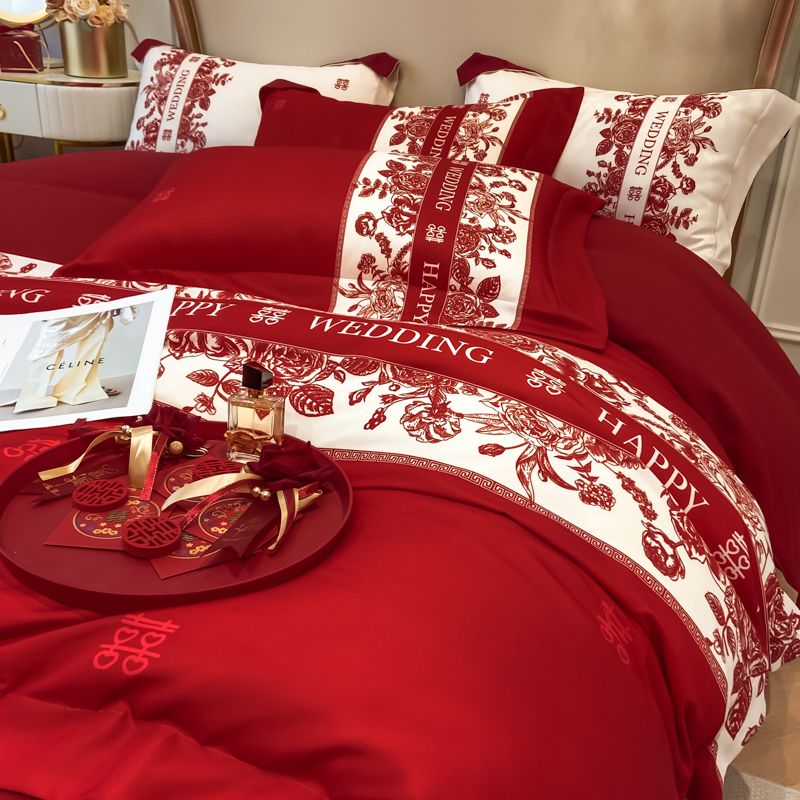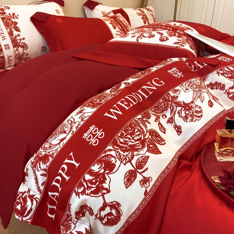 轻奢结婚四件套中式印花高级感红色被套喜庆新婚婚庆陪嫁床上用品