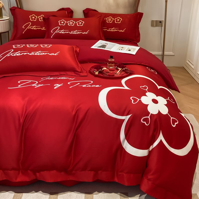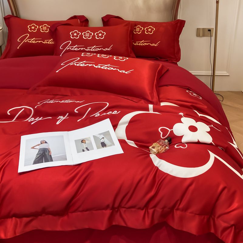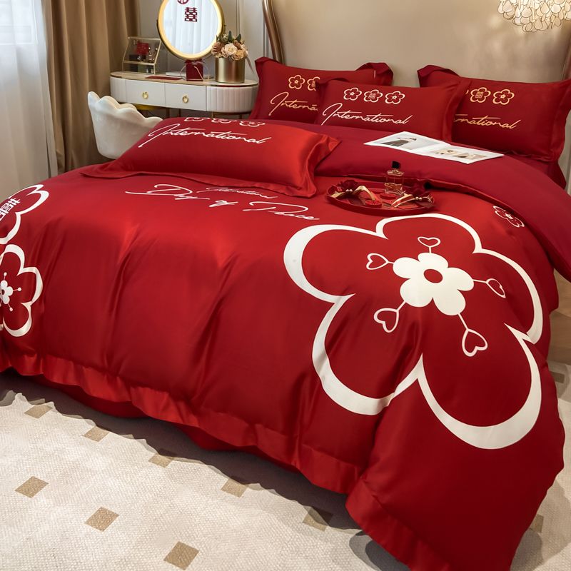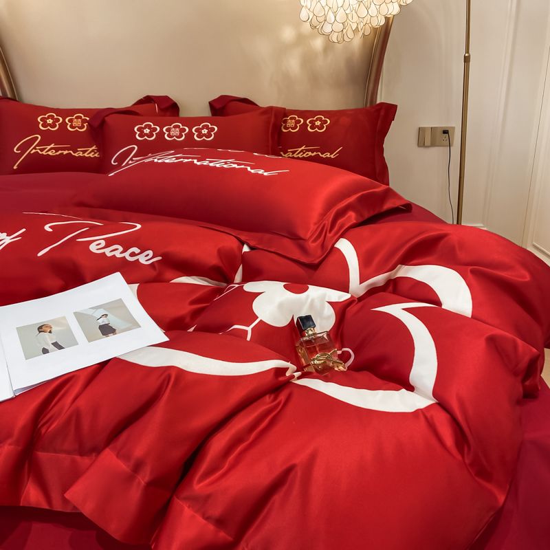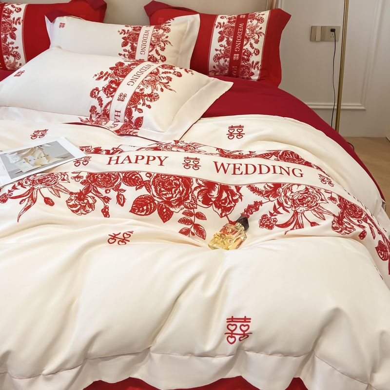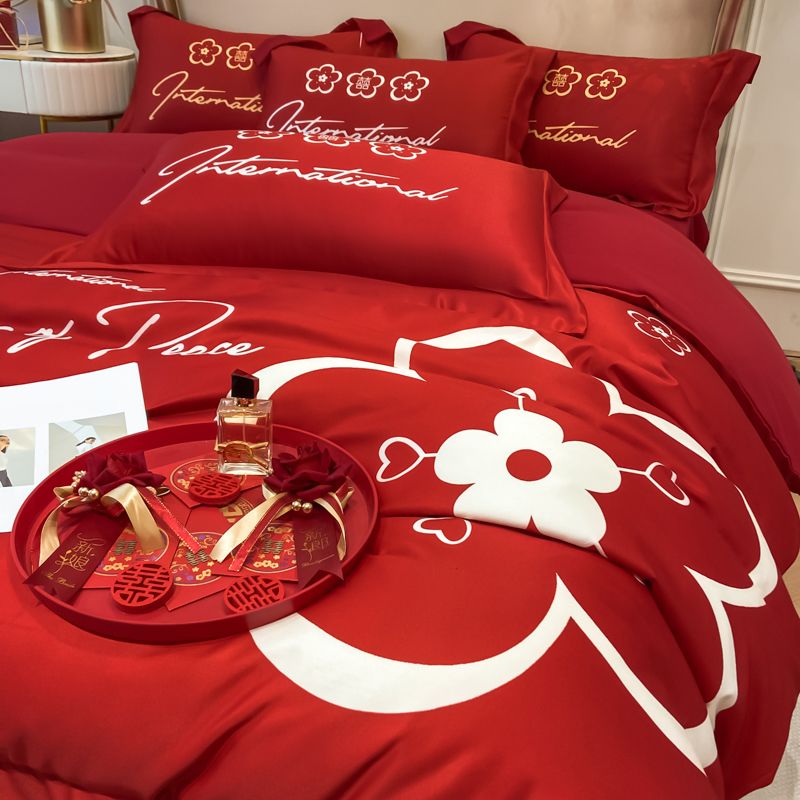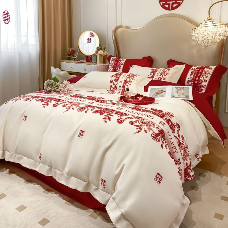 轻奢结婚四件套中式印花高级感红色被套喜庆新婚婚庆陪嫁床上用品