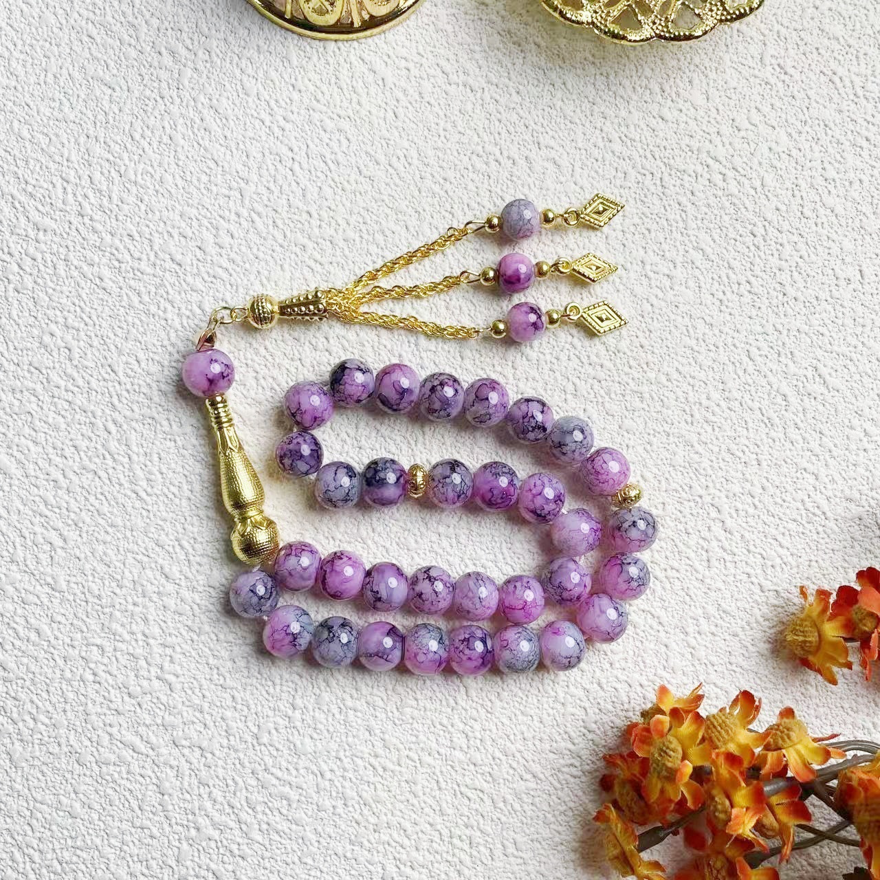新款33颗10厘大花珠金色穗子玻璃手串穆斯林念珠礼拜赞珠10mm款Ta