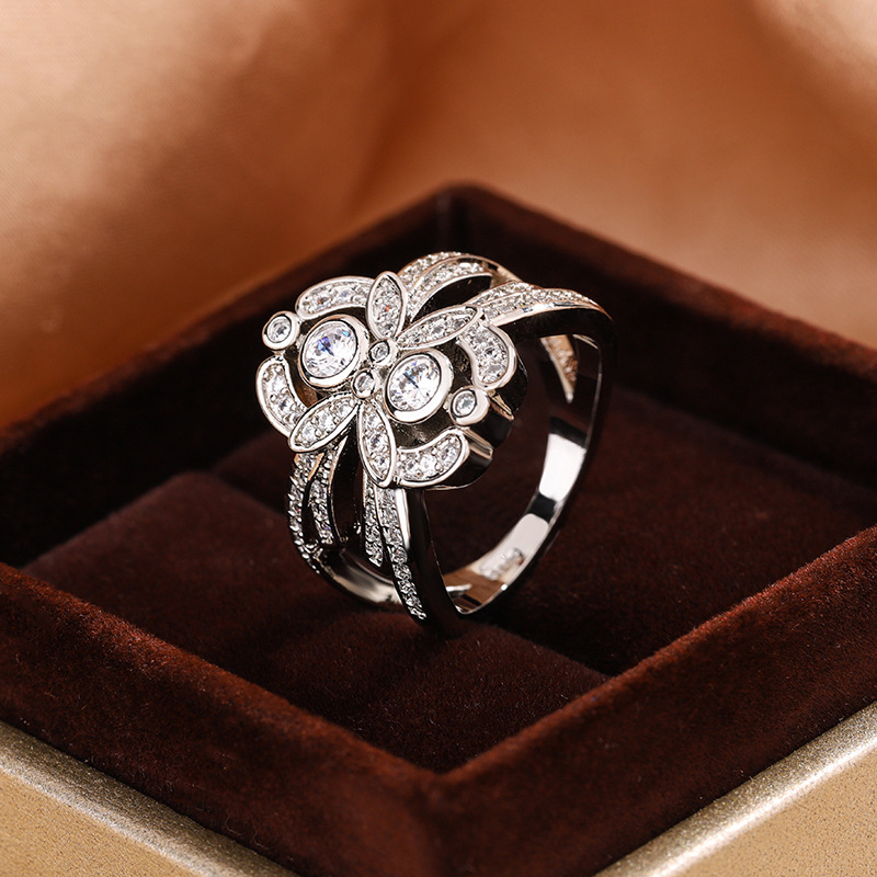 tiktok 时尚欧美风饰品 复古繁花锆石戒指 精致花朵圆钻女士指环