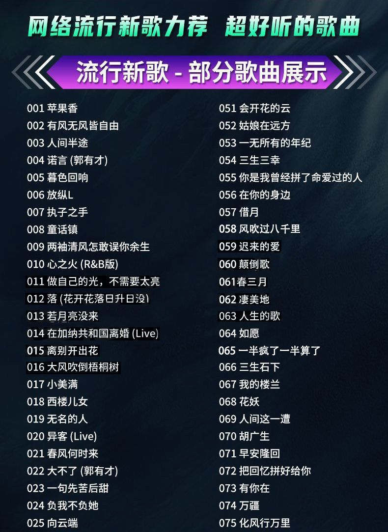 | 2024热门歌曲-4380首【含新歌】 | USD $3.52 | 999999 piece available |