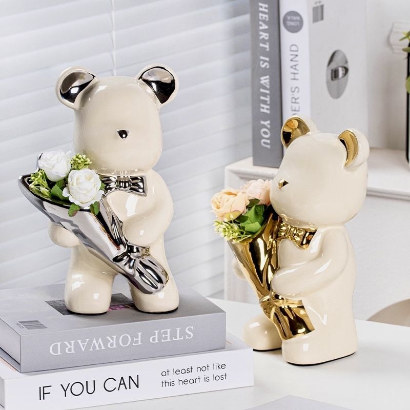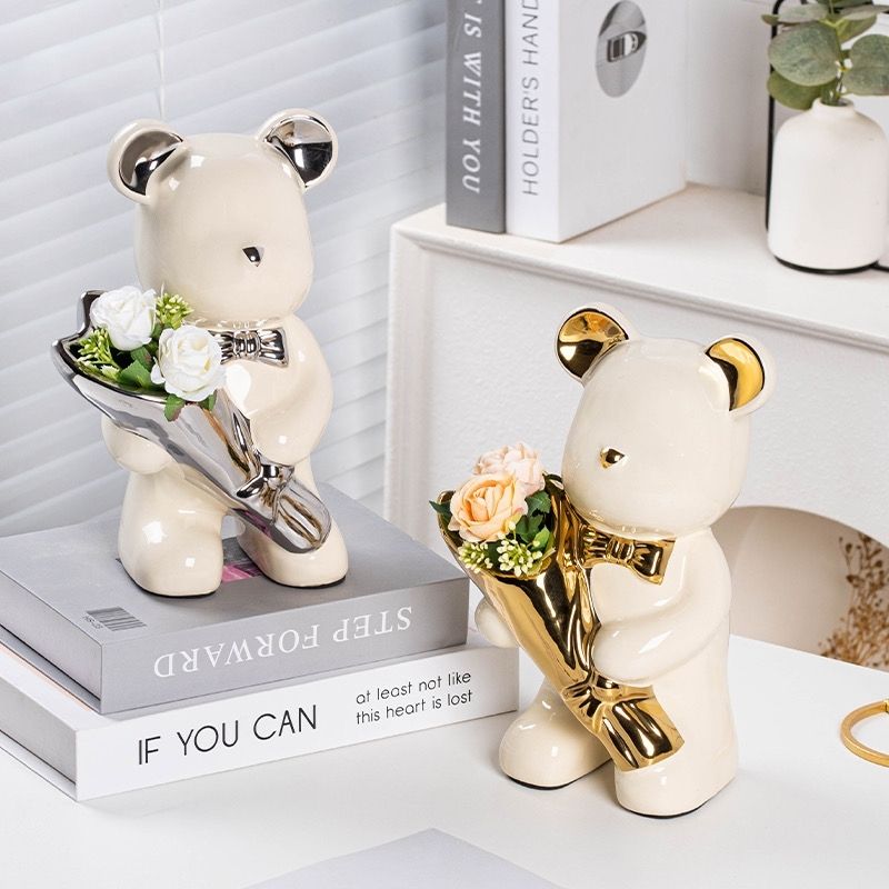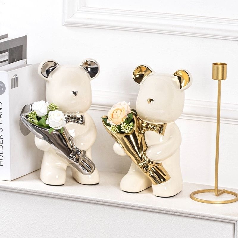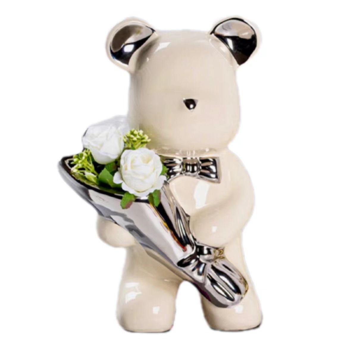 网红陶瓷暴力熊花束熊抱花熊仿真花家居摆件潮玩工艺品入门玄关柜