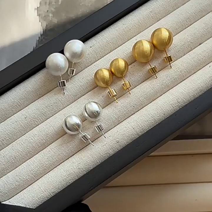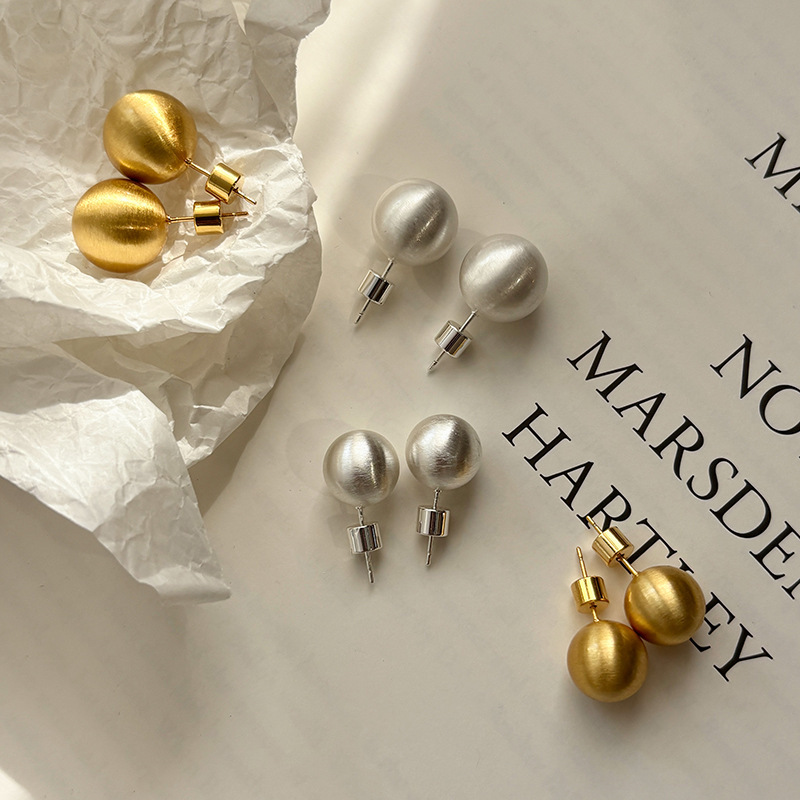 S925纯银针耳环轻奢小众高级感网红耳饰真金电镀拉丝金属圆球耳钉
