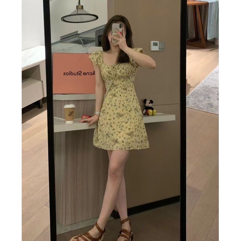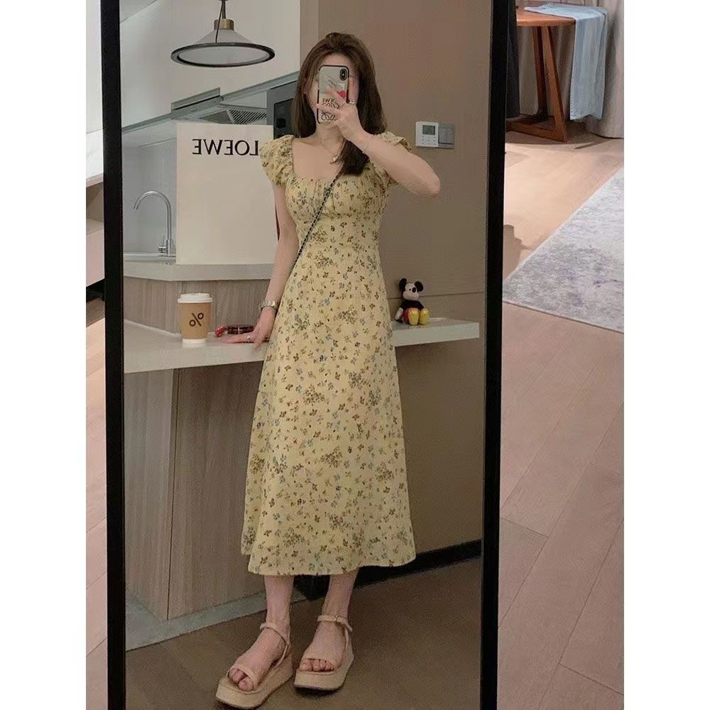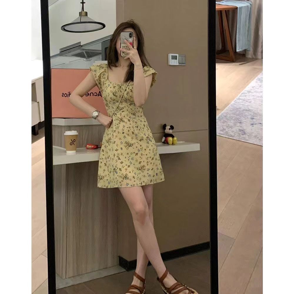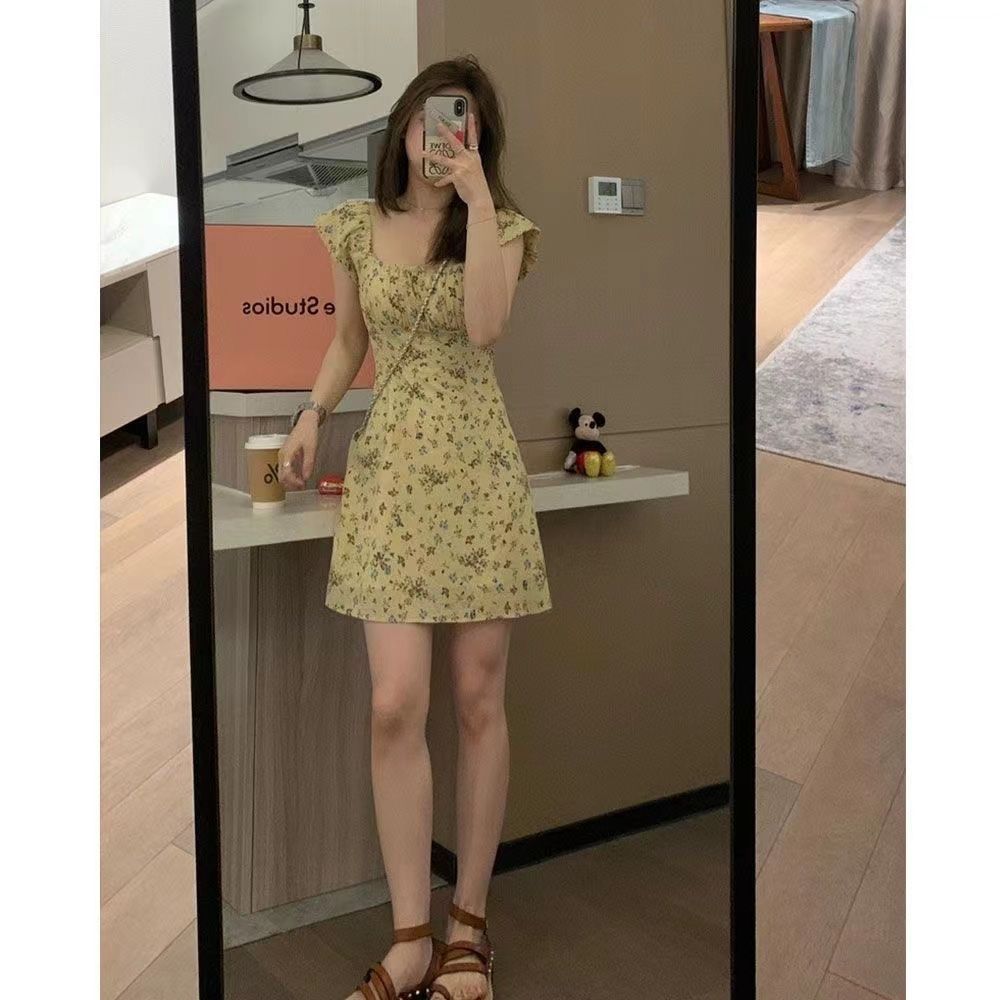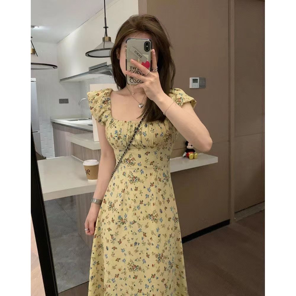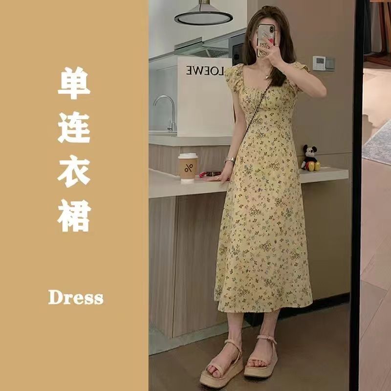 法式小飞袖连衣裙女2024夏季新款碎花裙收腰显瘦方领初恋长裙
