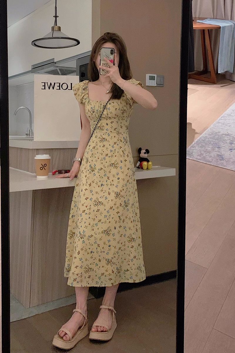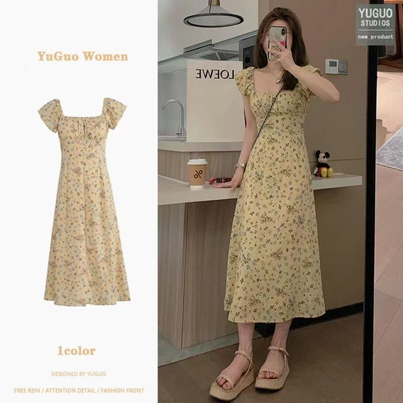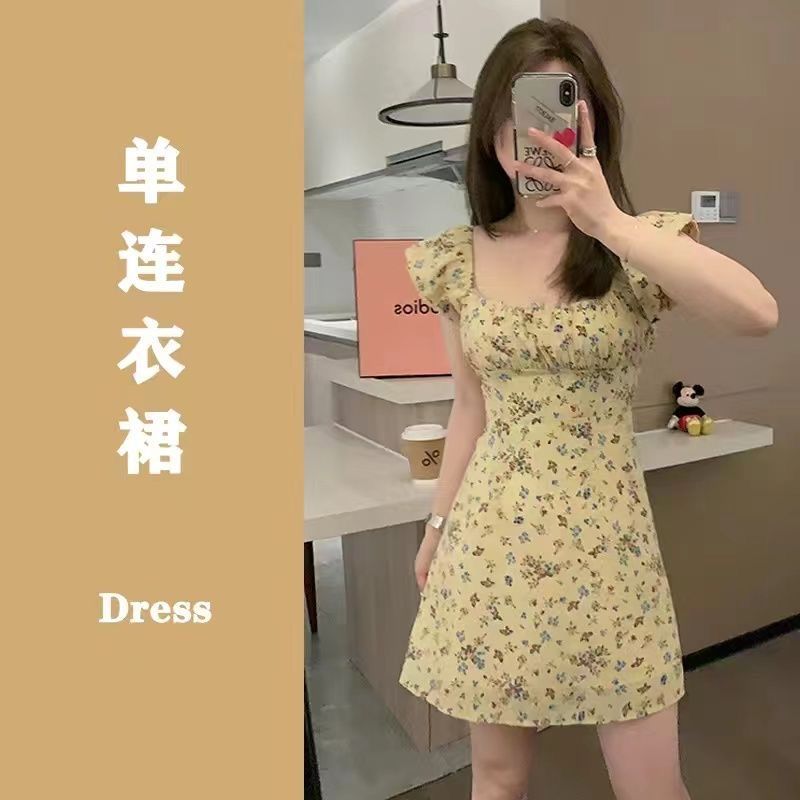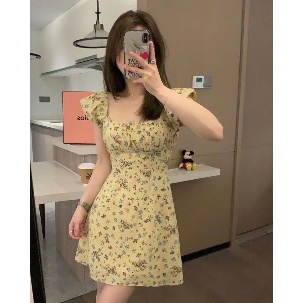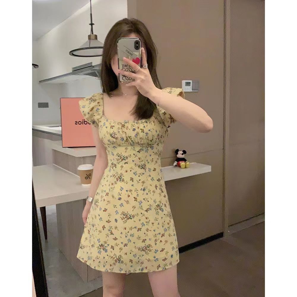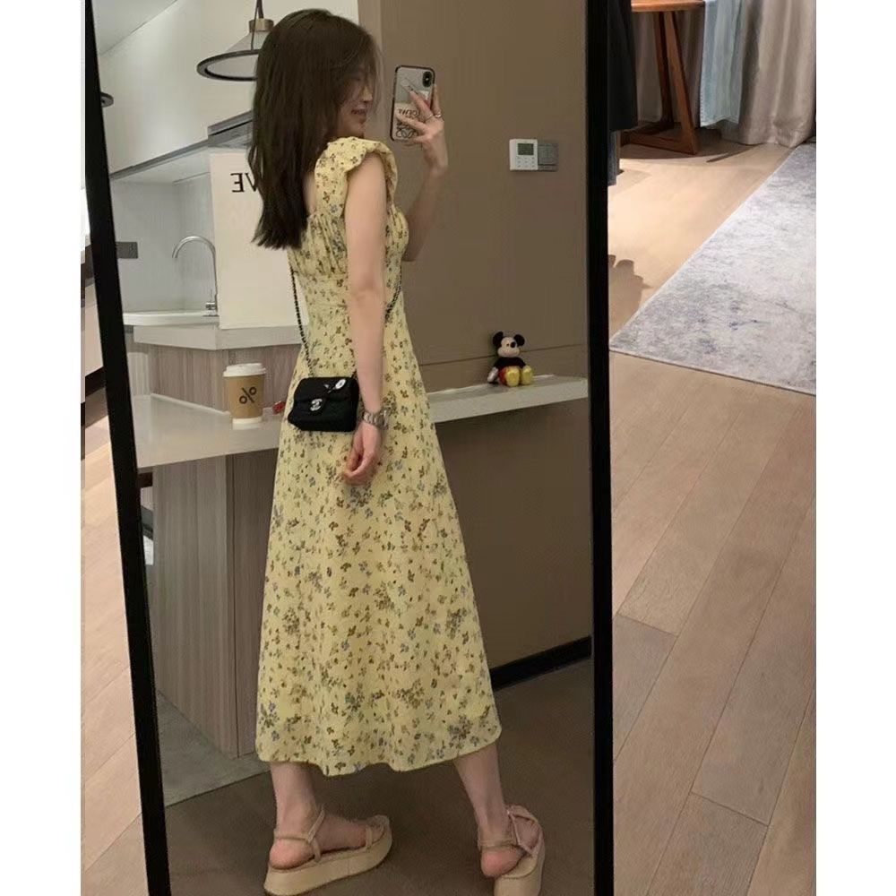 法式小飞袖连衣裙女2024夏季新款碎花裙收腰显瘦方领初恋长裙