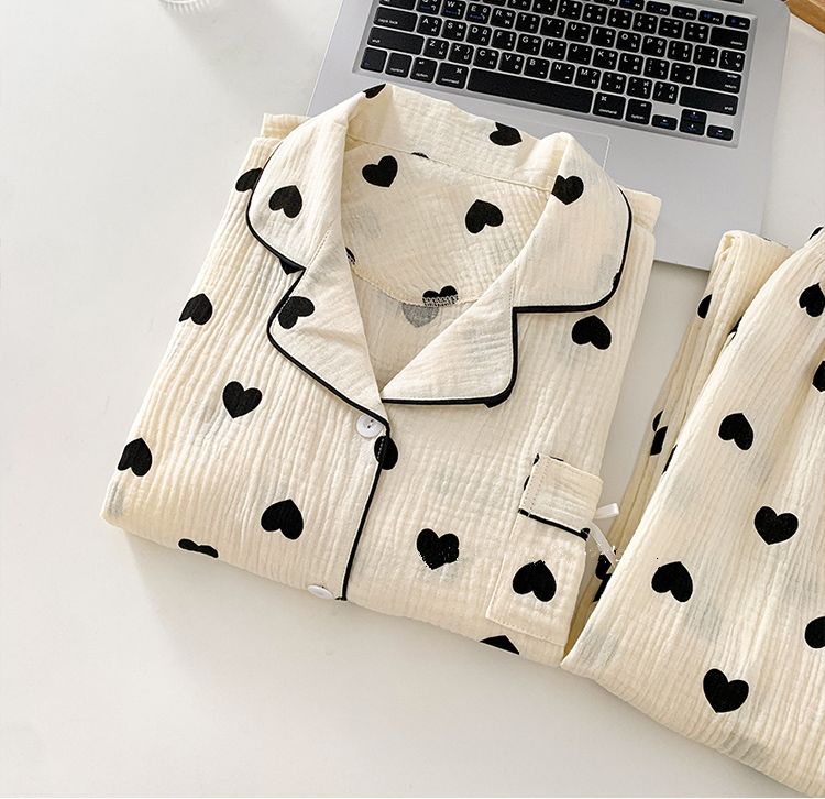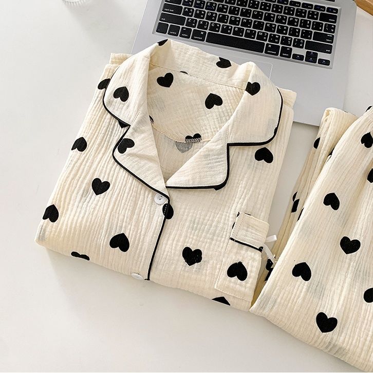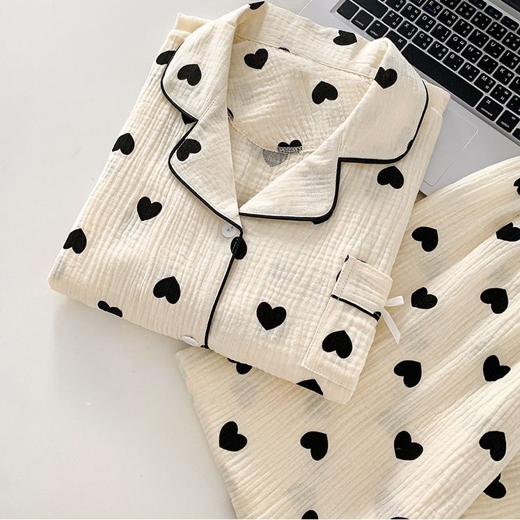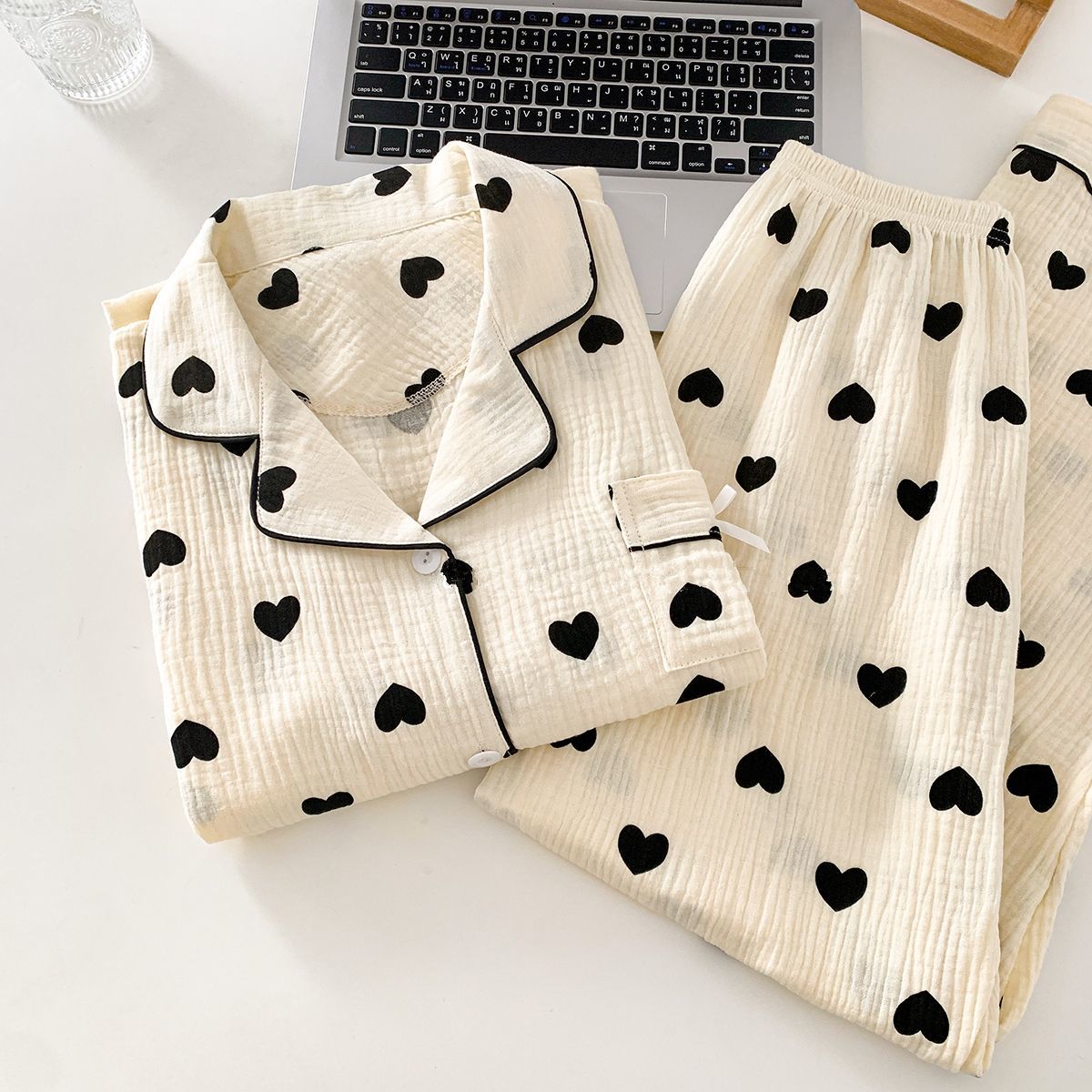 网红爆款睡衣女春秋季长袖长裤宽松泡泡皱爱心可外穿家居服两件套