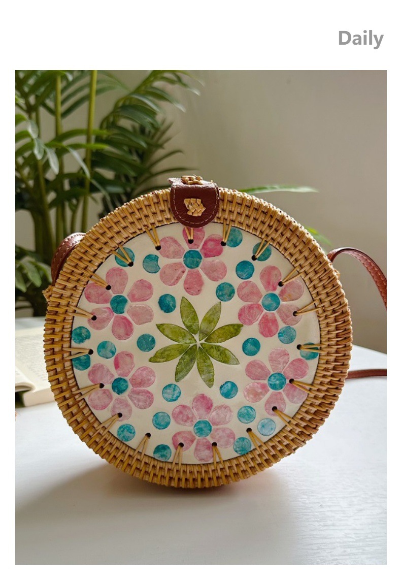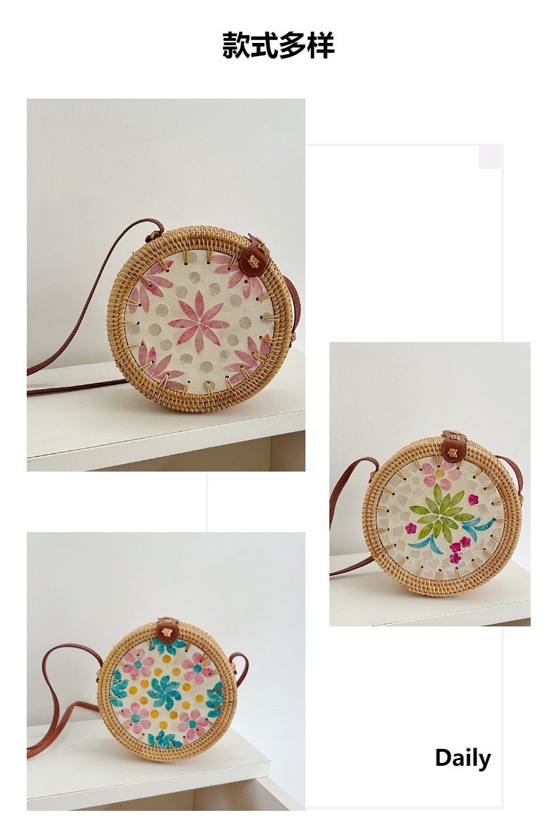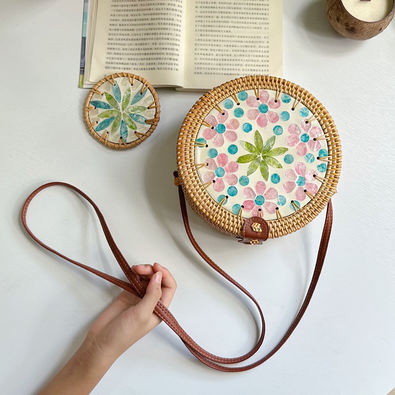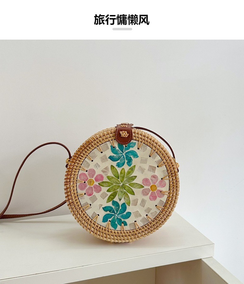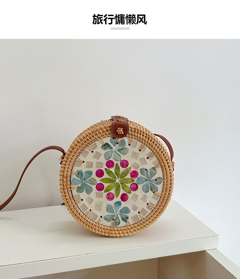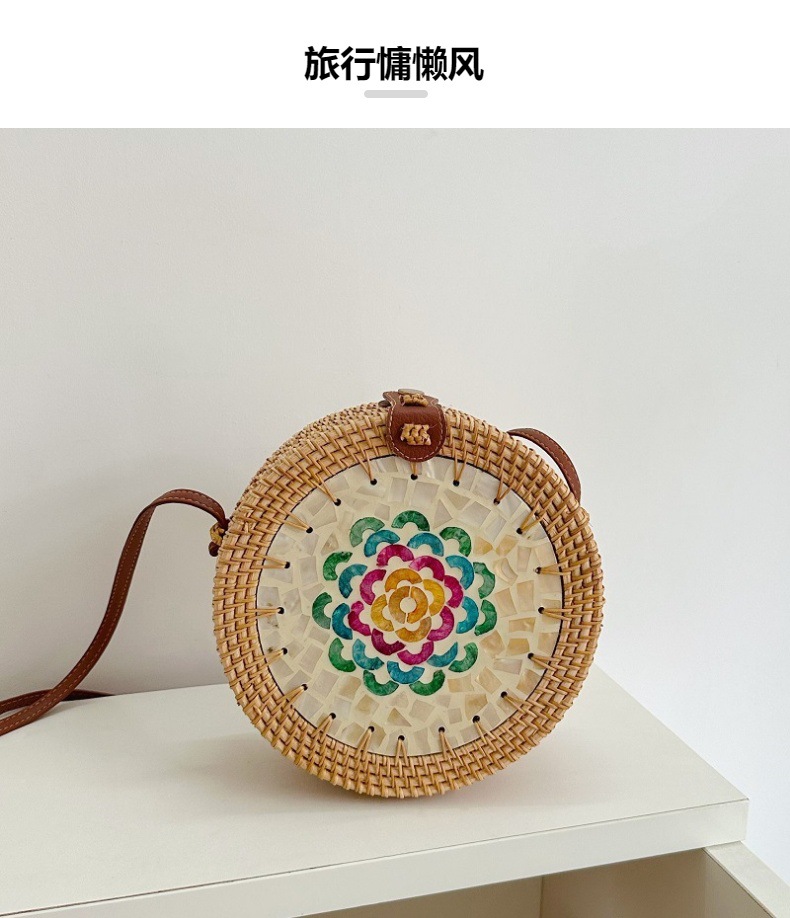 秋藤编织ins风圆形彩色贝壳拼接包女单肩斜挎包沙滩草编包