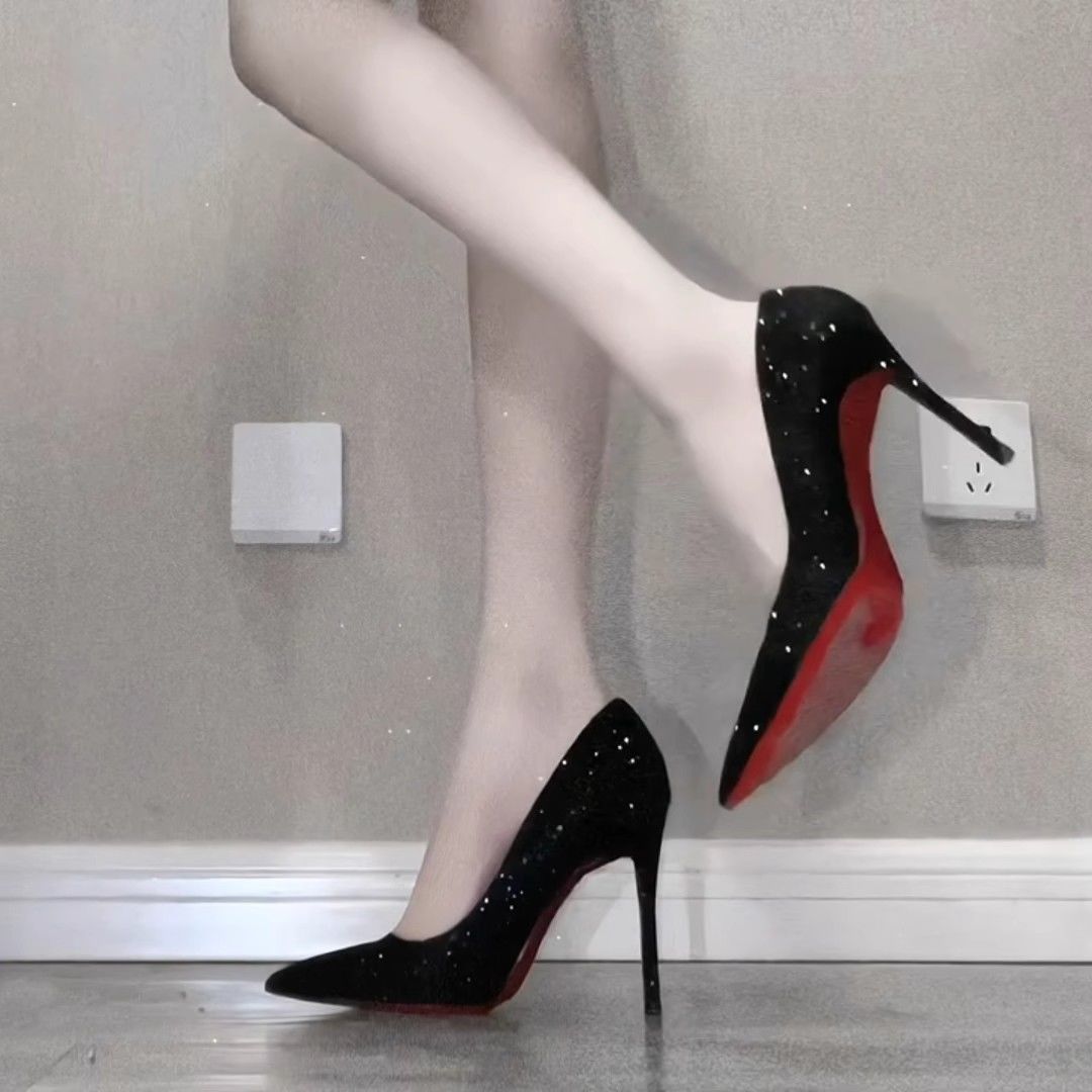 2025年新款亮片尖头高跟鞋黑色配礼服百搭小众气质细跟不累脚单鞋