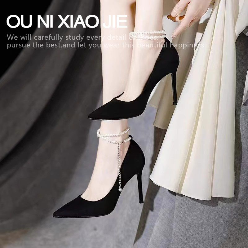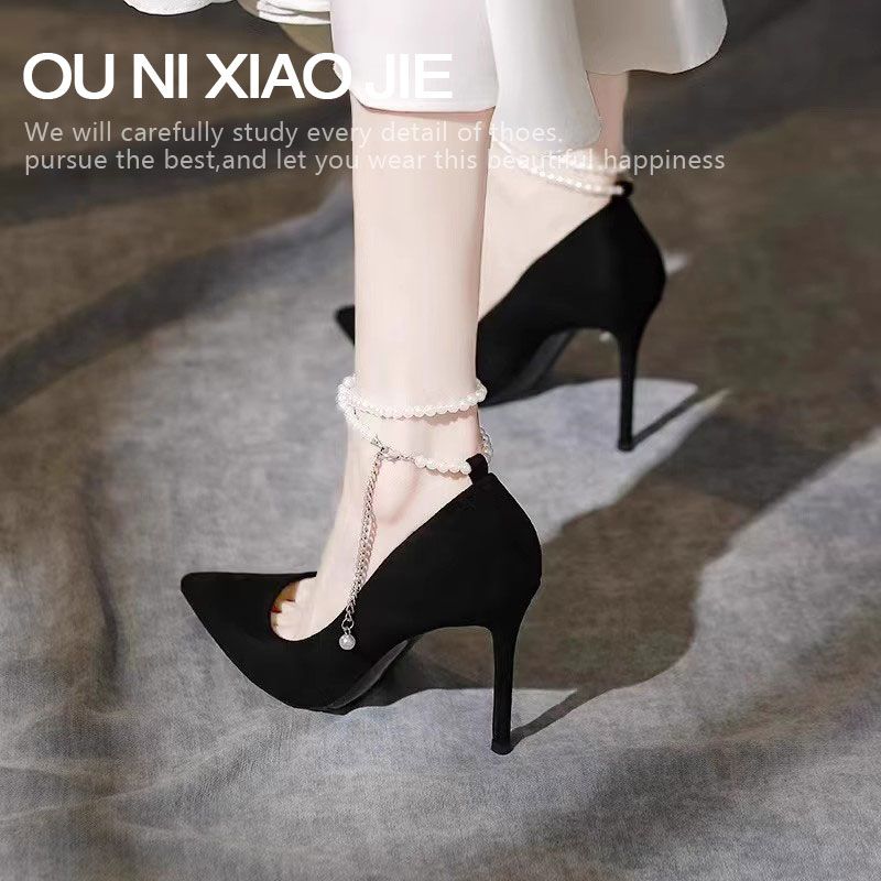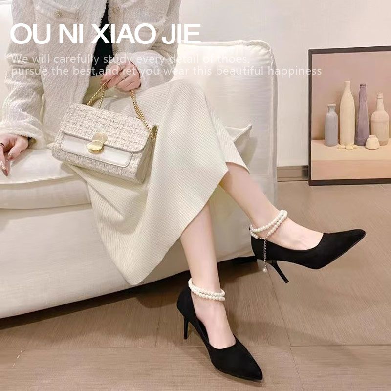 2024秋季新款尖头珍珠高跟鞋细跟浅口绒面百搭单鞋女性感一字带扣