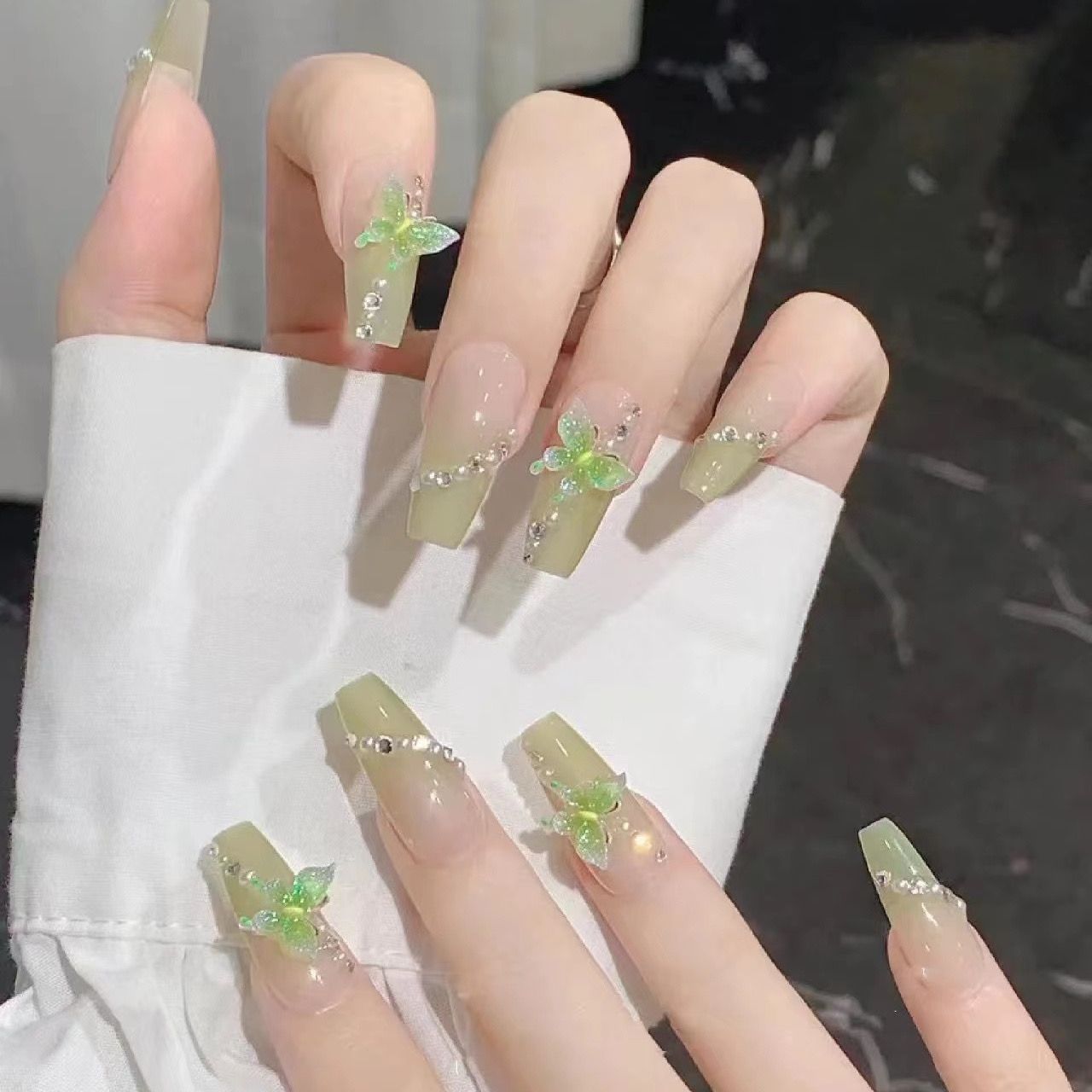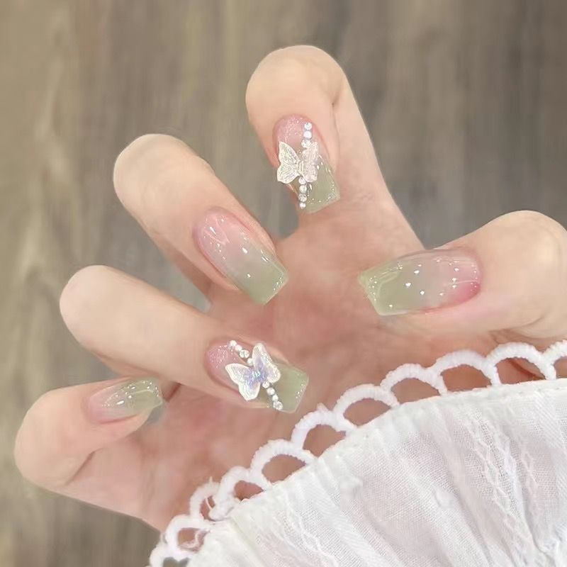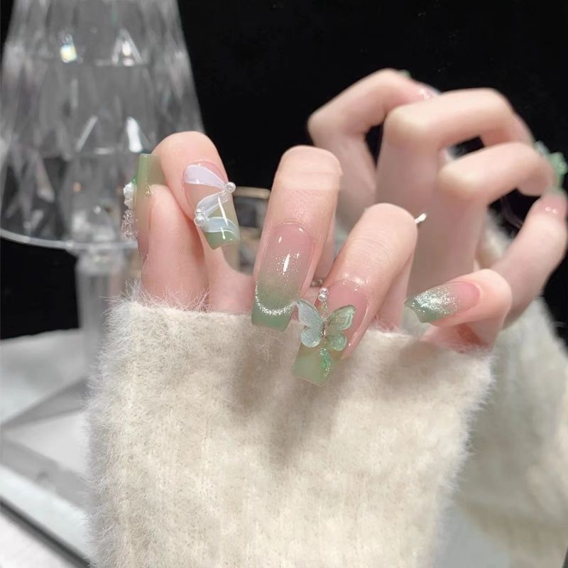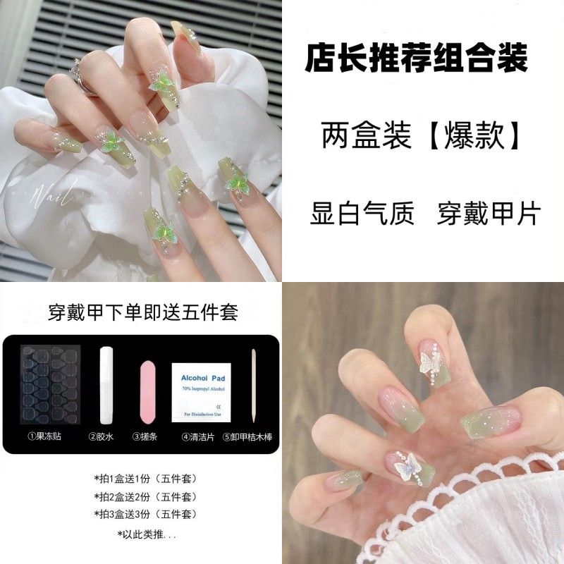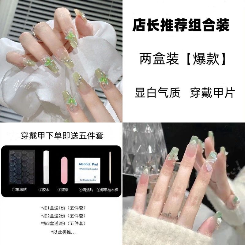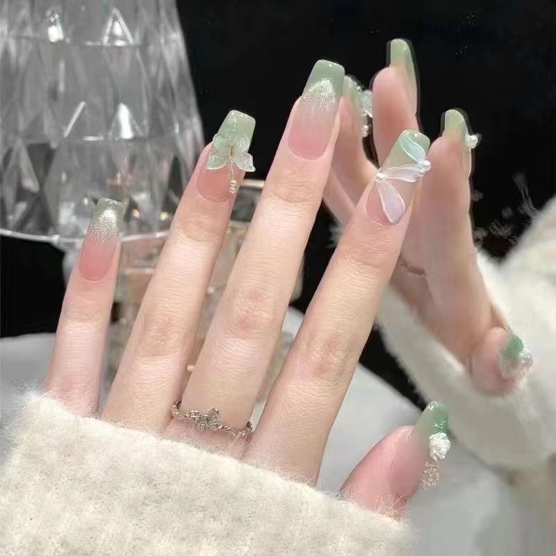 小清新浅绿渐变美甲甲片珍珠蝴蝶指甲贴片长款穿戴甲ins风甲片