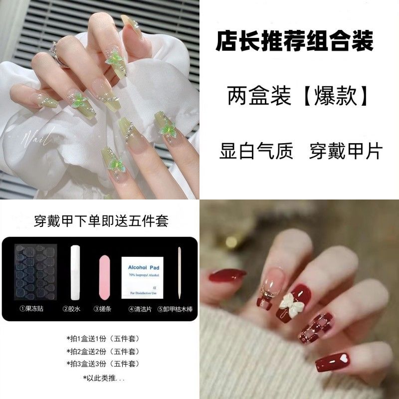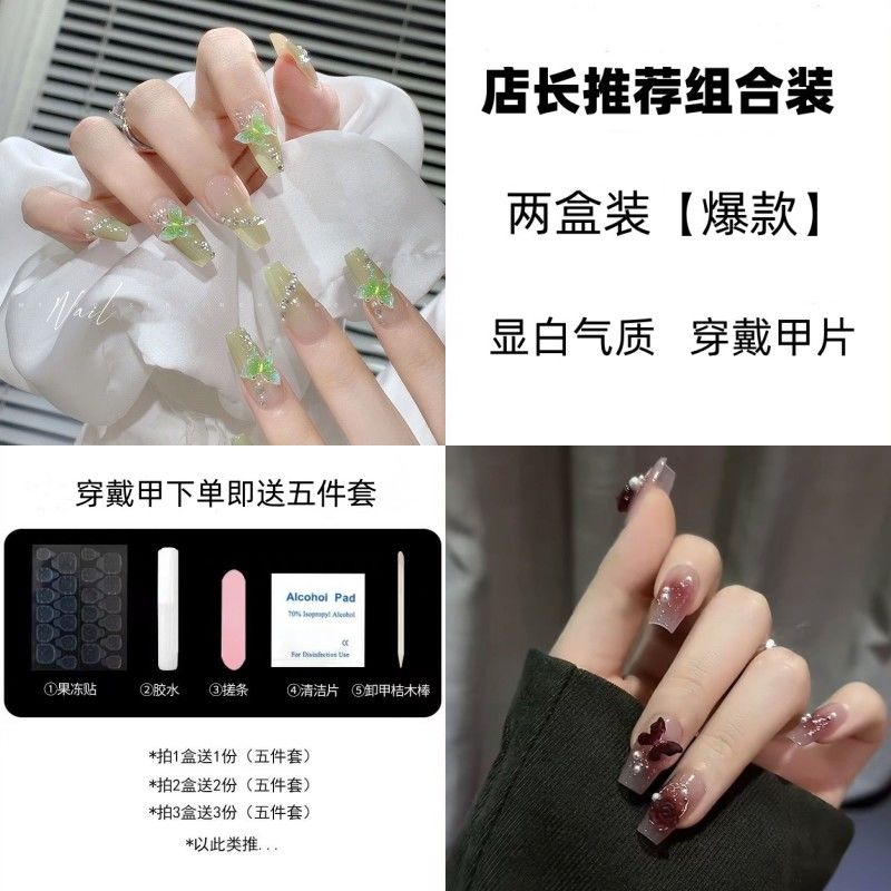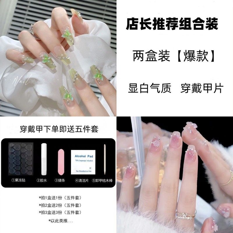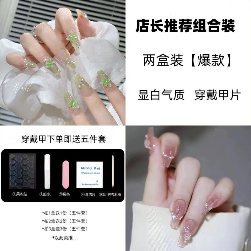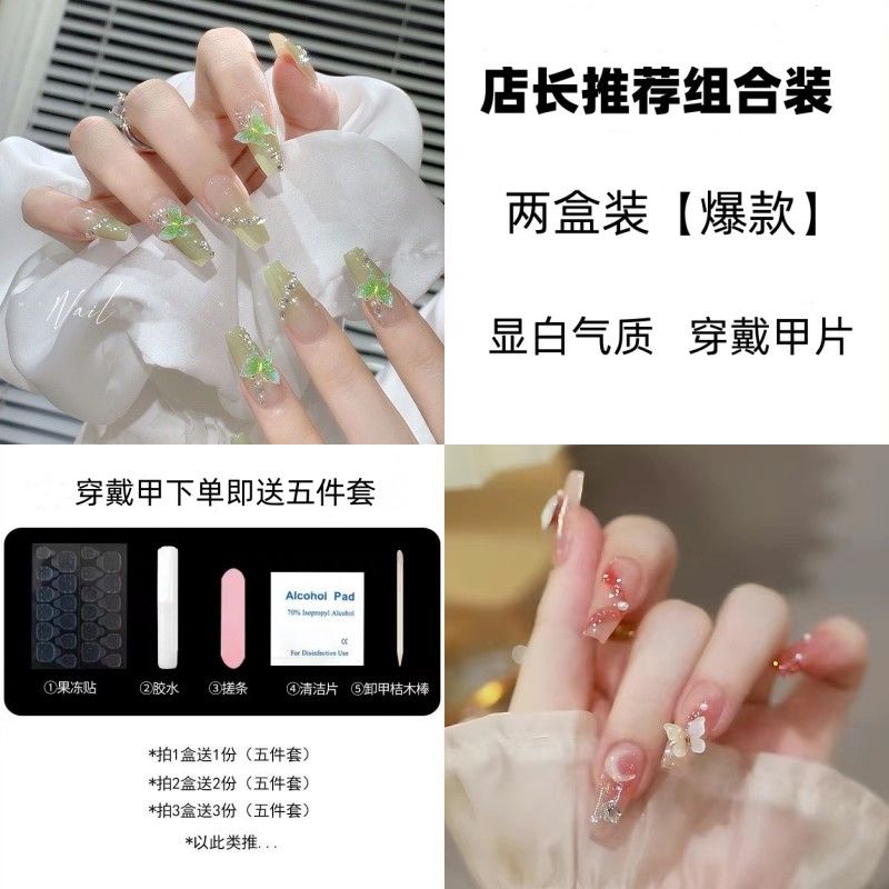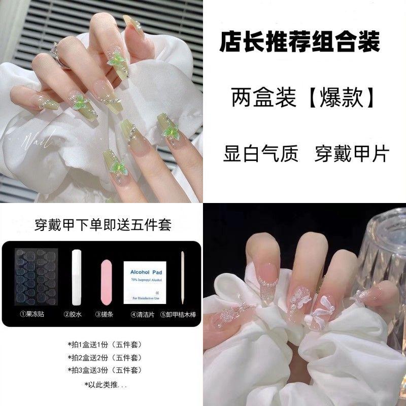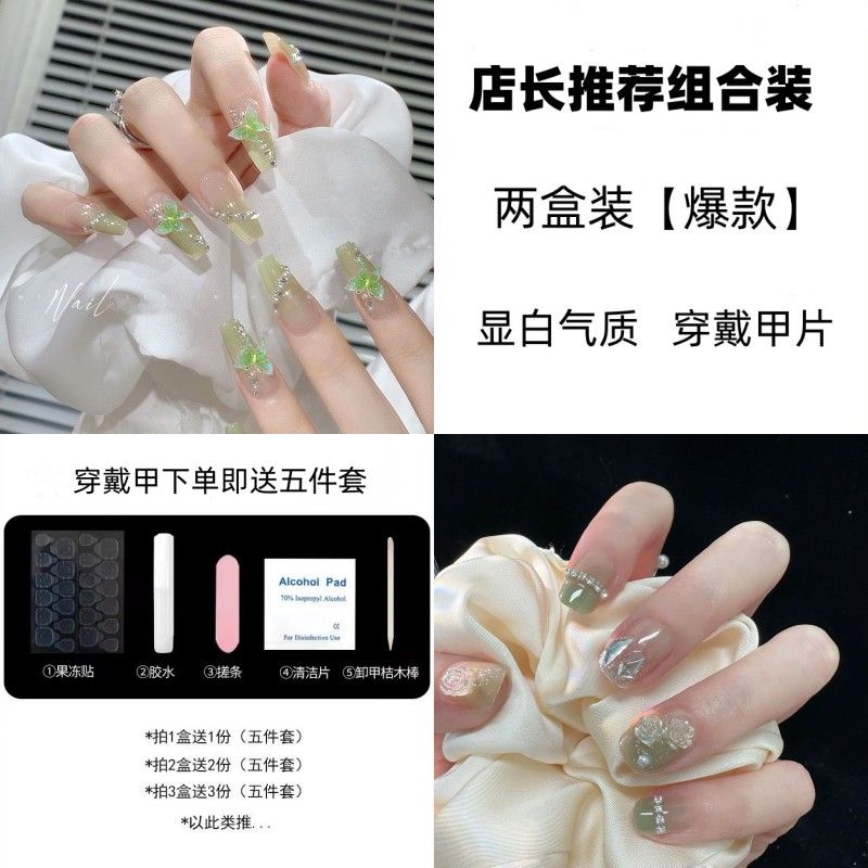 小清新浅绿渐变美甲甲片珍珠蝴蝶指甲贴片长款穿戴甲ins风甲片