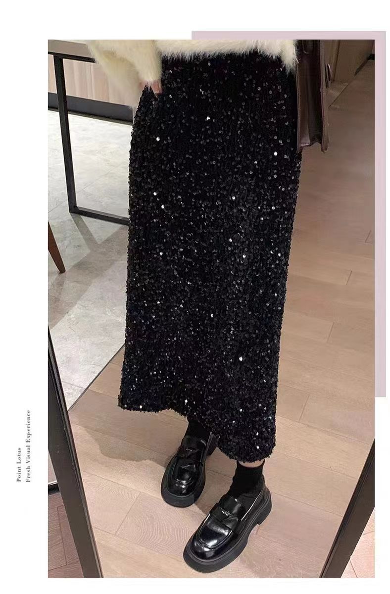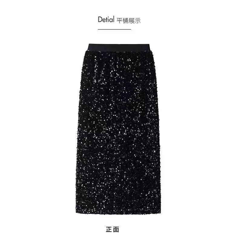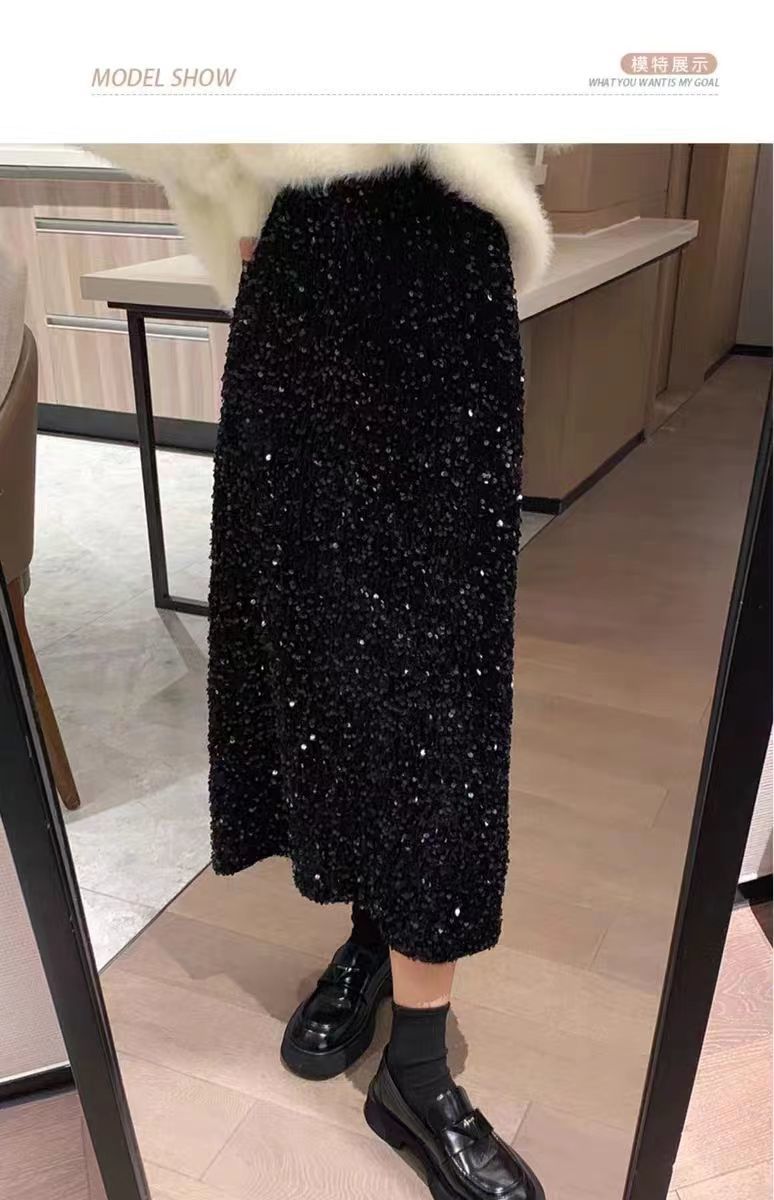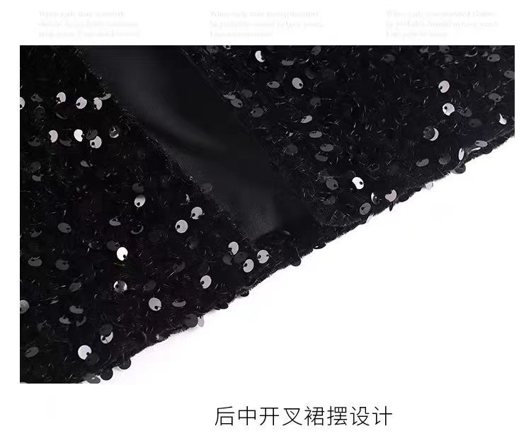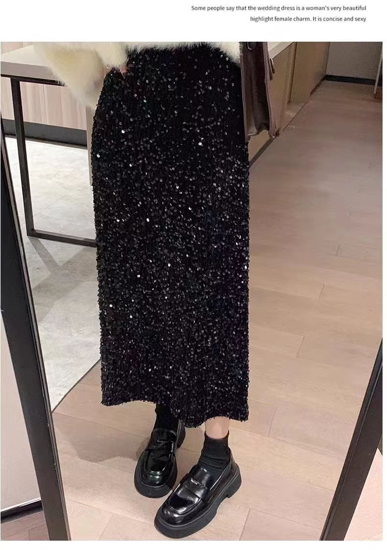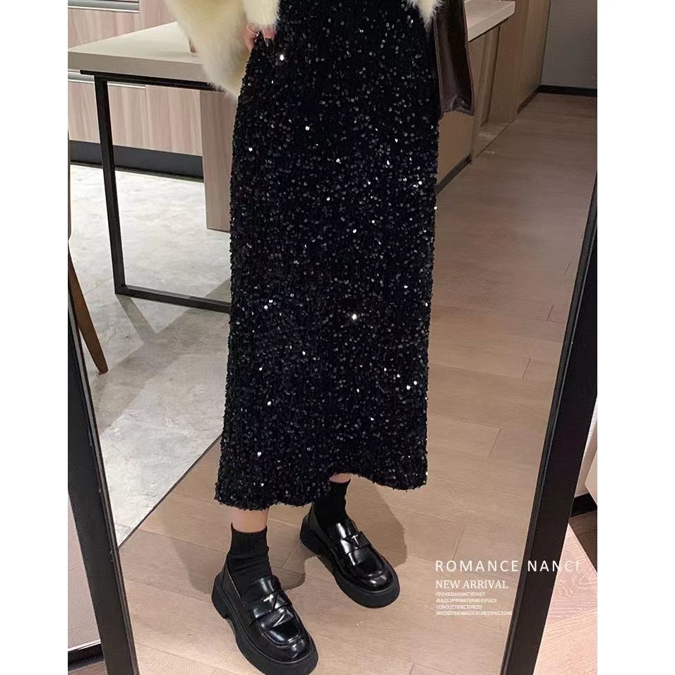 丝绒亮片半身裙女春秋冬季亮闪高腰开衩半裙今年流行爆款黑色长裙