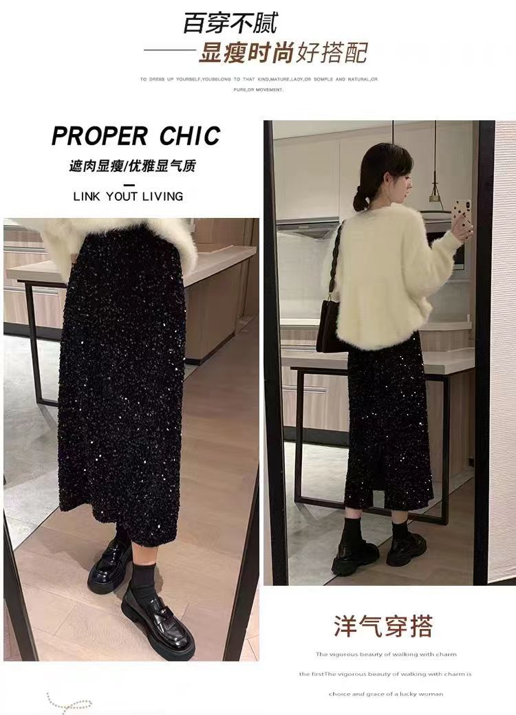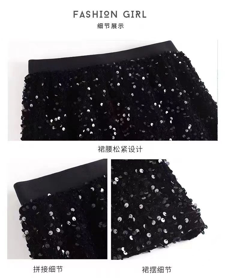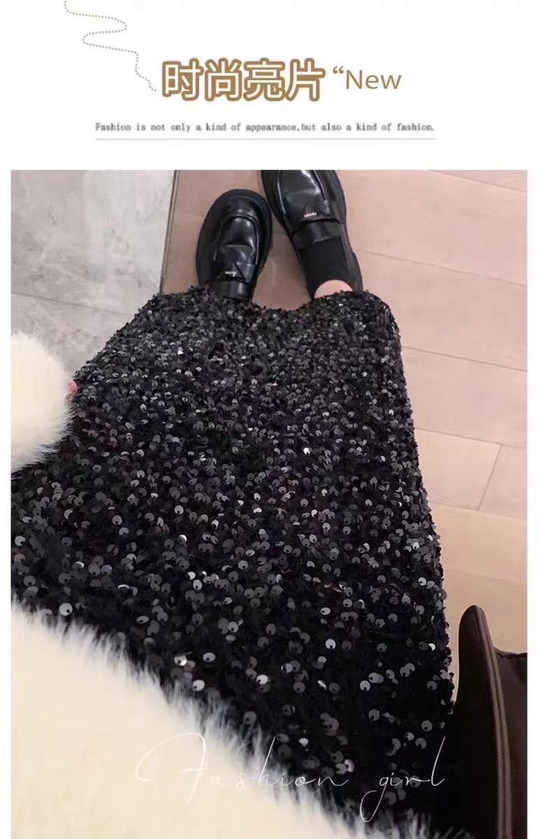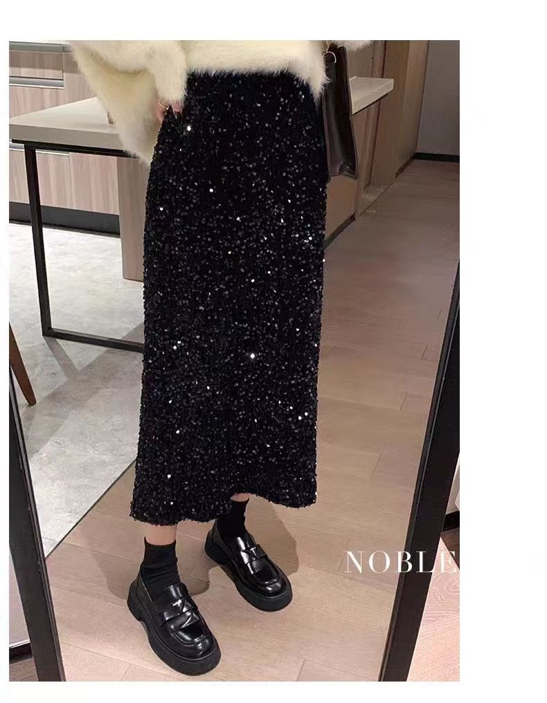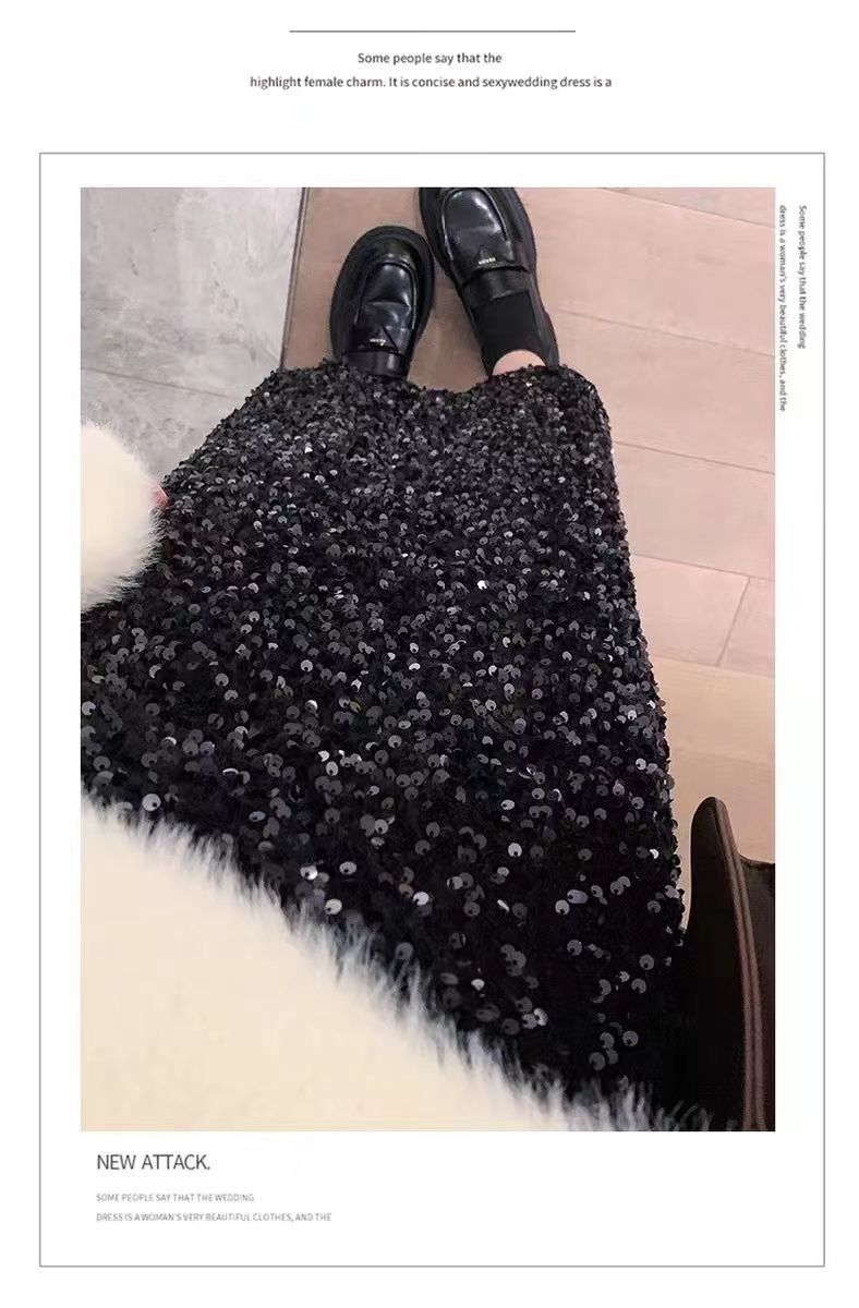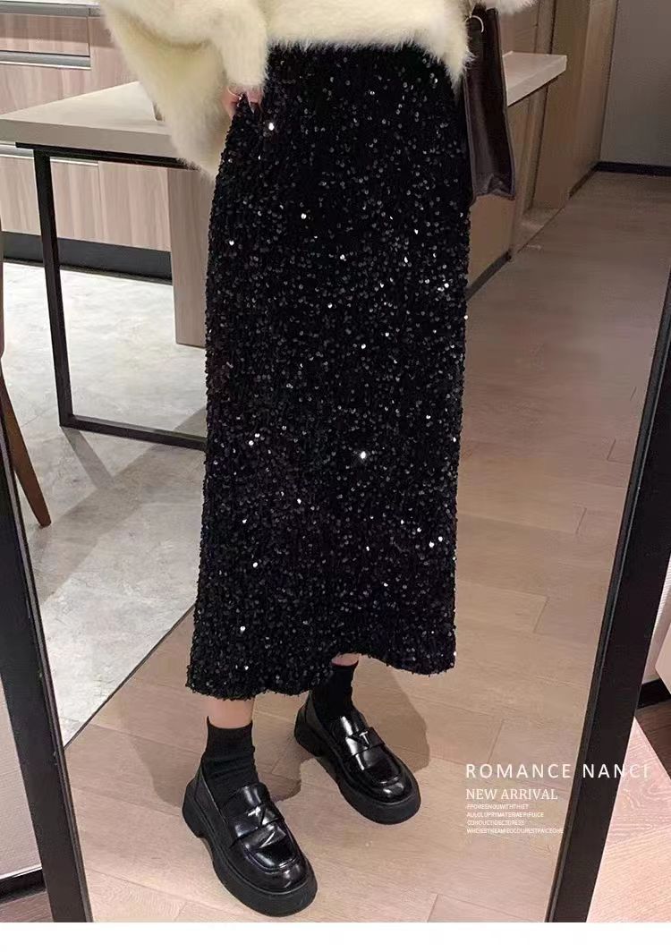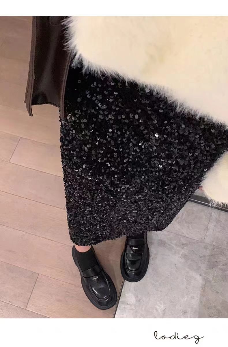 丝绒亮片半身裙女春秋冬季亮闪高腰开衩半裙今年流行爆款黑色长裙
