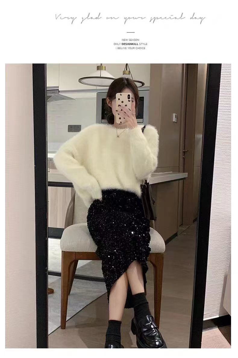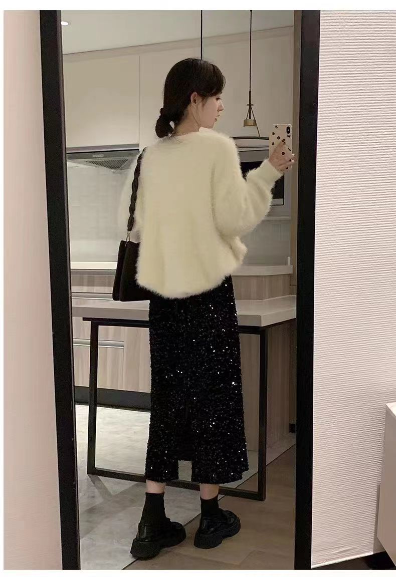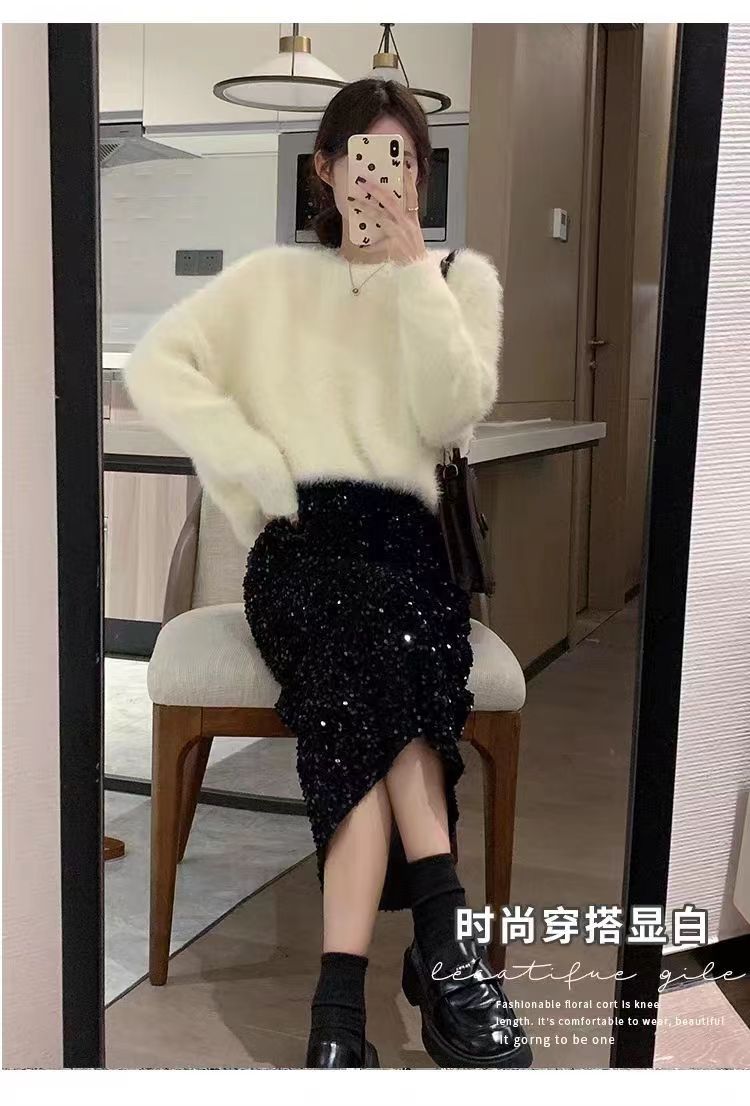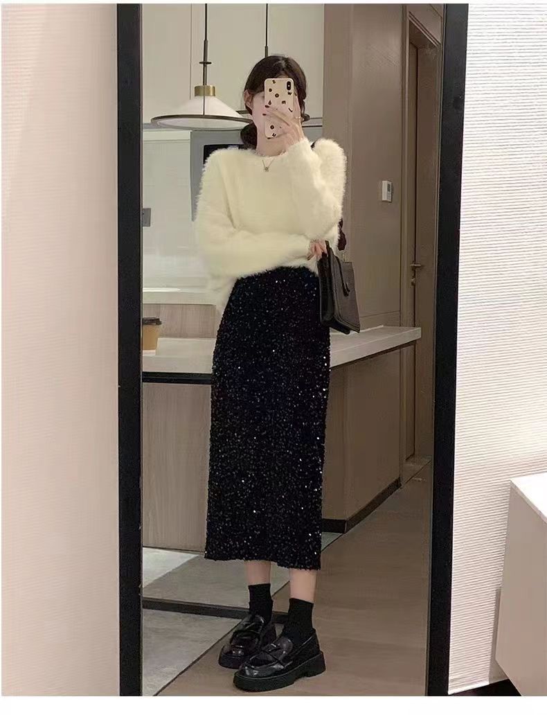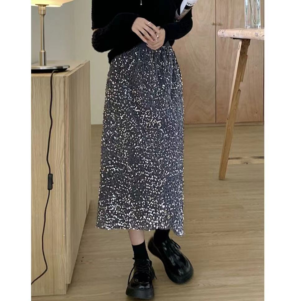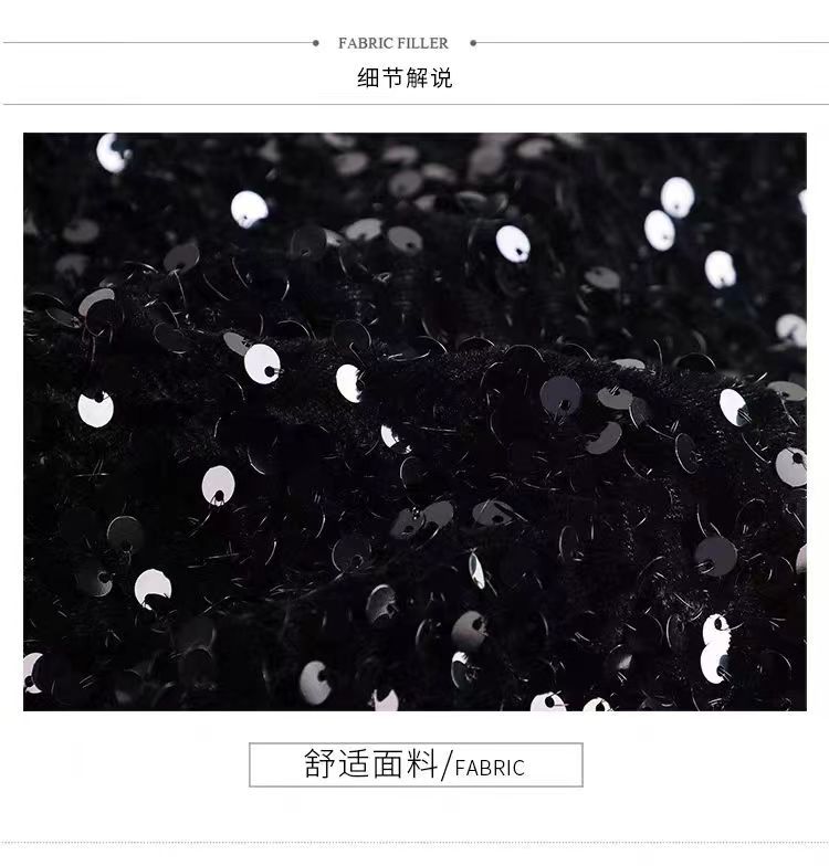 丝绒亮片半身裙女春秋冬季亮闪高腰开衩半裙今年流行爆款黑色长裙