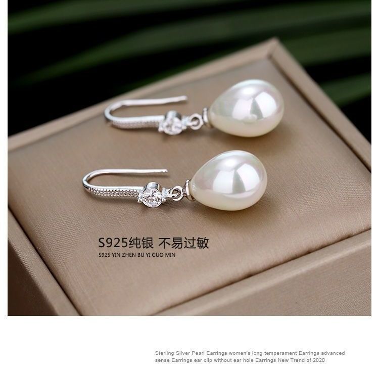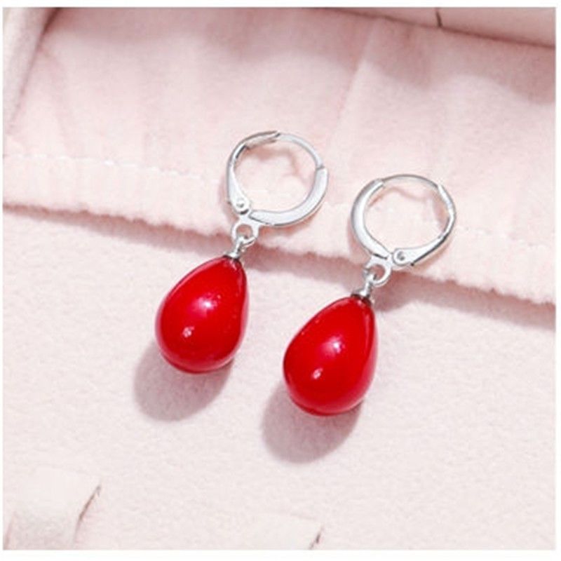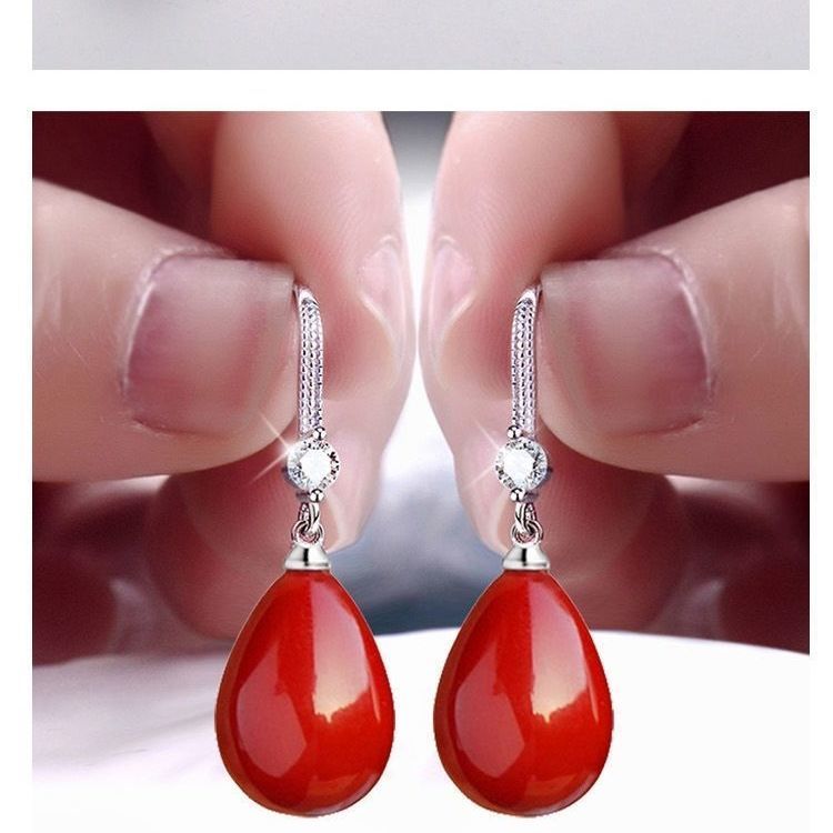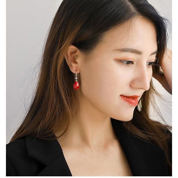 s925纯银耳环珍珠韩国长款本命年大红色新娘耳坠气质耳饰防过