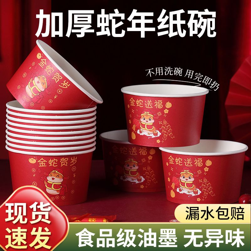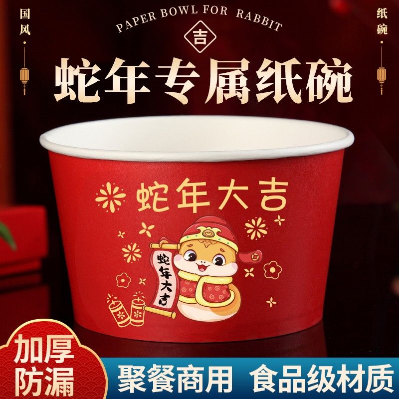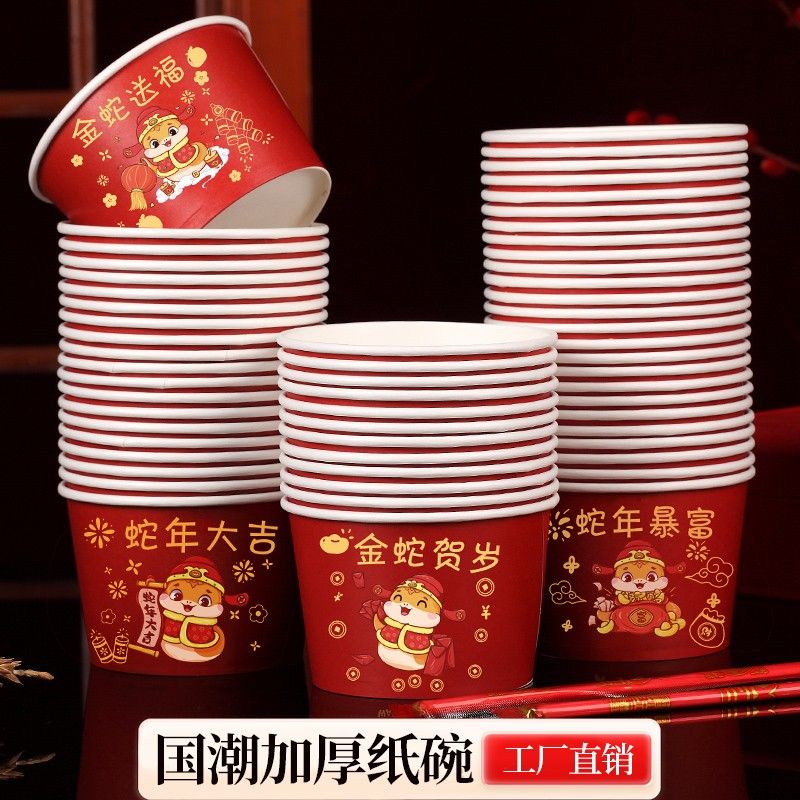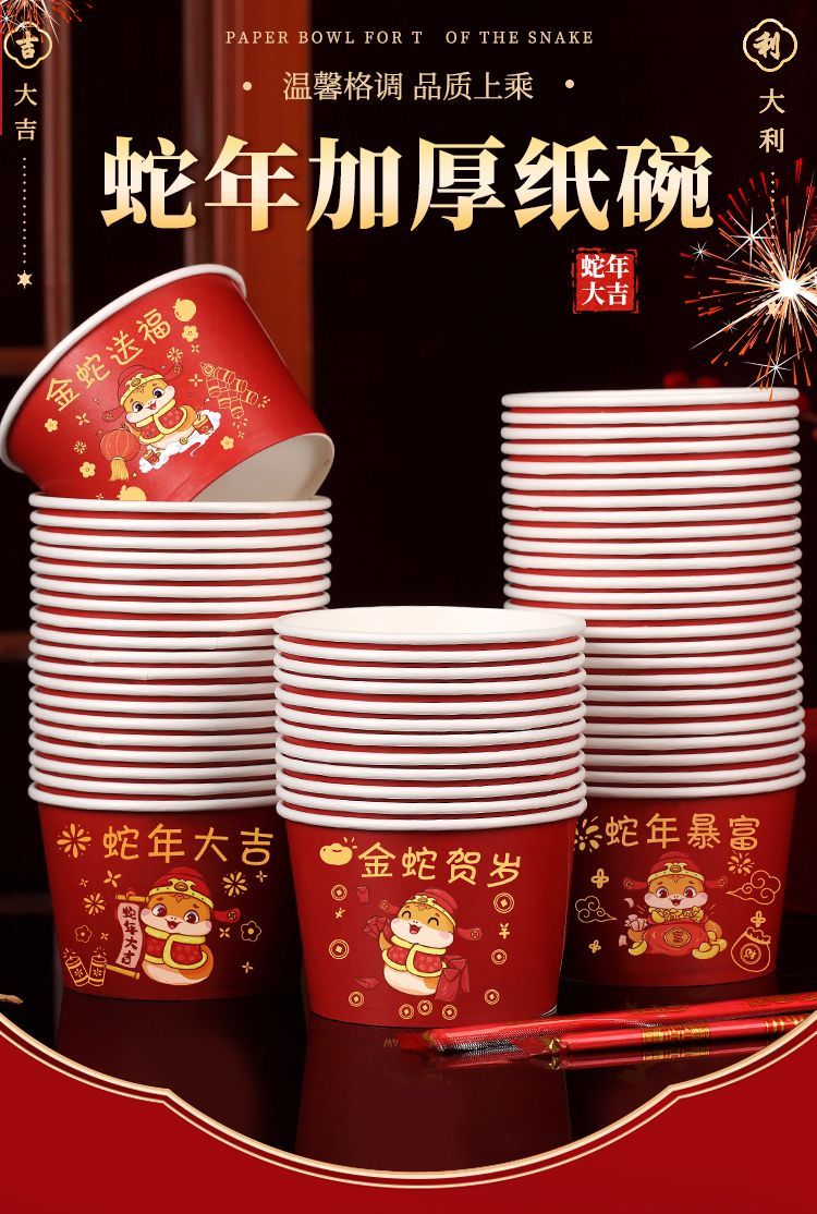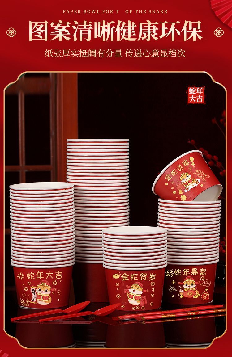 2025新年纸碗春节蛇年一次性碗筷套装加厚红色过年家用打包盒饭碗
