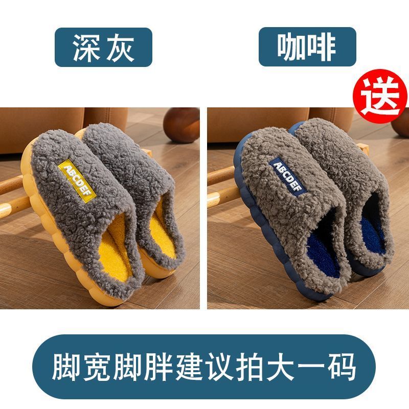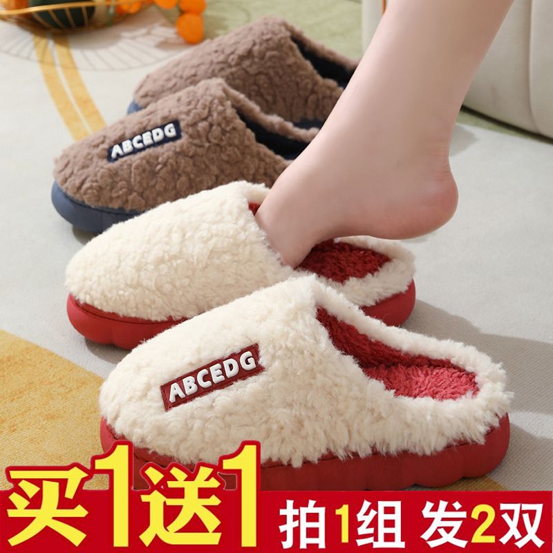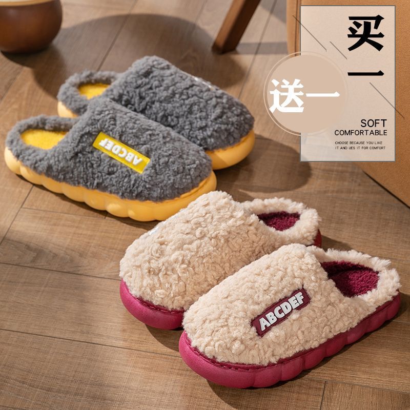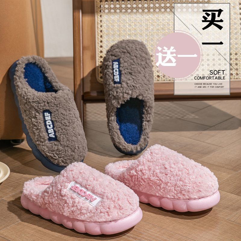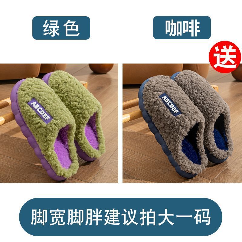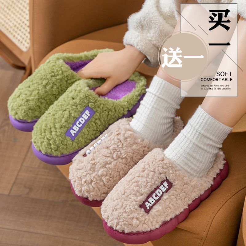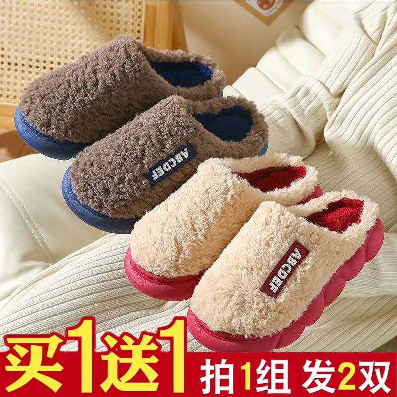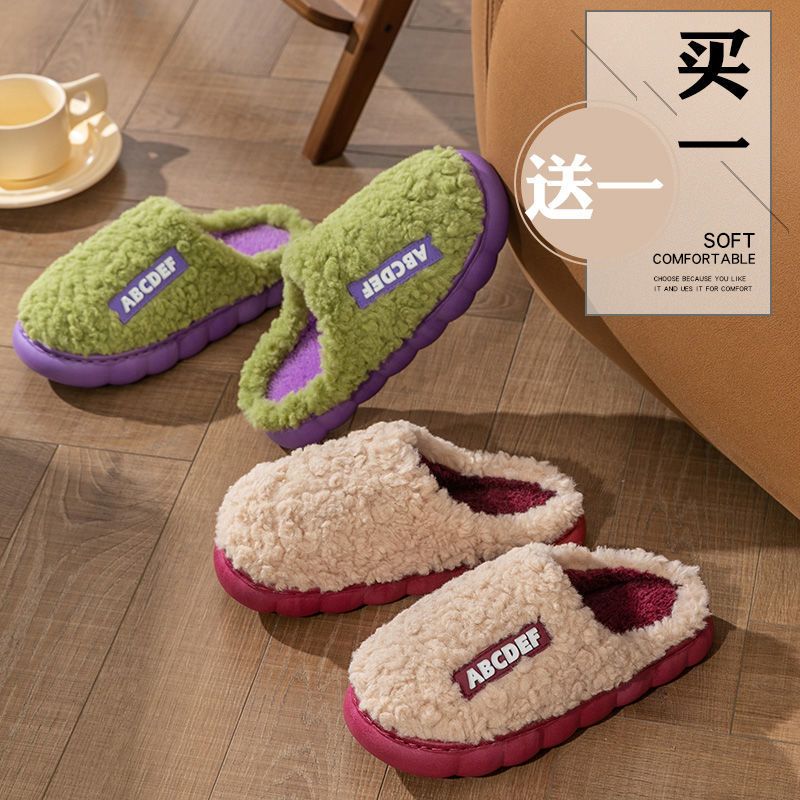 买一送一美拉德冬季手工棉拖鞋女居家防滑保暖拼色毛绒棉拖鞋男款