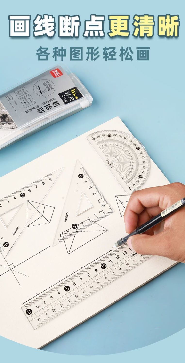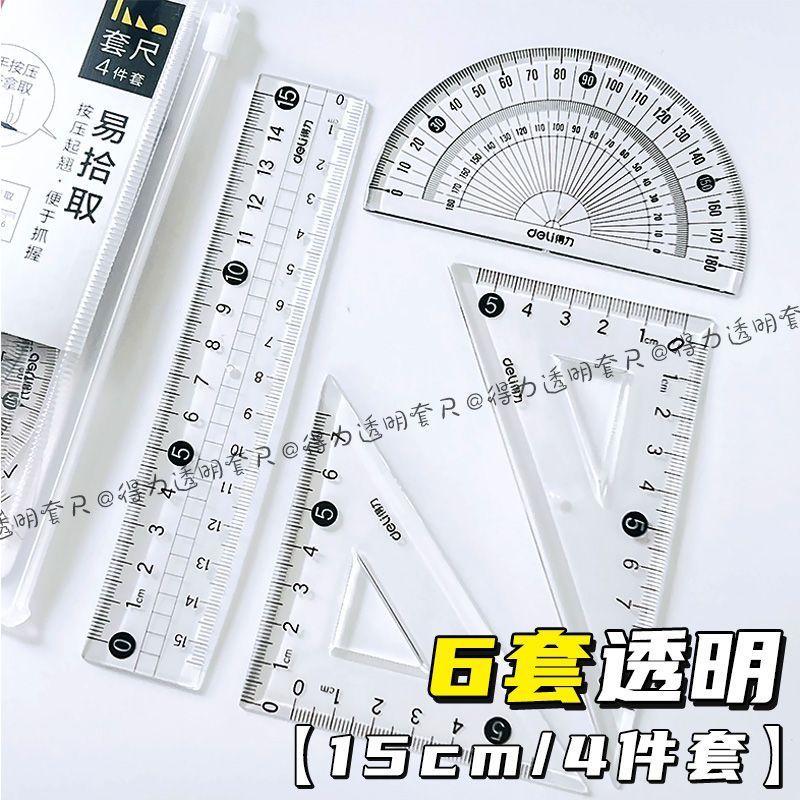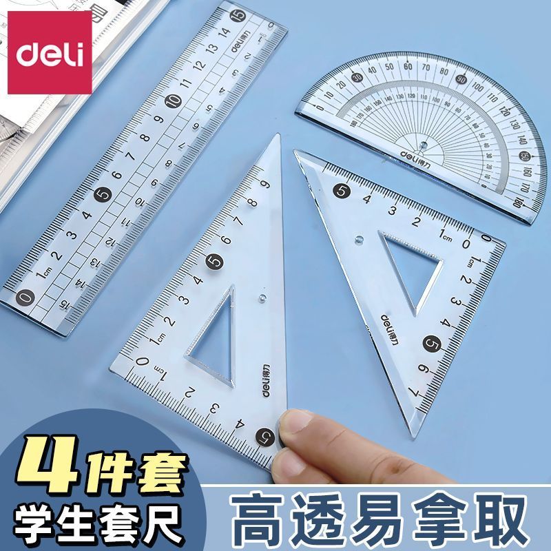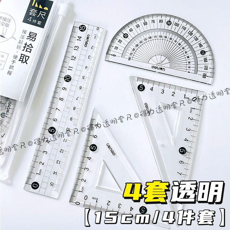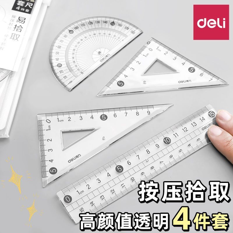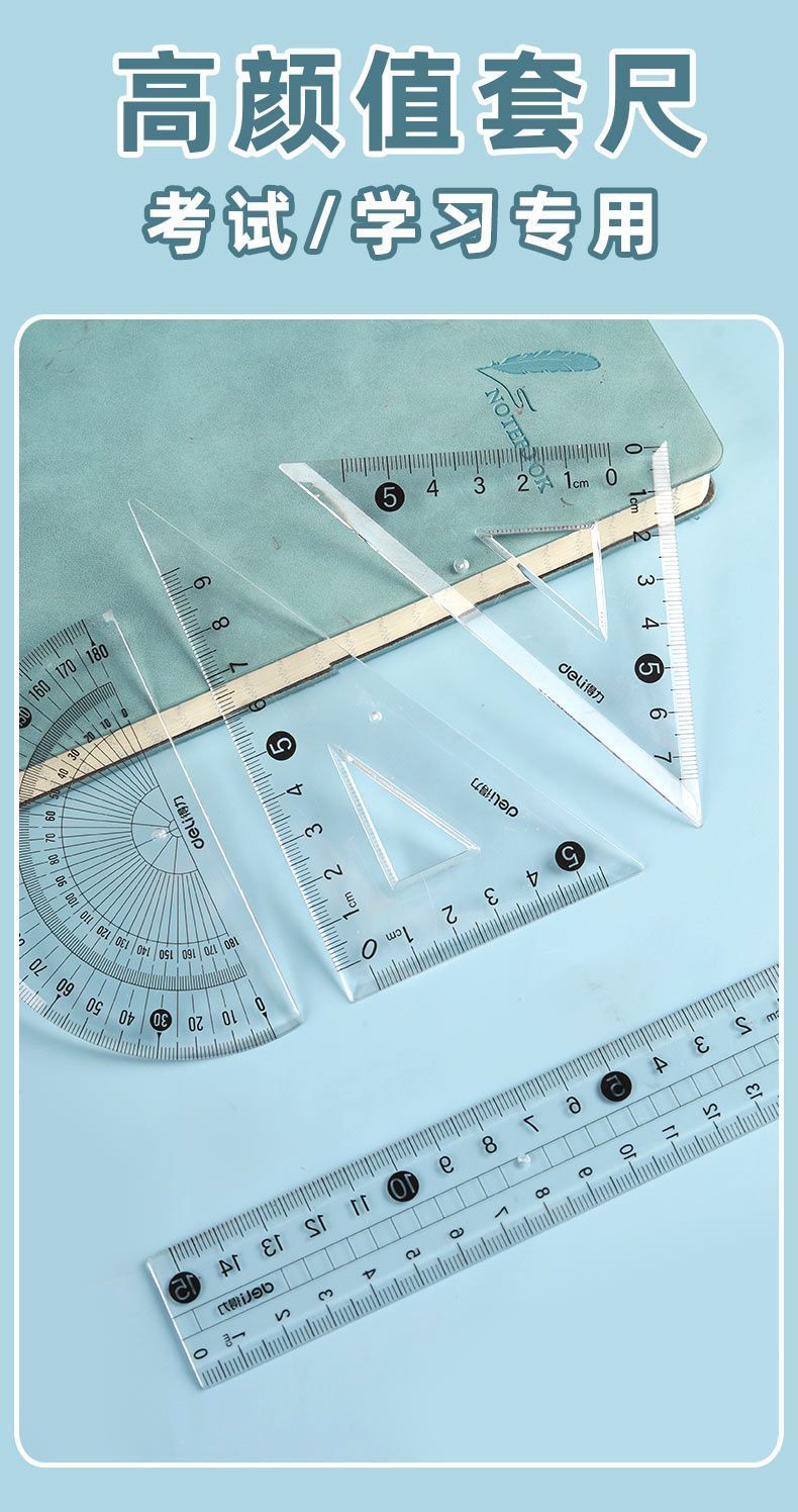 得力透明套尺ins高颜值学生直尺三角尺量角器尺子四件套考试套装