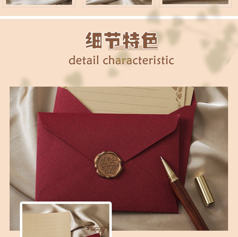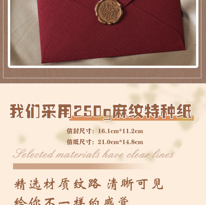 | B款-3个信封+10信纸+3火漆贴(红麻布) | USD $3.05 | 999999 piece available |