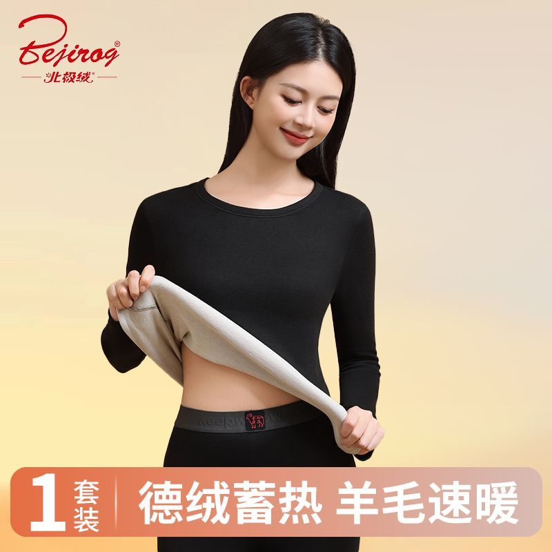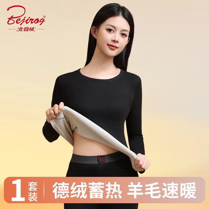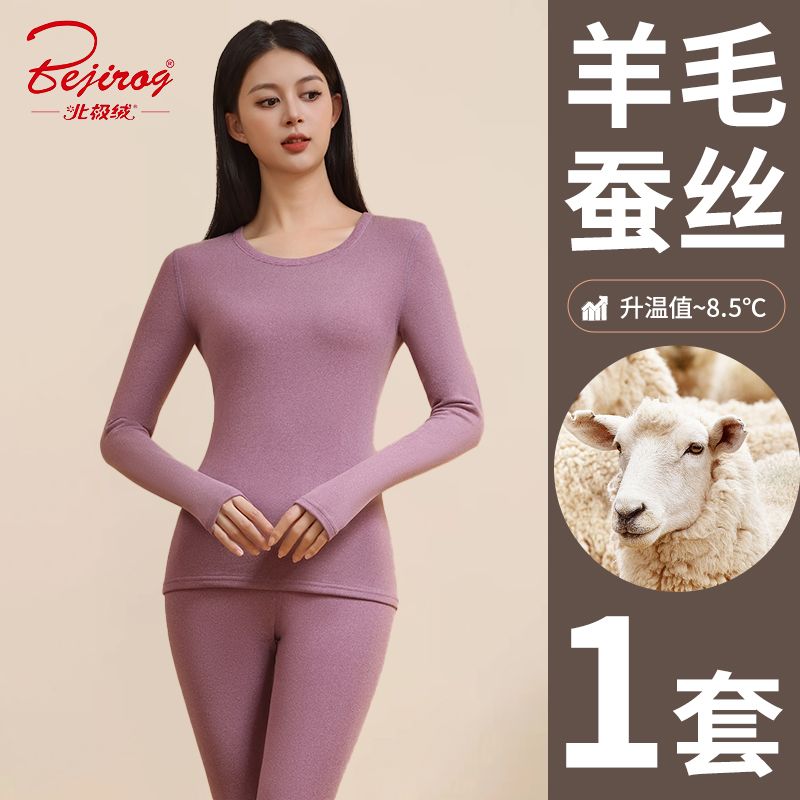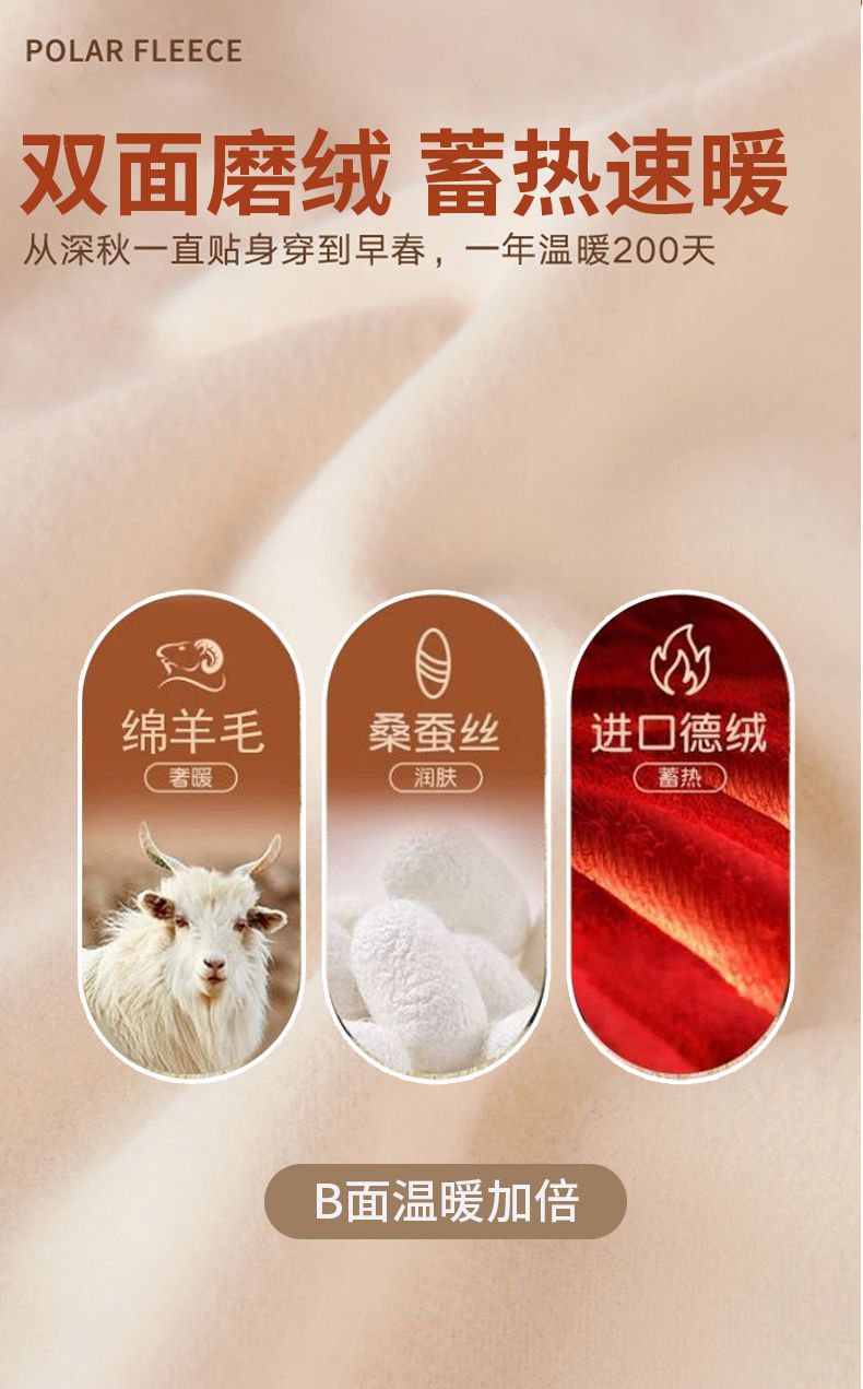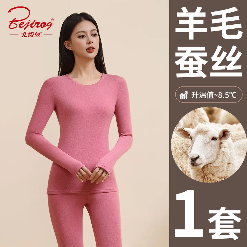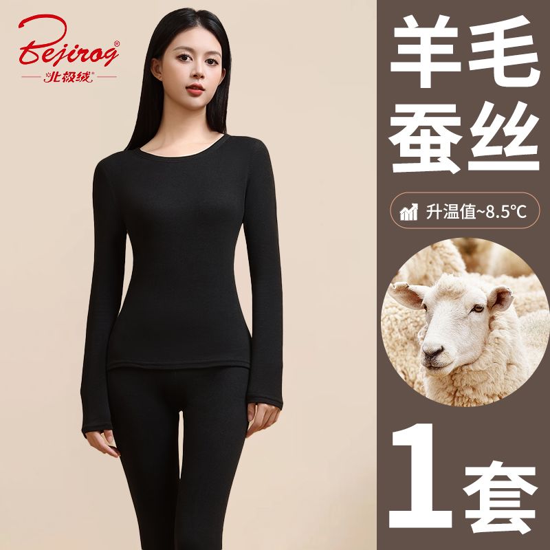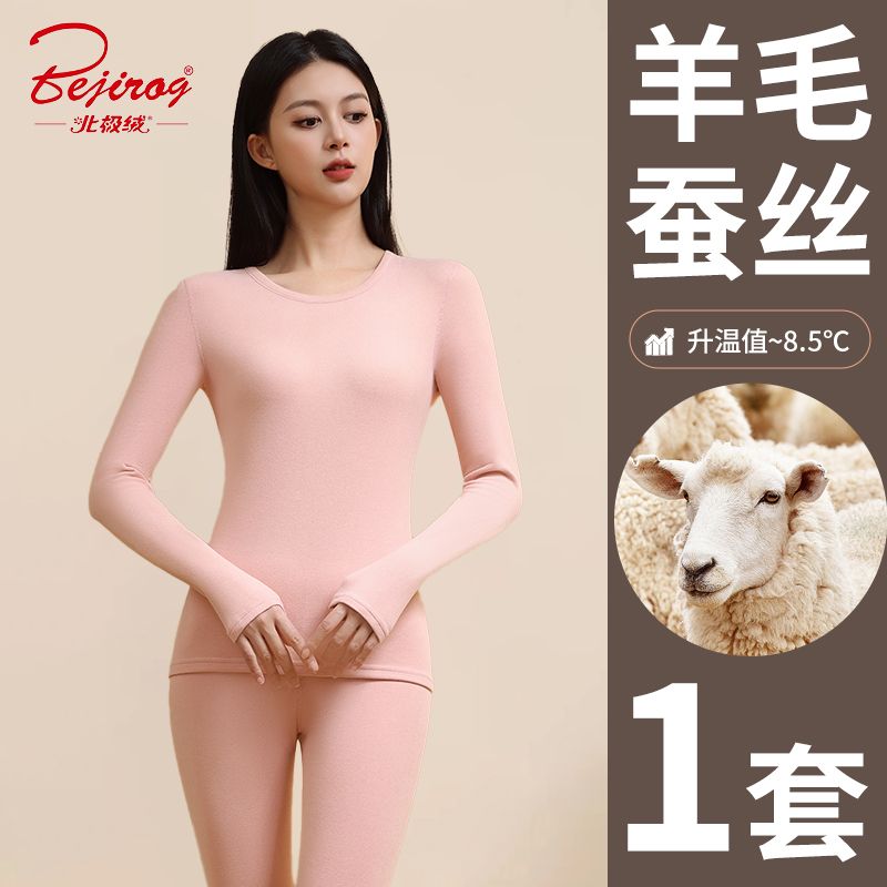 羊毛蚕丝园领保暖内衣双面德绒发热女款秋衣秋裤套装加绒加厚女士