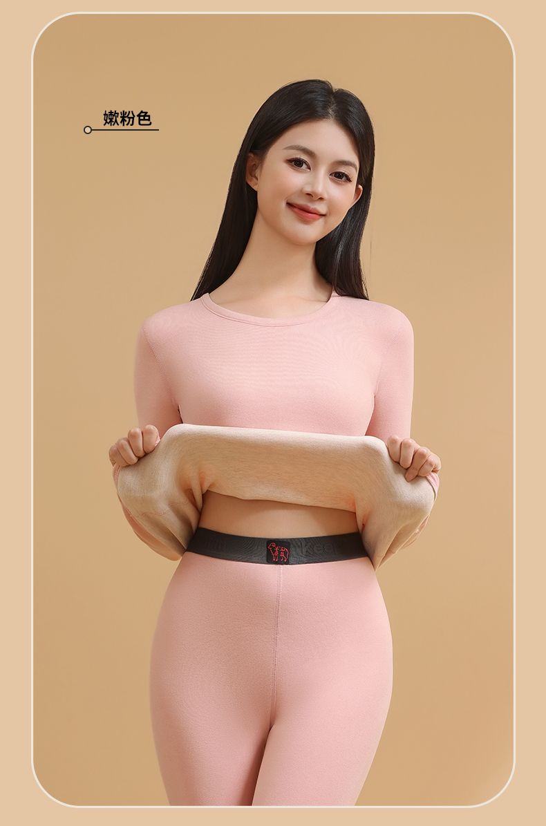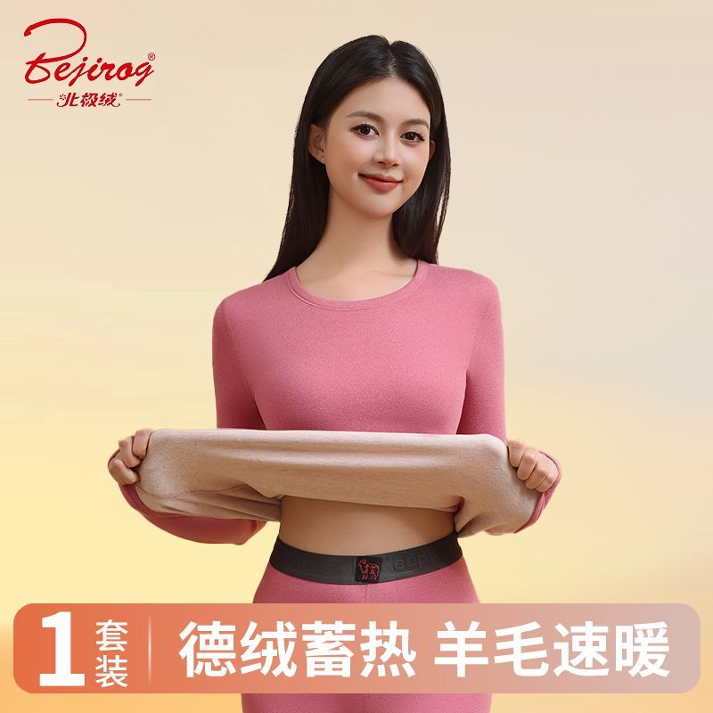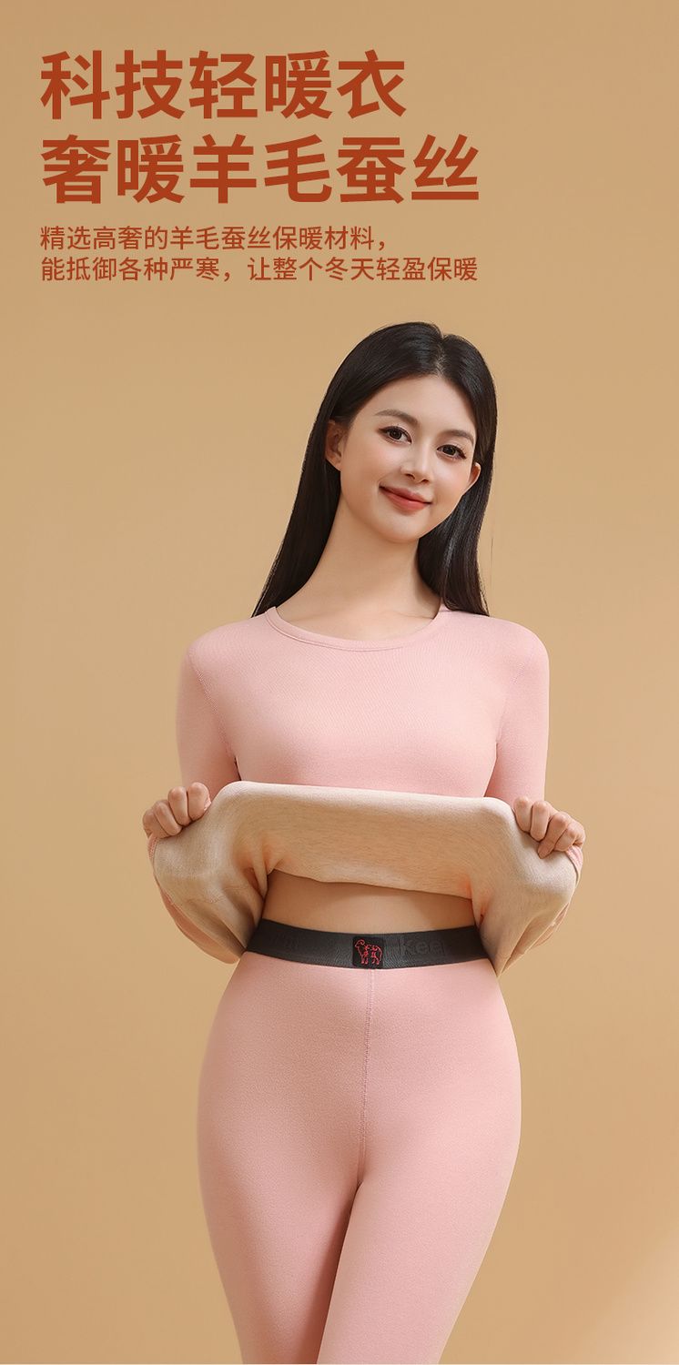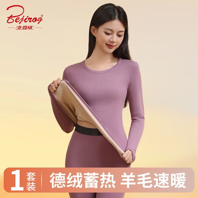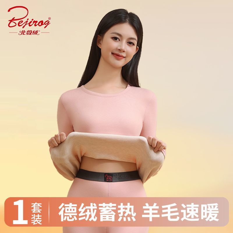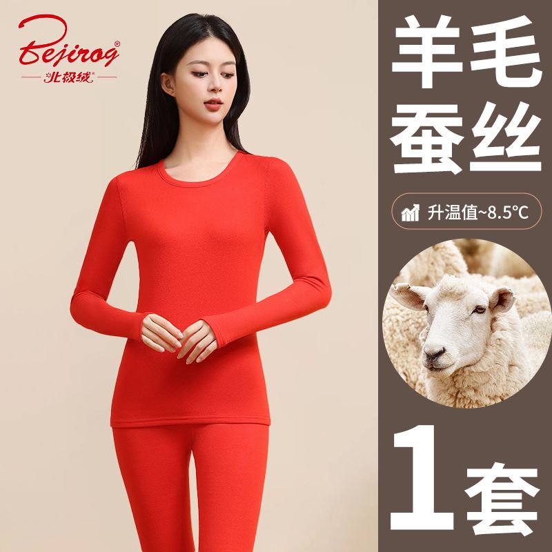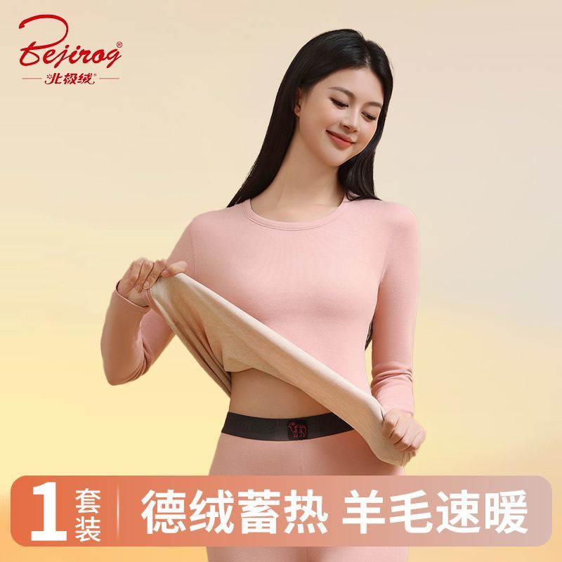 羊毛蚕丝园领保暖内衣双面德绒发热女款秋衣秋裤套装加绒加厚女士