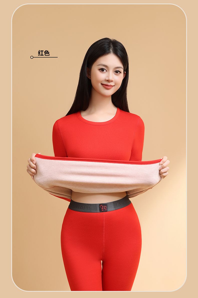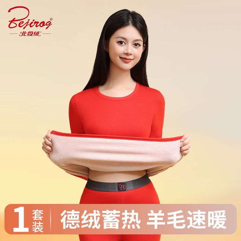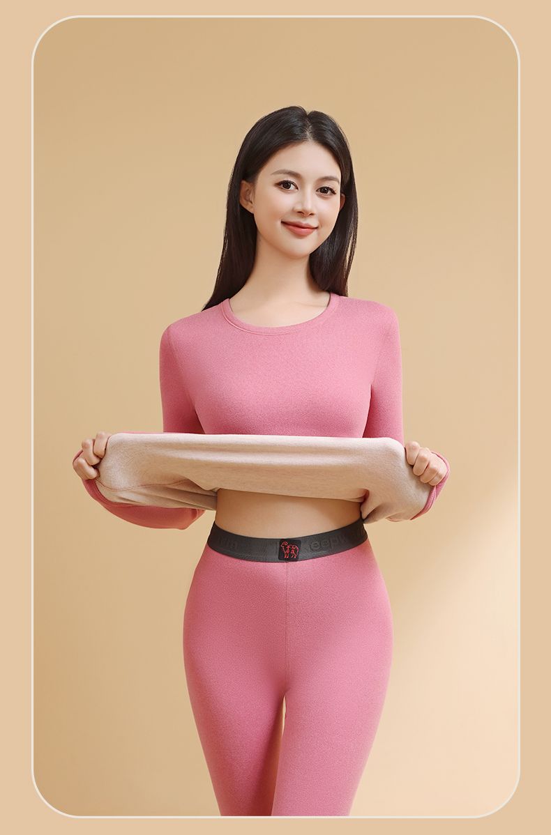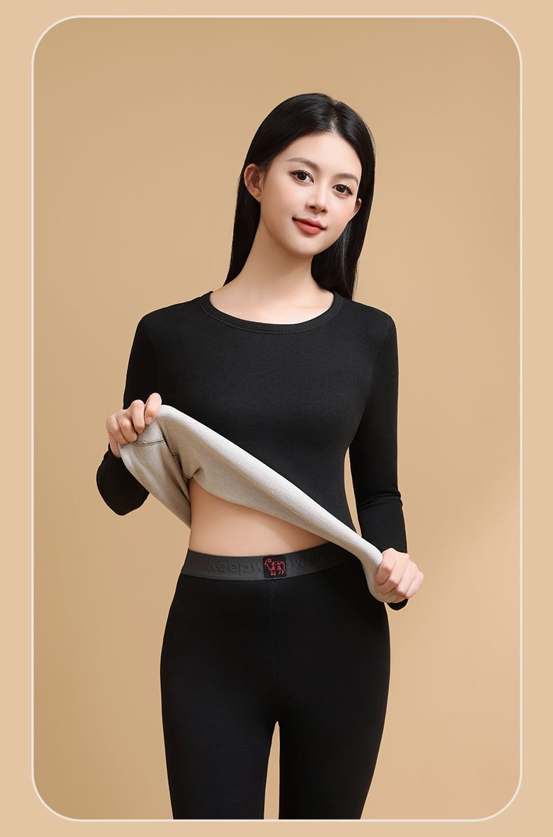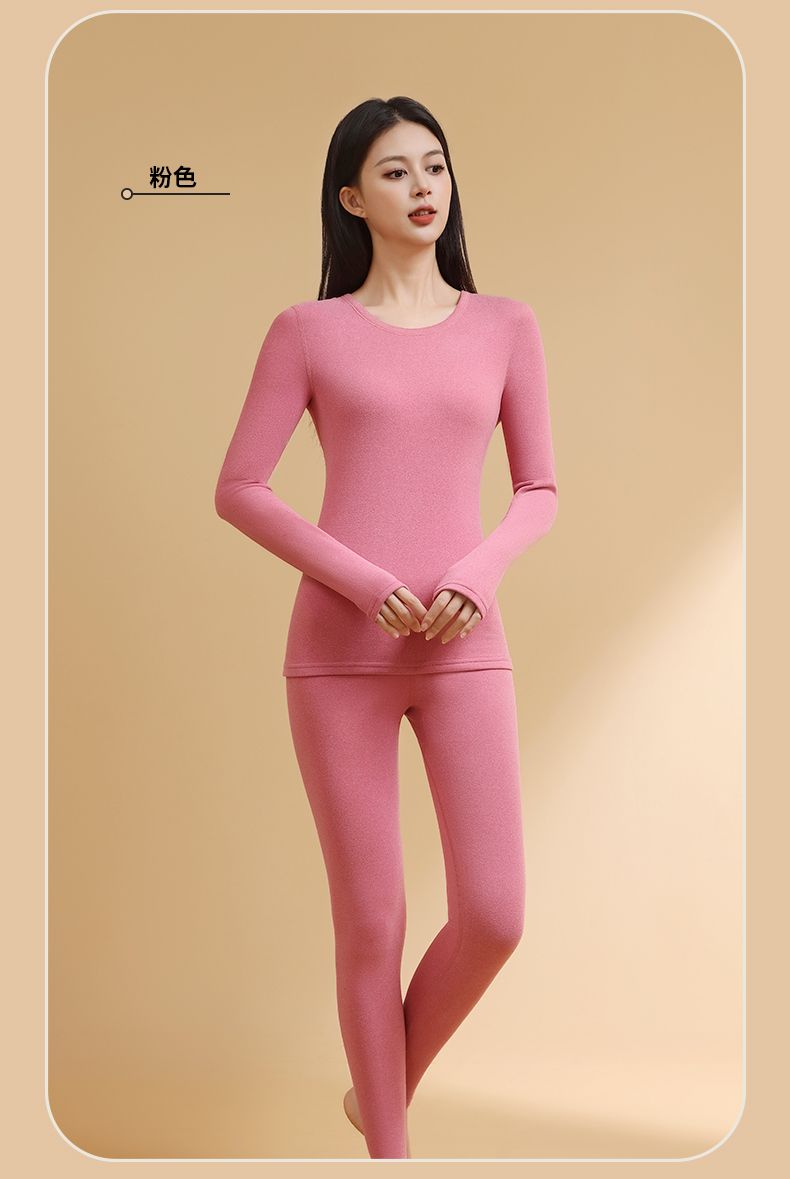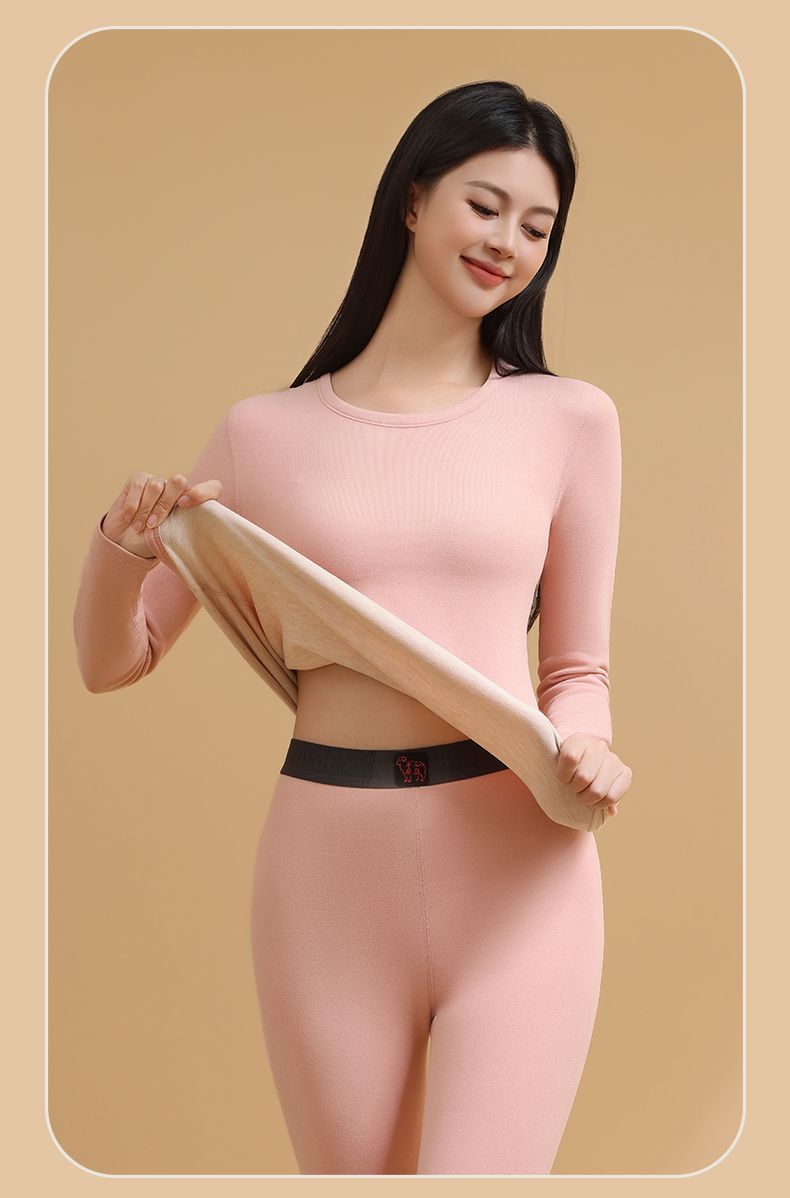 羊毛蚕丝园领保暖内衣双面德绒发热女款秋衣秋裤套装加绒加厚女士