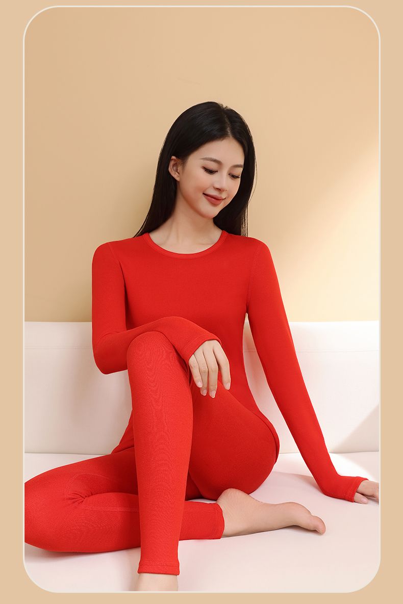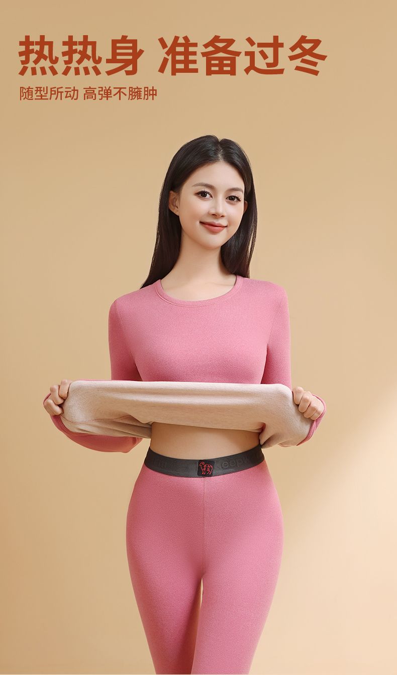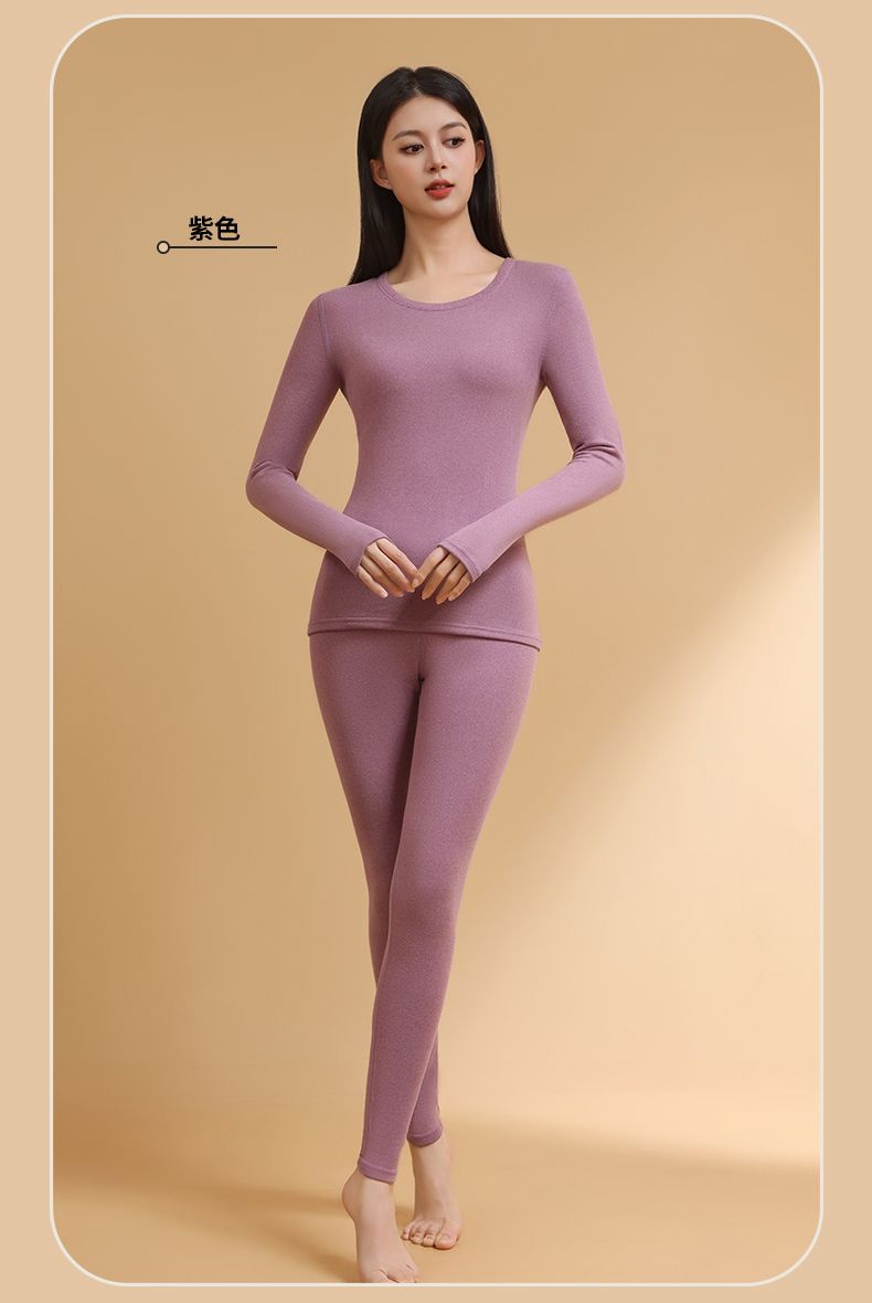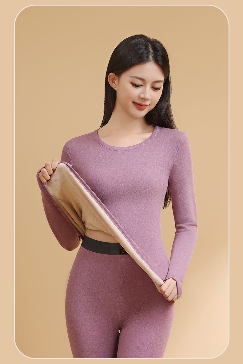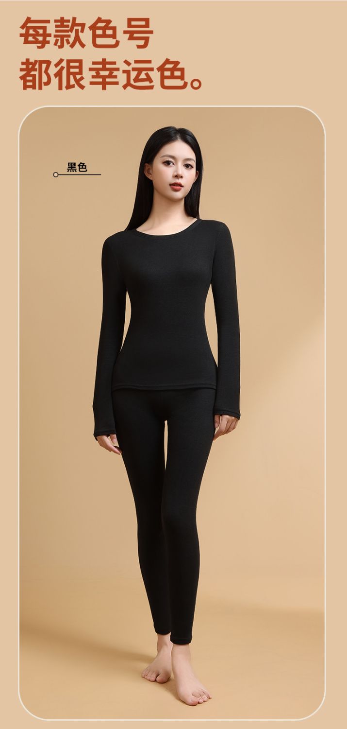 羊毛蚕丝园领保暖内衣双面德绒发热女款秋衣秋裤套装加绒加厚女士