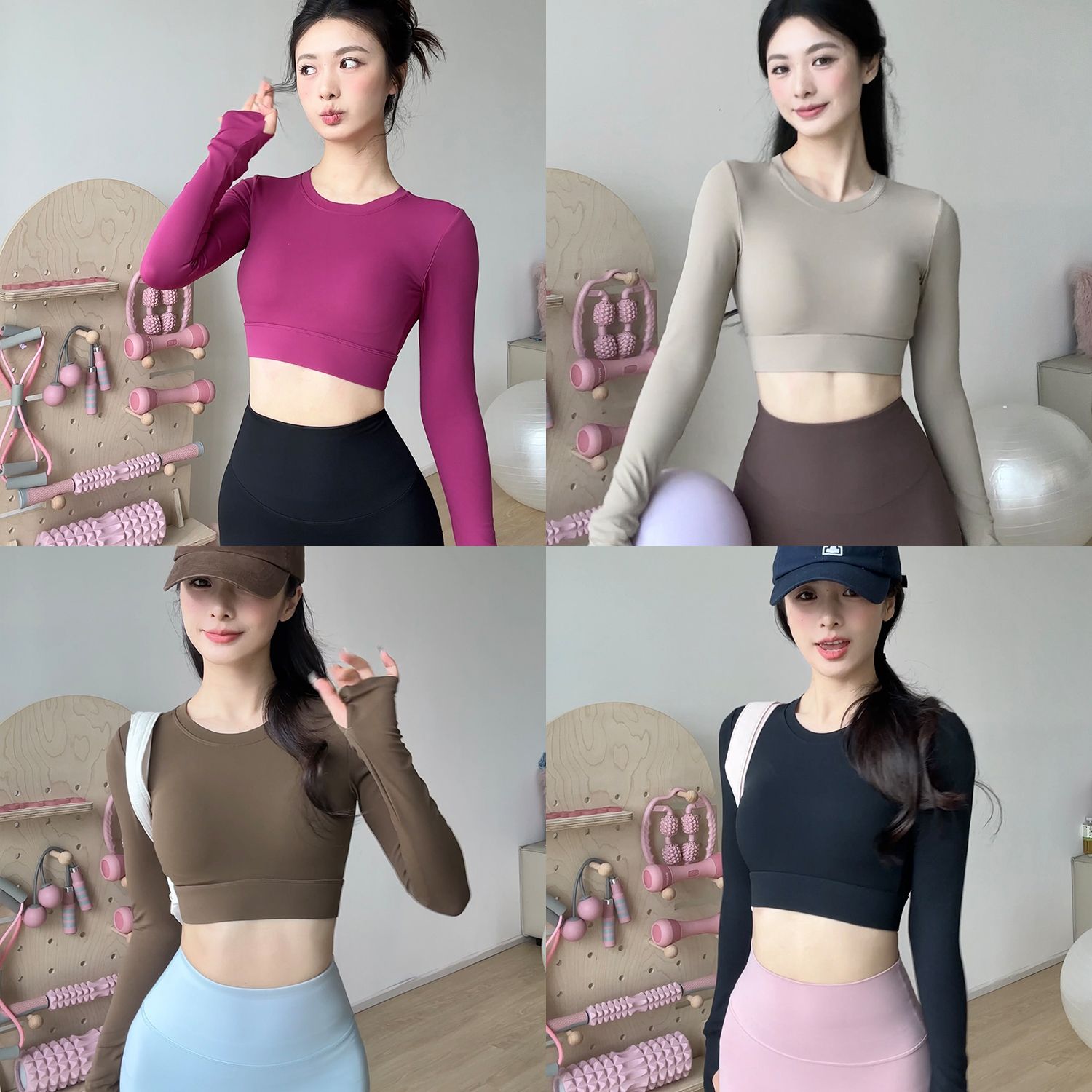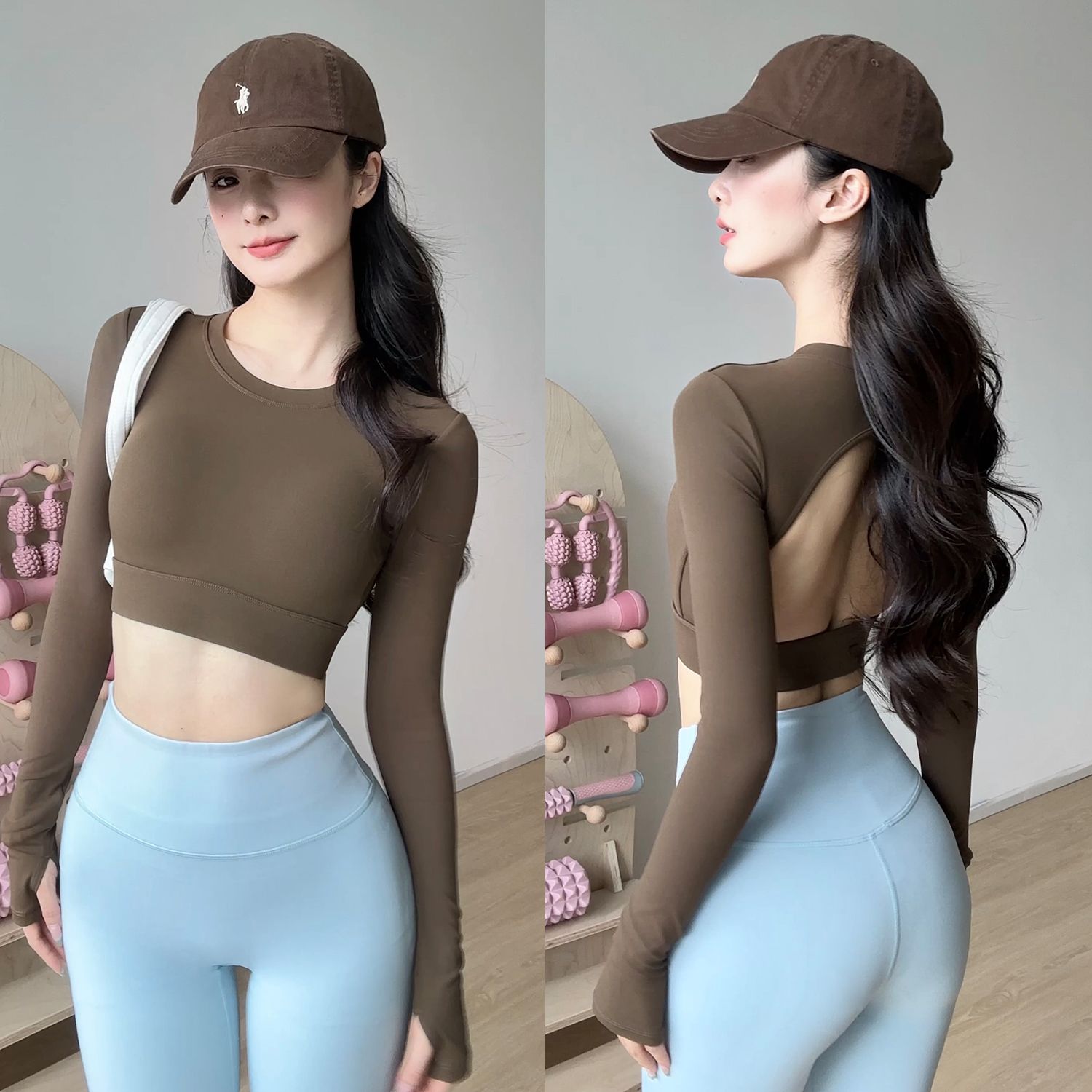 瑜伽服长袖修身短款T恤性感美背露背透气普拉提健身上衣女带胸垫